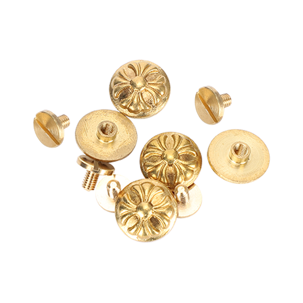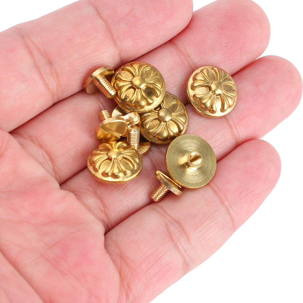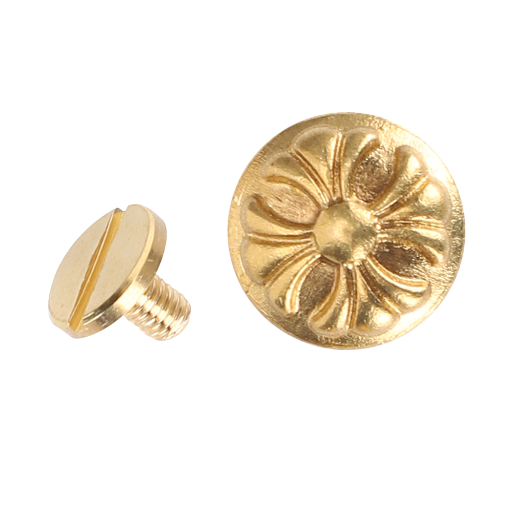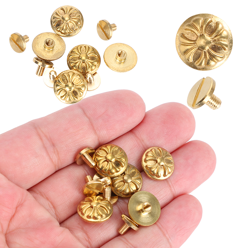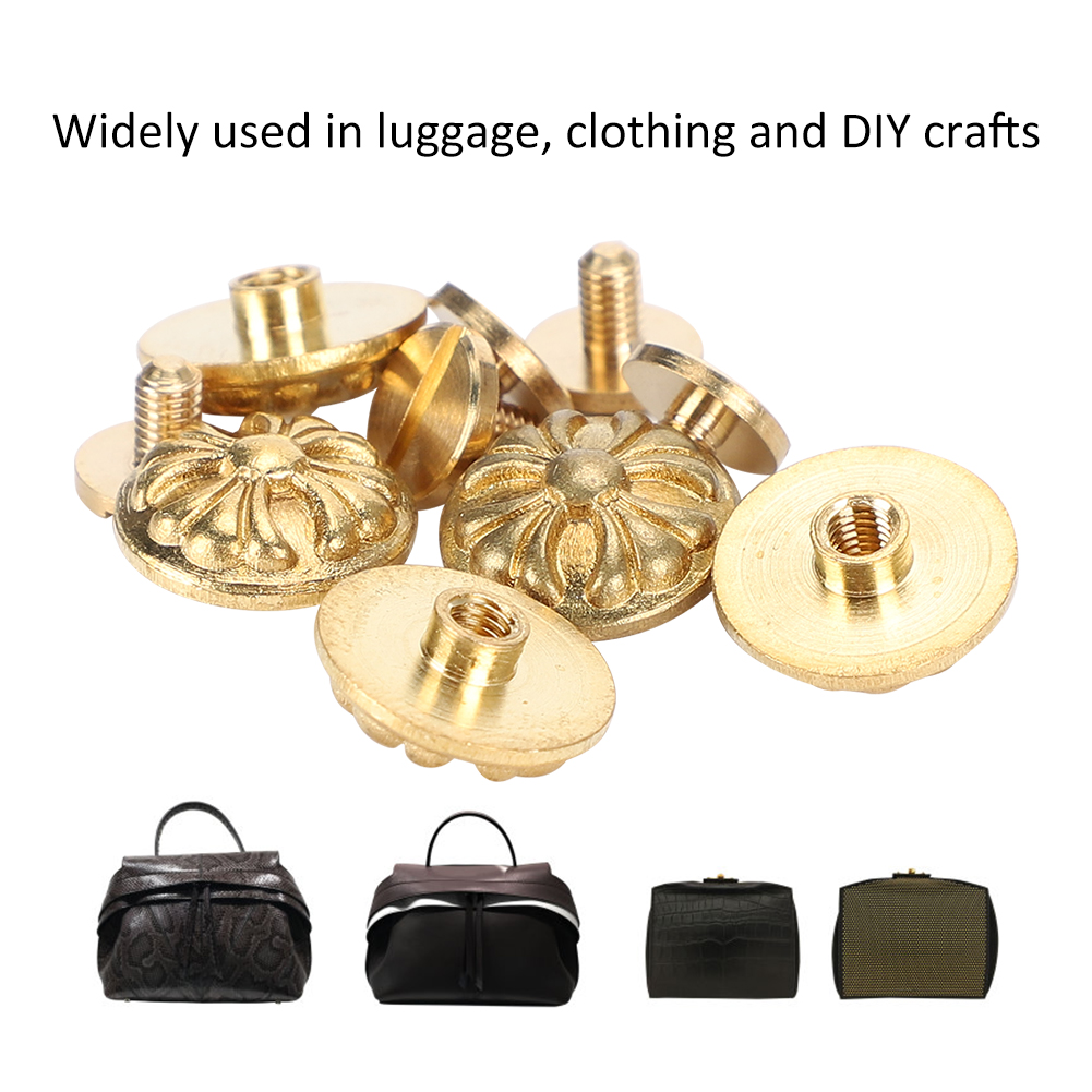 1、Simply make a slit with an awl or a chisel. Insert the screws down against the leather. 2、The brass color is bright, not easy to fade, equipped with screws for easy installation. 3、Excellent for mounting as ornamentation or trim of saddles, leather belts, bags, covers or any of your favorite leather accessories. 4、Manufactured from premium brass material, not easy to wear, strong and durable, will not fall off. 5、Chrysanthemum shape, elegant and versatile, widely used in luggage, clothing and DIY crafts.