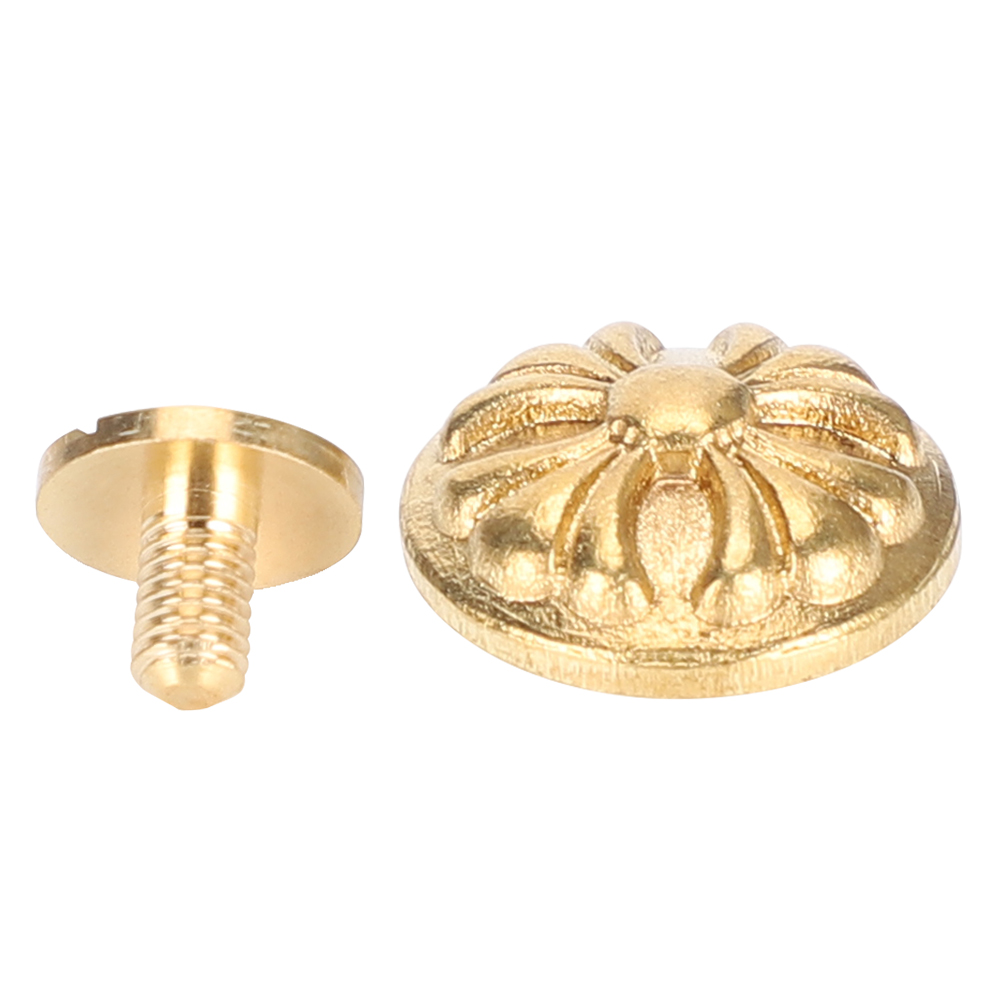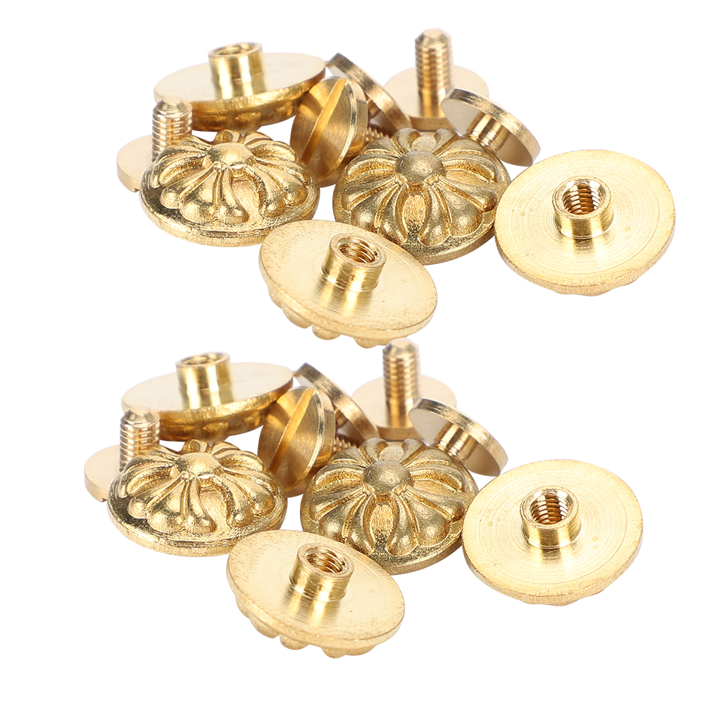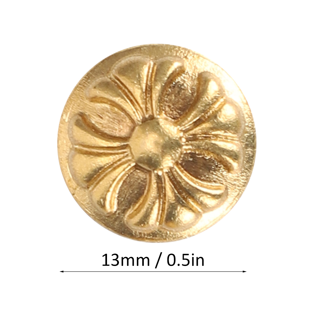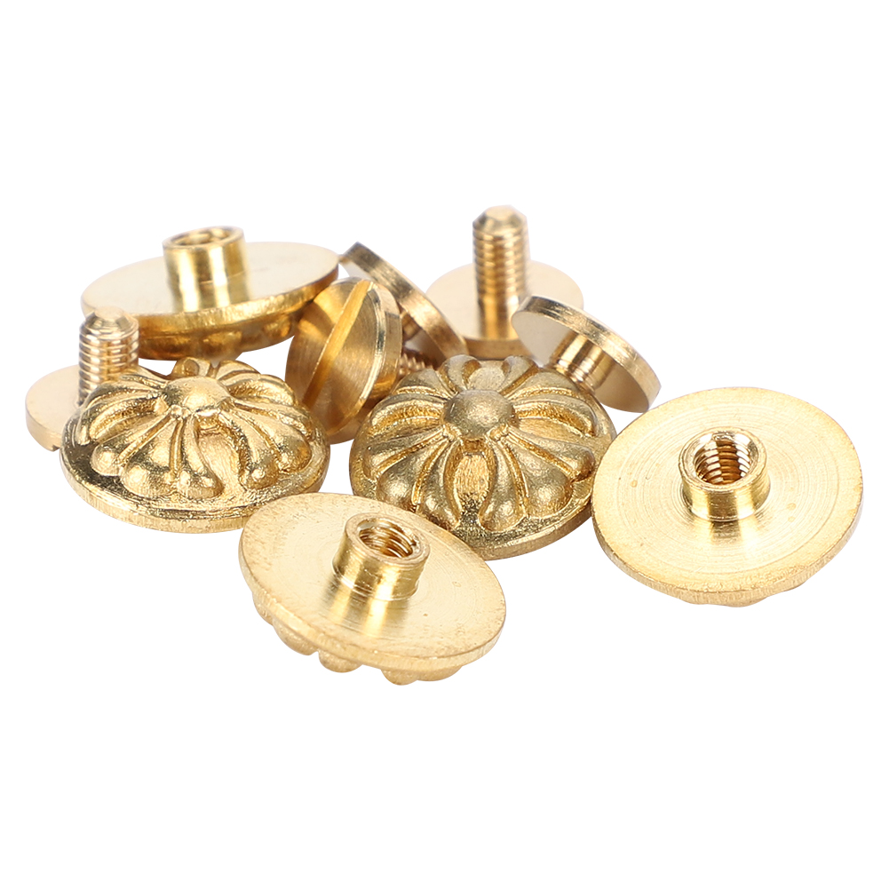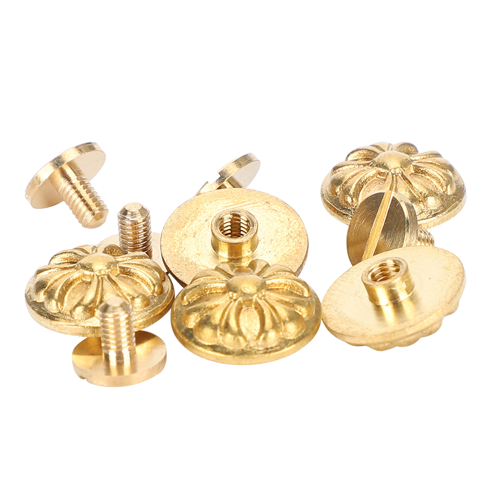 1、Simply make a slit with an awl or a chisel. Insert the screws down against the leather. 2、The brass color is bright, not easy to fade, equipped with screws for easy installation. 3、Excellent for mounting as ornamentation or trim of saddles, leather belts, bags, covers or any of your favorite leather accessories. 4、Manufactured from premium brass material, not easy to wear, strong and durable, will not fall off. 5、Chrysanthemum shape, elegant and versatile, widely used in luggage, clothing and DIY crafts.