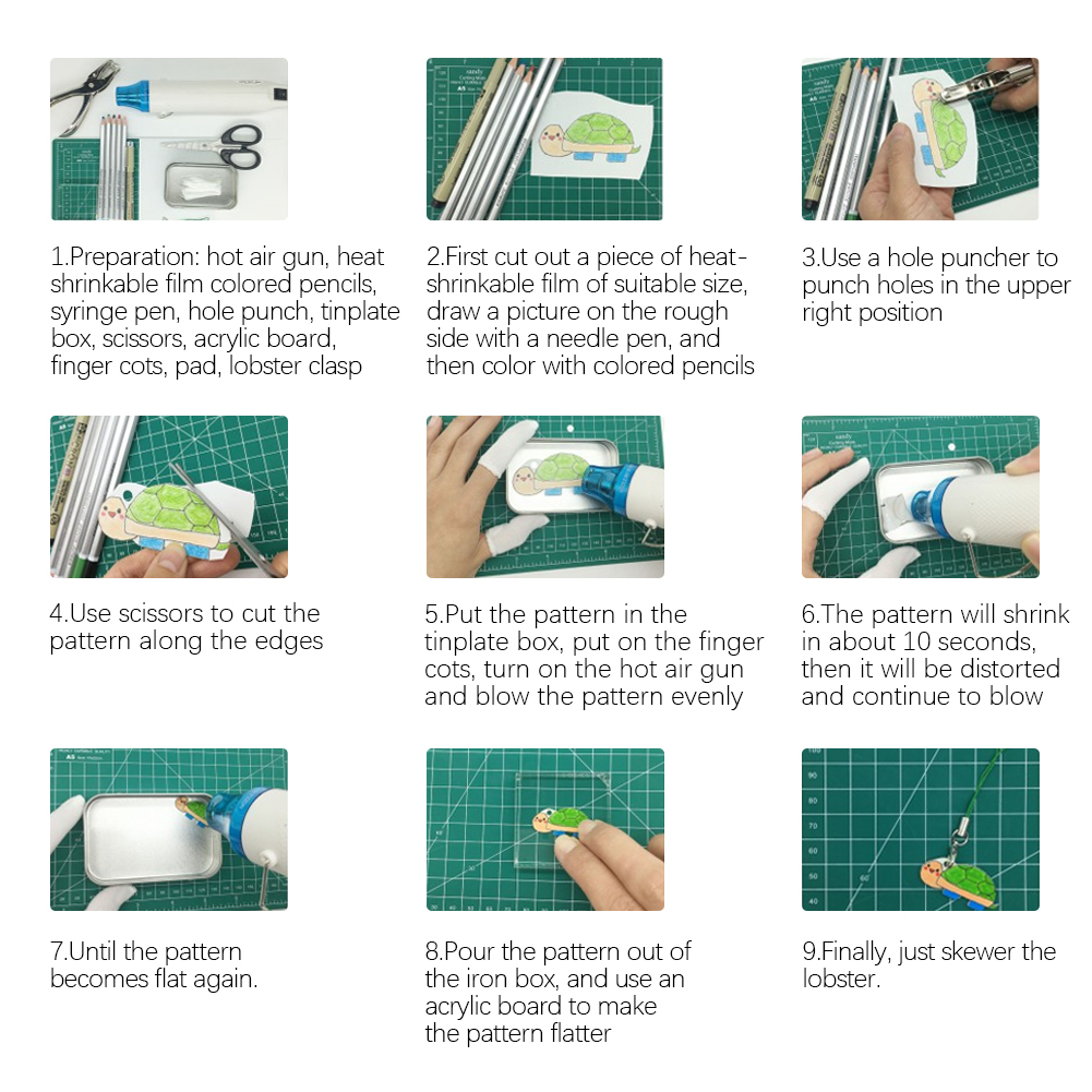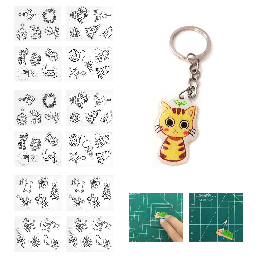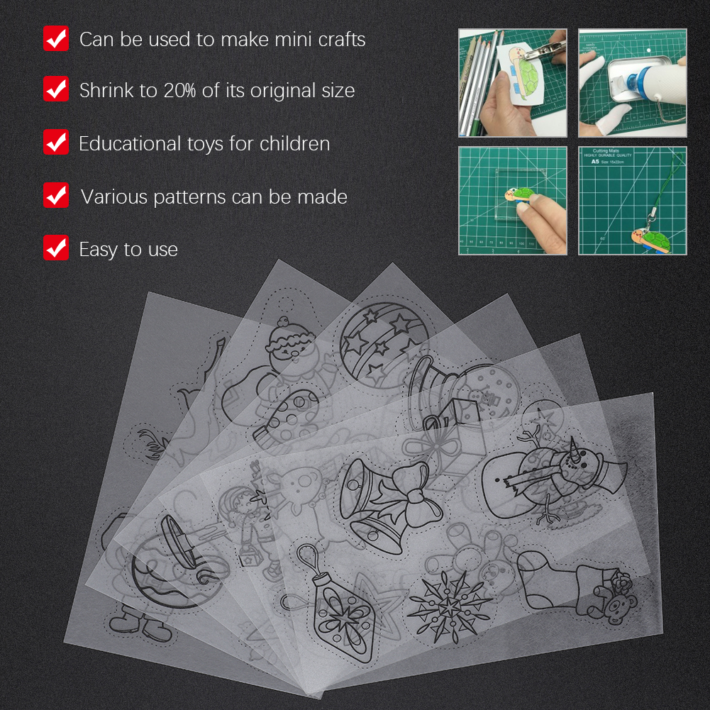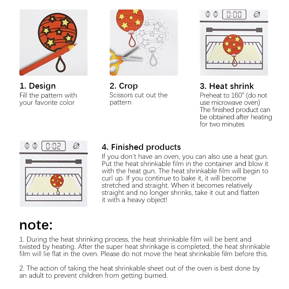 1、Can be used to make mini artwork, shrink film to 20% of its original size. 2、Various patterns can be made, suitable for making key chains, ornaments, toys or anything you can imagine. 3、Simple operation, just draw your favorite patterns, color them and cut them with scissors, and then they will shrink in the oven. 4、The educational toys for children can stimulate their creativity and exercise their hands‑on ability. 5、Using high‑quality materials, strong and durable, has a long service life.