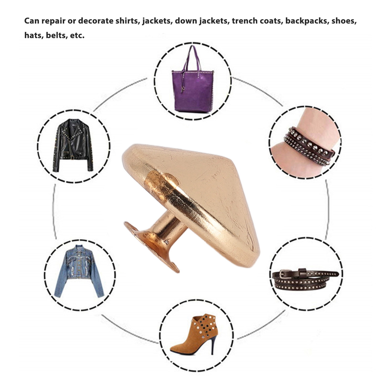 1、Durable Material: The leather rivets are made of electroplated iron, ensuring durability, rust resistance, and colorfastness. They will stay intact for a long time, even with regular use. 2、DIY Accessories: Perfect for DIY crafts, the leather rivets allow you to unleash your imagination and creativity. They provide endless possibilities for customization and personalization. 3、Wide Application: The rivets can be used to repair or decorate shirts, jackets, down coats, backpacks, shoes, hats, belts, and more. They add a stylish touch and a professional finish to any leather or fabric item. 4、Lightweight and Portable: With an 18mm size, the rivets are compact and lightweight, making them easy to carry around. You can conveniently have them on hand for any on the go repairs or embellishments. 5、Packing List: Each set includes 100 mushroom rivets and 100 pronged studs, providing you with ample quantities for your daily needs.