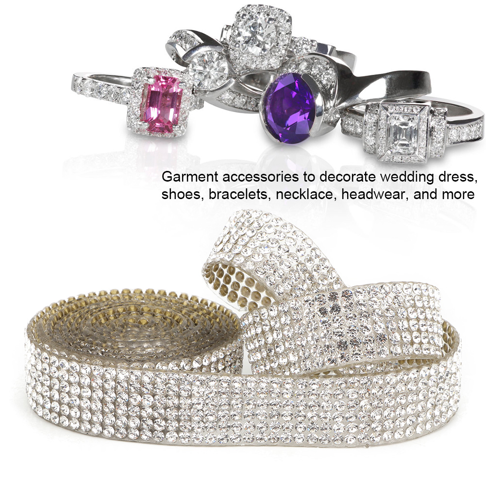 1、1. This beautiful rhinestones banding is sure to make you become the center of attention. 2、2. Exquisite craftsmanship creates the most beautiful accessories, showing more noble temperament and grade. 3、3. Made from high quality material for maximum durability, beautiful and fashion. 4、4. It has hot melt adhesive on the back, if you want to attach it very stably, hand sewing after ironing is a better choice. 5、5. Garment accessories to decorate wedding dress, shoes, bracelets, necklace, headwear, and more.