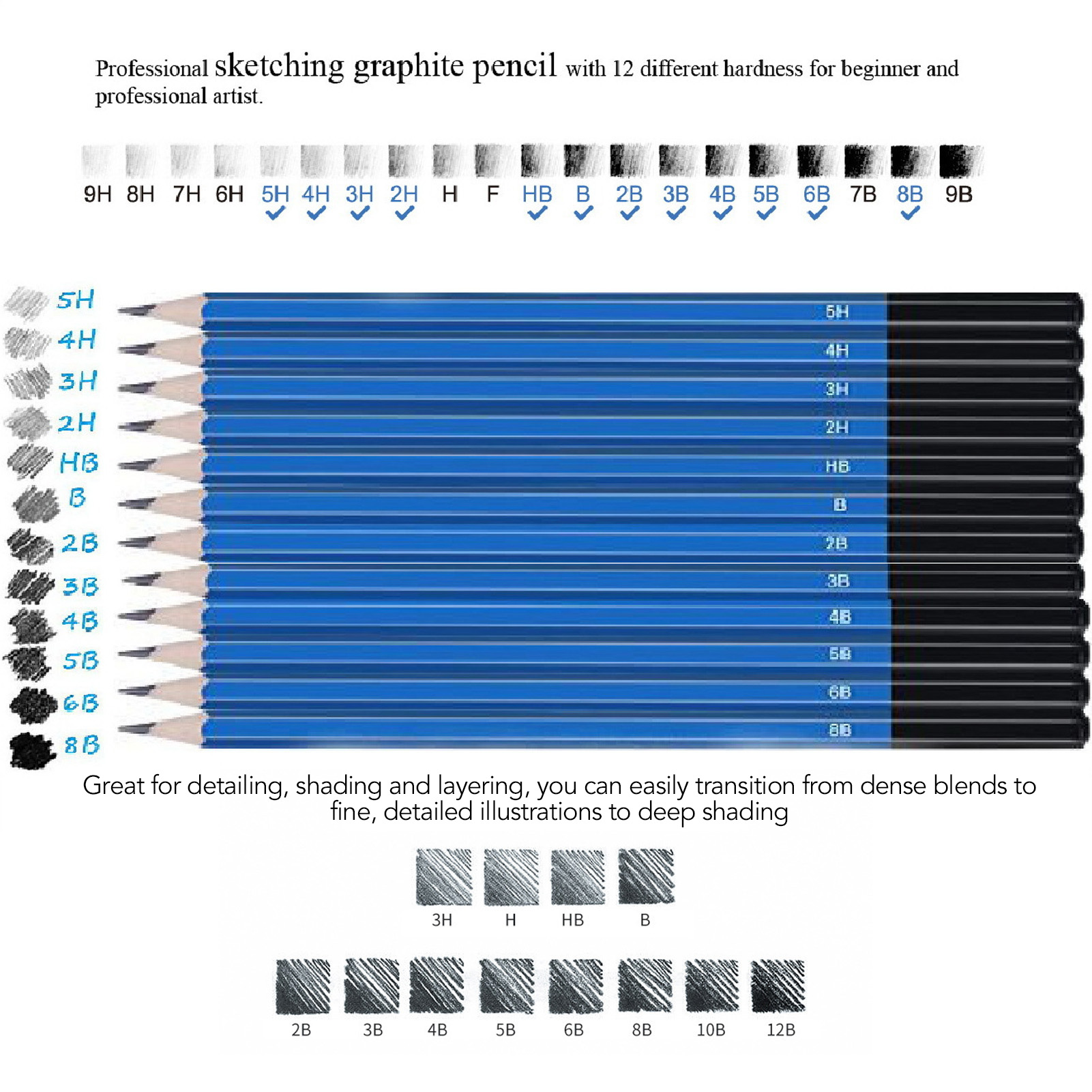 1、Eco Friendly Materials: Sketch pencils are made of natural eco friendly materials, the pencil core is more glossy, durable, break resistant, easy to sharpen and erase, ideal for graphic designers, drafts and real sketching. 2、Fine Use: The Drawing pencils kit is great for detailing, coloring and layering, and you can easily transition from dense blends to fine, detailed illustrations to deep coloring. 3、For People: This drawing kit can meet all your needs, whether you are a child or an adult, a hobbyist or a professional painter who loves to draw, you can take this art kit anywhere for sketching, coloring or painting. 4、Portable: Drawing tools come in blister packs, you can take them with you when you travel, all your art tools are organized and well protected. 5、Perfect Gift: Drawing supplies are great for holiday gifts such as Christmas, Thanksgiving, Birthdays, Back to School, New Years, Valentine's Day and Easter etc.