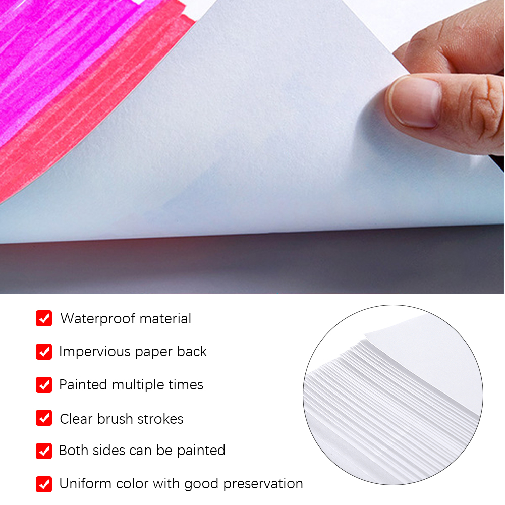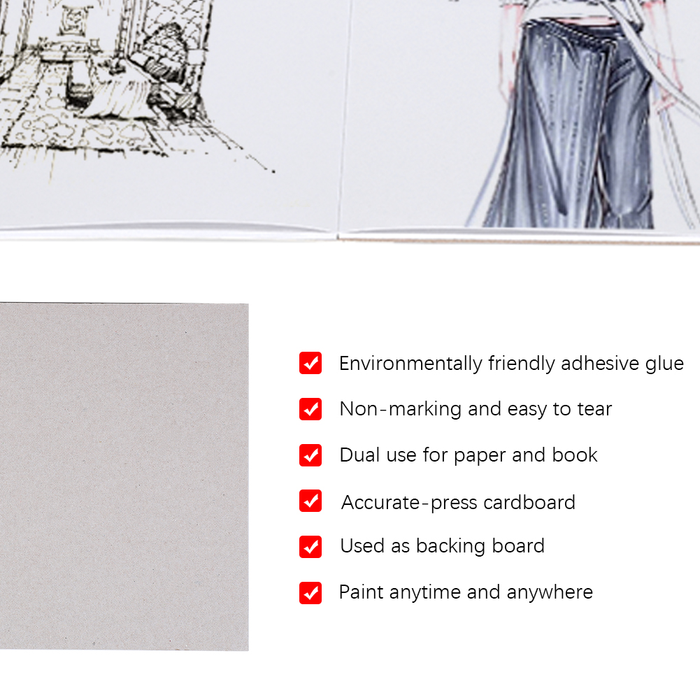 1、The back of paper is impervious because the layer using waterproof material, which can be painted multiple times 2、Both sides can be painted, the color is uniform with good preservation and the brush strokes are clear 3、Environmentally friendly adhesive glue is non‑marking and easy to tear, dual use for paper and book 4、The accurate‑press cardboard on the back can be used as a backing board, which make you to paint anytime and anywhere without relying on an easel 5、Can be used for animation, interior and clothing designs, suitable for daily painting, carrying out, painting and sketching, etc.