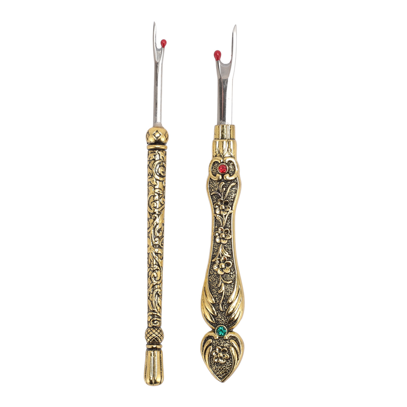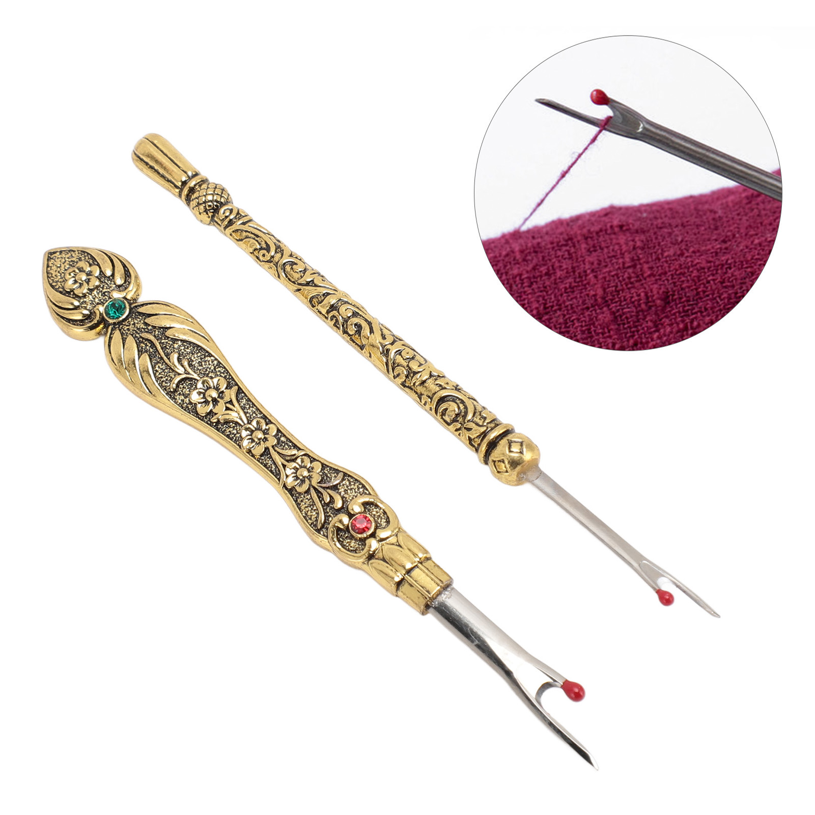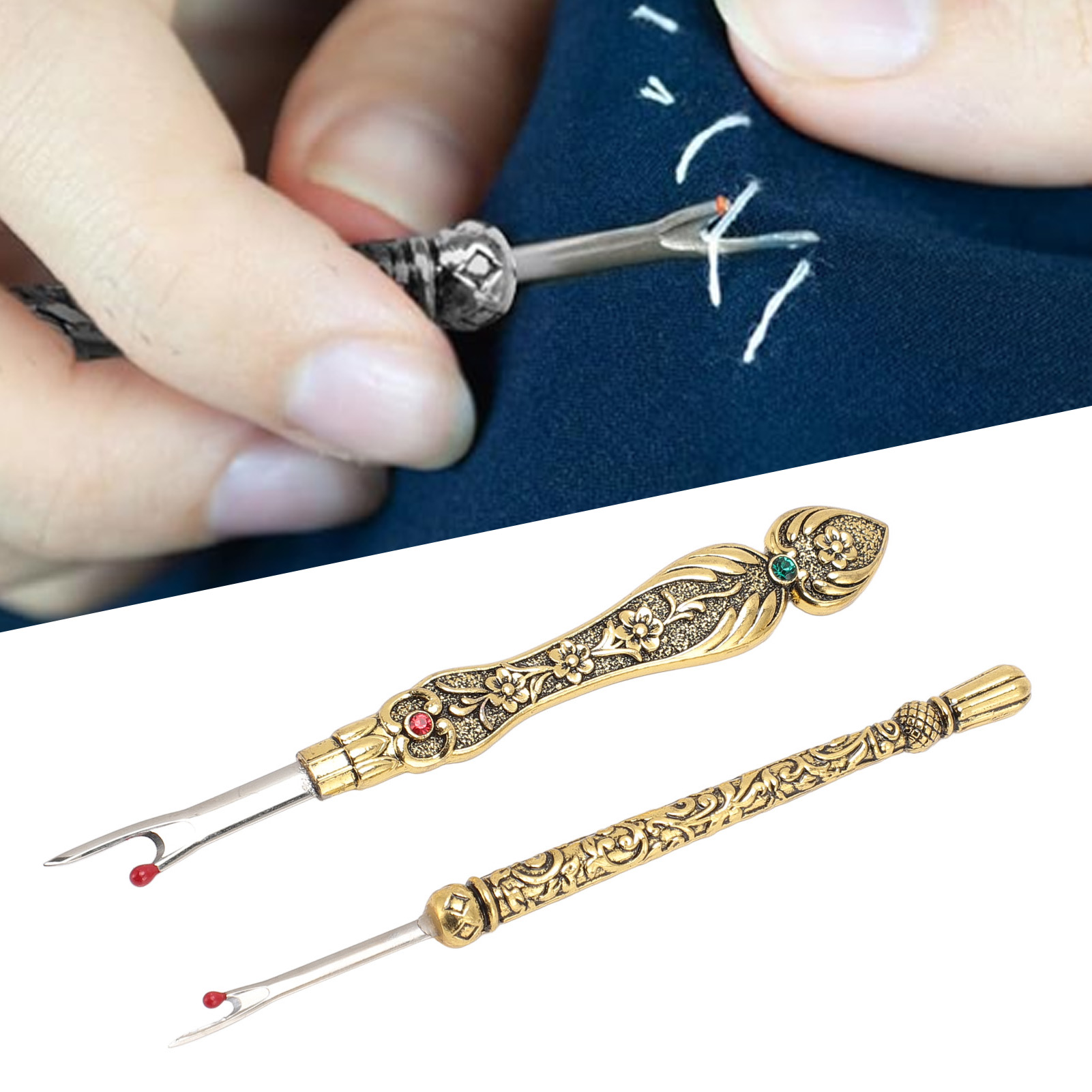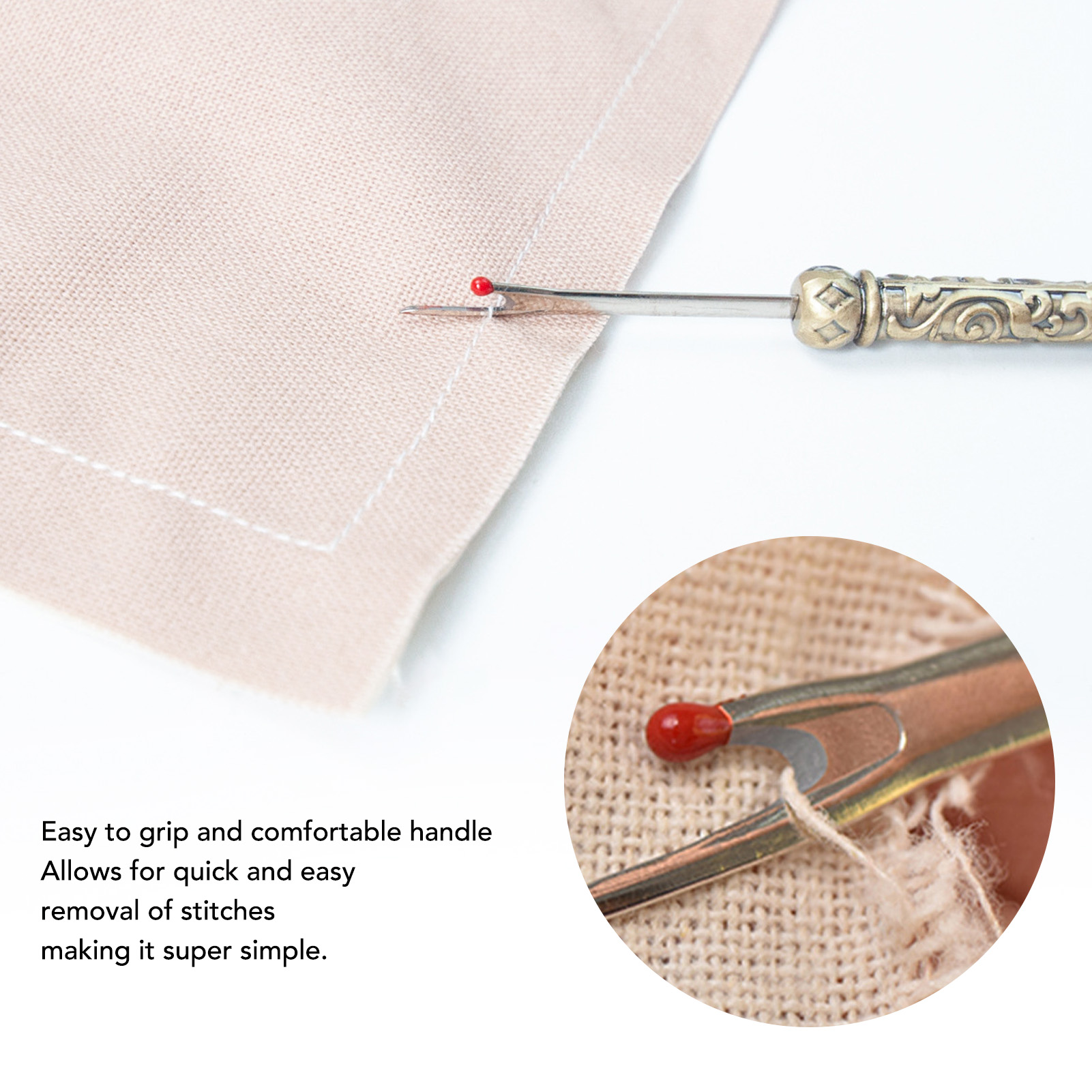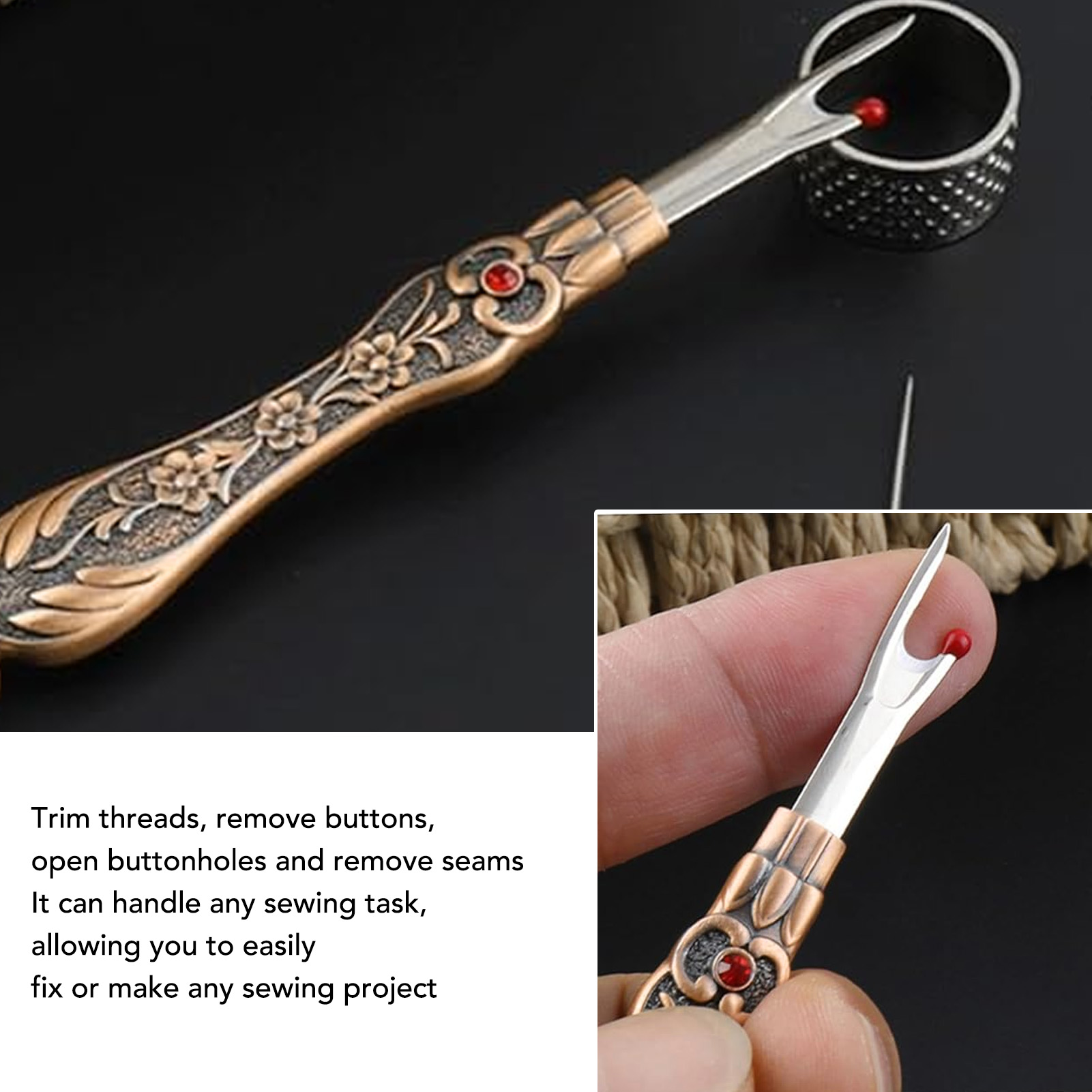 1、EASY TO REMOVE: Not only is it easy to use, but it also has an easy to grip and comfortable handle that makes it super simple to remove stitches quickly and easily. 2、VINTAGE DESIGN: The Seam remover tool features a vintage design with an exquisitely detailed 3D pattern on the handle, which is not only practical but also a lovely addition to your sewing collection. 3、SAFE TO USE: The Thread remover has a mini red ball on the end to defend the fabric from accidental damage. 4、CONVENIENT TOOL: Hand stitch remover is a handy tool for trimming threads, removing buttons, opening buttonholes and removing seams, it can handle any sewing task, allowing you to easily fix or make any sewing project. 5、WIDE APPLICATIONS: Vintage sewing seam remover is suitable for a wide range of applications including needlework, sewing, leatherwork and DIY crafts. This is a must have tool for any sewing enthusiast.
