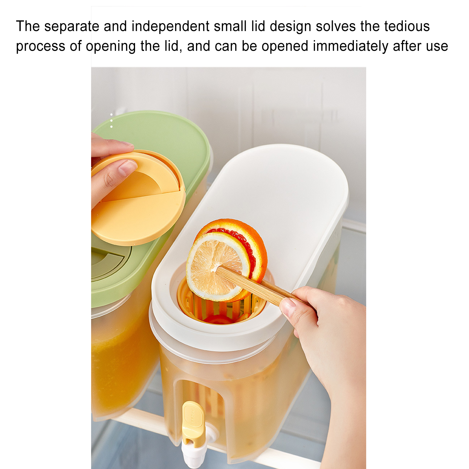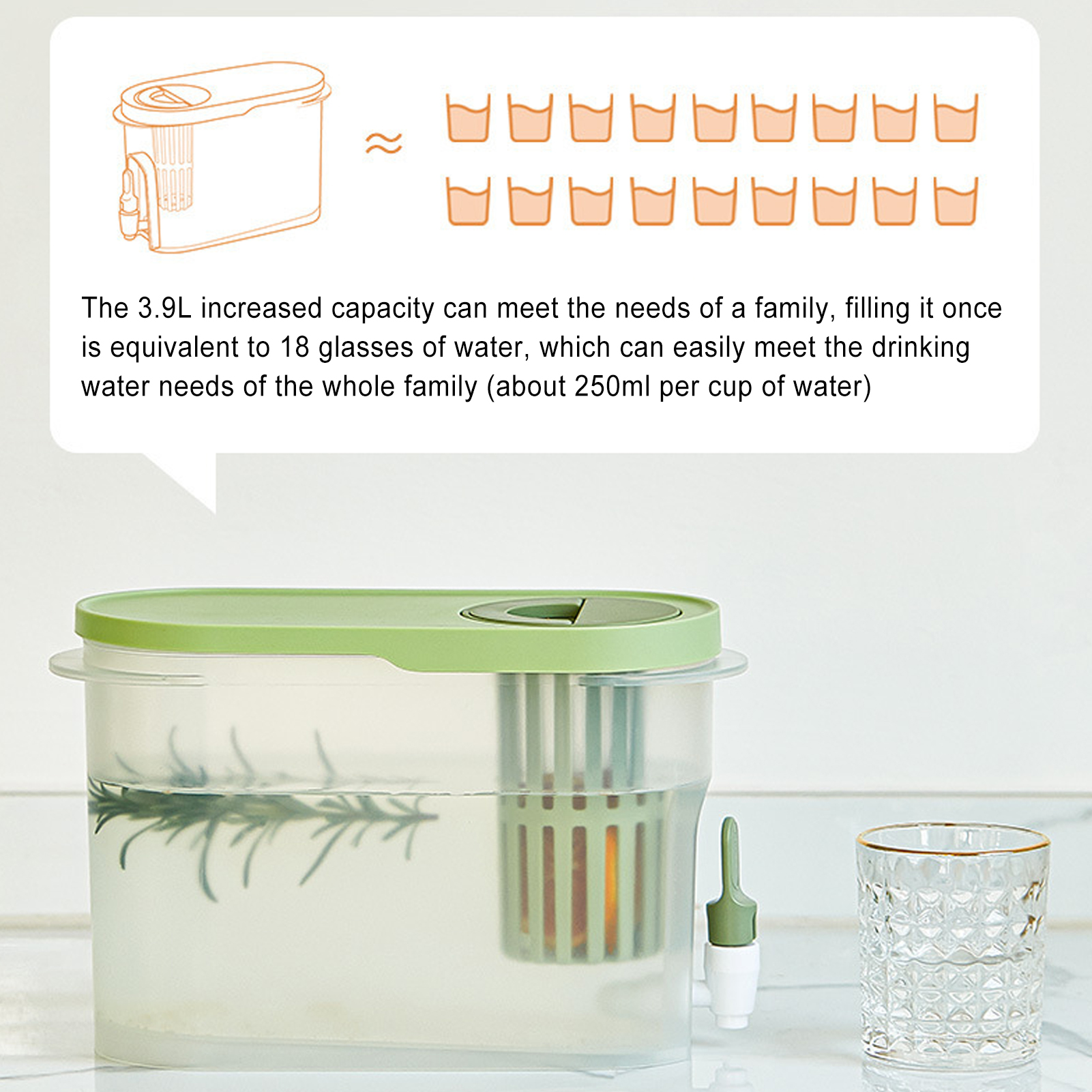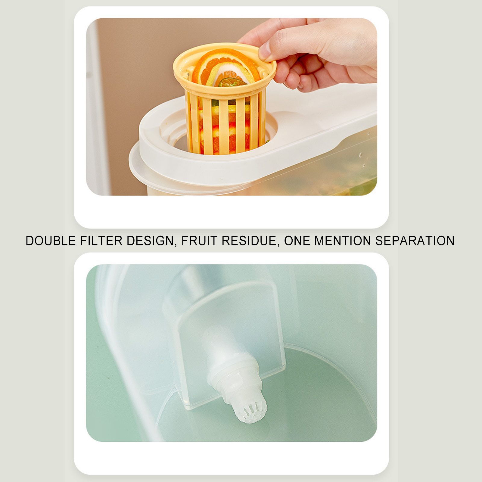 1、Large Capacity: Plastic cold kettle 3.9L increased capacity, filled once, equivalent to 18 cups of water, easily meet the drinking water needs of the whole family (about 250ml per cup of water). 2、Double Filtration: 3.9L water jug with faucet adopts double filtration design, which can effectively filter fruit residues, reduce clogging, press the faucet, and it is more convenient to use. 3、Space Saving: Cold kettle adopts a narrow body design, which saves space and can be used as an exclusive water dispenser in the refrigerator. Reasonable slope design, inclined bottom surfaces, easy to drain. 4、PP Material: 3.9L cold kettle with faucet is made of PP material, which can withstand temperature changes from ‑20°C to 120°C without fear of temperature difference, and can directly pour boiling water. 5、Silicone Rings: The drink dispenser is equipped with a double layer silicone ring, and the upper cover has a silicone ring, which has dual functions of locking the taste and keeping it brisk, and keeps it in the refrigerator without odor.