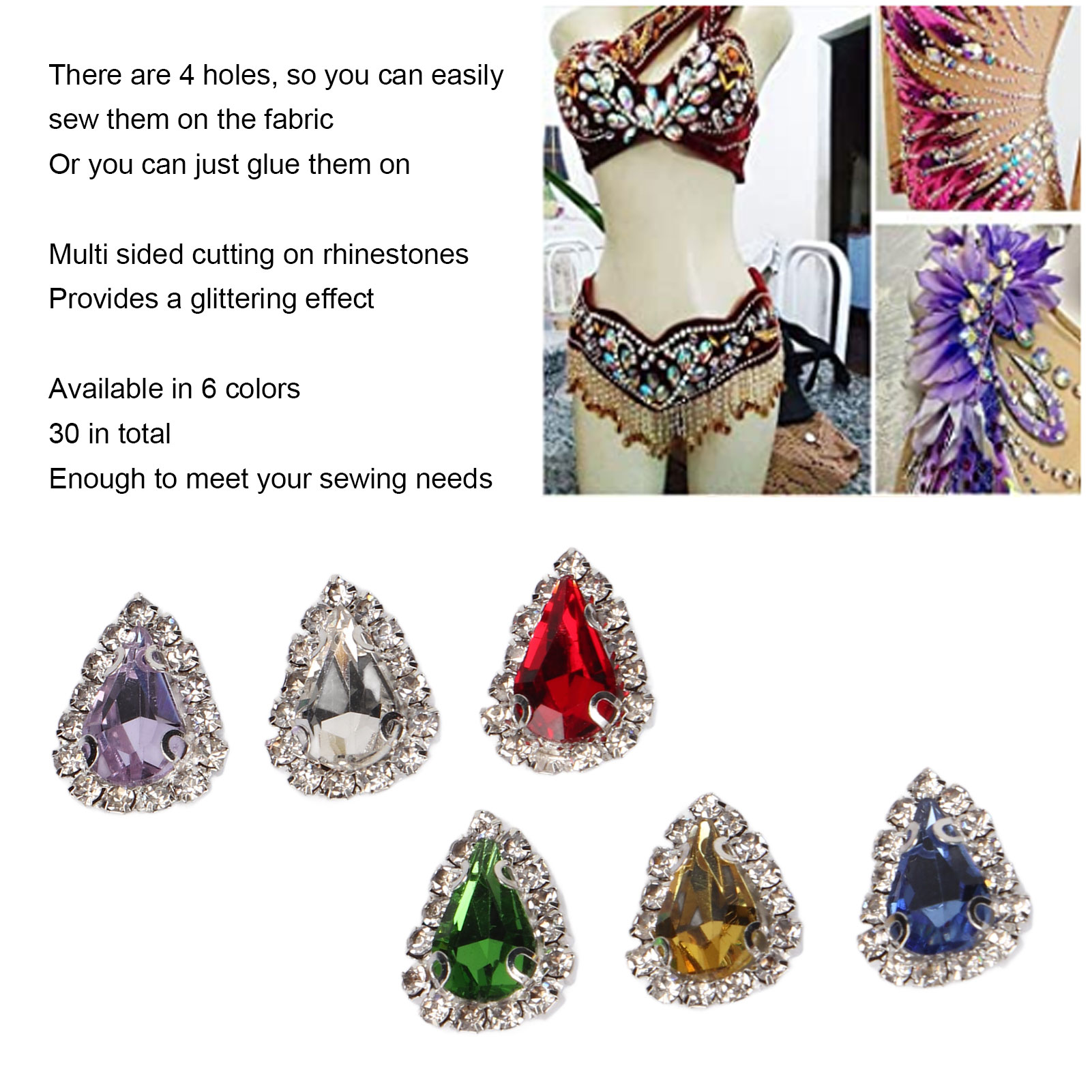1、Glittering Effect: The stitching on the rhinestones is cut on multiple sides to provide a glittering effect that will make you look attractive when sewn. 2、6 Colors: 30 pieces in total, 6 colors, sufficient quantity to meet your sewing needs and embellish your DIY crafts. 3、With 4 Holes: These shapes have 4 holes, allowing you to easily sew them onto fabric, or you can glue them directly onto them for a delicate accessory. 4、Application: Claw rhinestones are suitable for decorating all kinds of parties, events, weddings, festivals, decorating your DIY crafts, clothes, bags, shoes and any other decorative crafts. 5、Holiday Gift: Small and lightweight, easy to carry and store, a perfect holiday gift for your craft loving friends and family.