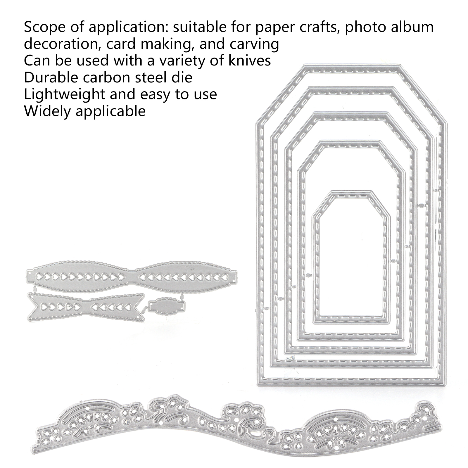 1、Made of flexible carbon steel, with the characteristics of sturdiness, durability and lightness, easy to use 2、Simple and practical, the die cuts can be used directly with a variety of knives to engrave ideal cards 3、Bring unique decorations to your scrapbooks, greeting cards, invitation cards, photo albums, gifts, home and parties 4、Suitable for paper crafts, photo album decoration, card making, to meet your needs and enjoy the happy experience of DIY 5、For cutting paper and other materials, and can be used with most major brands of die cutting machines
