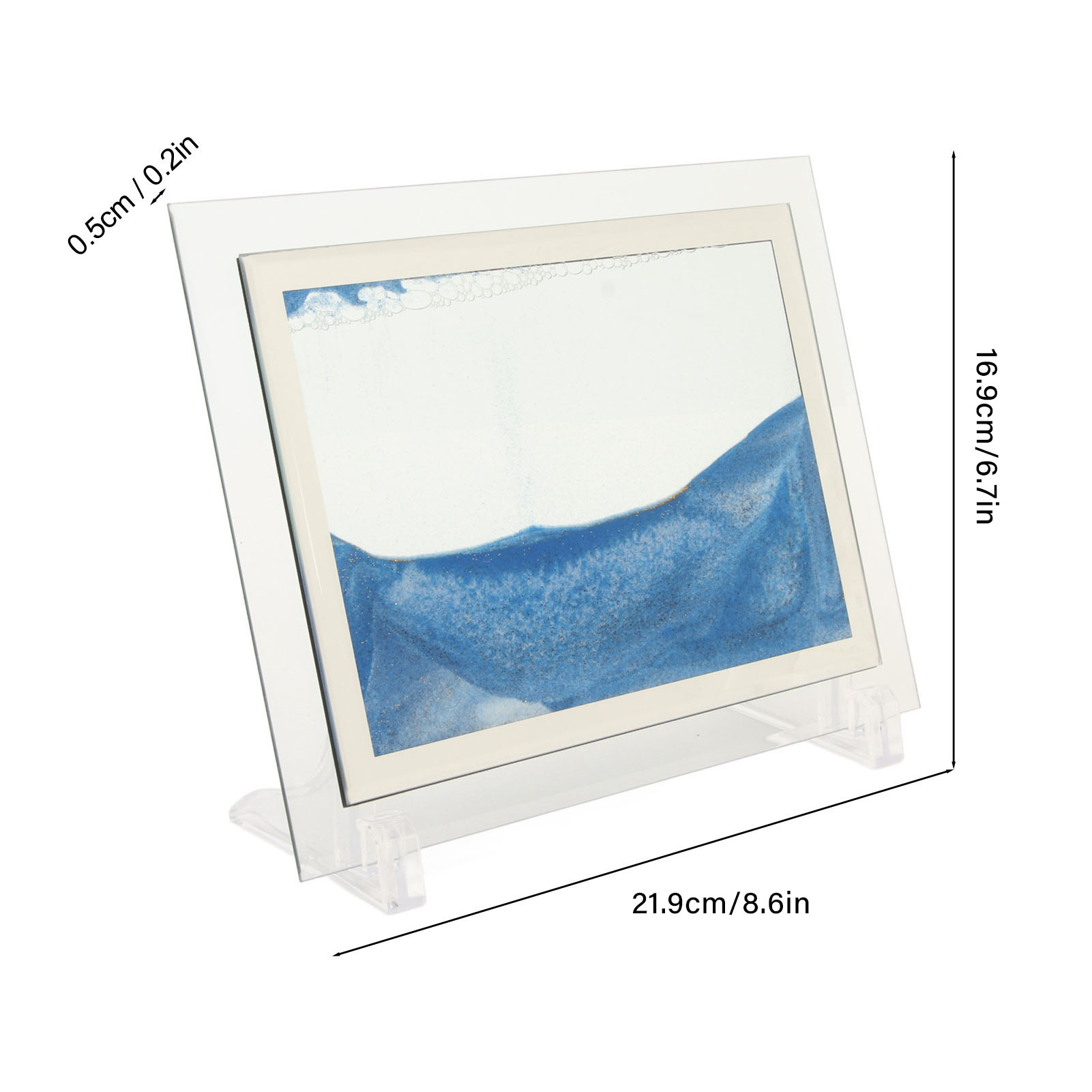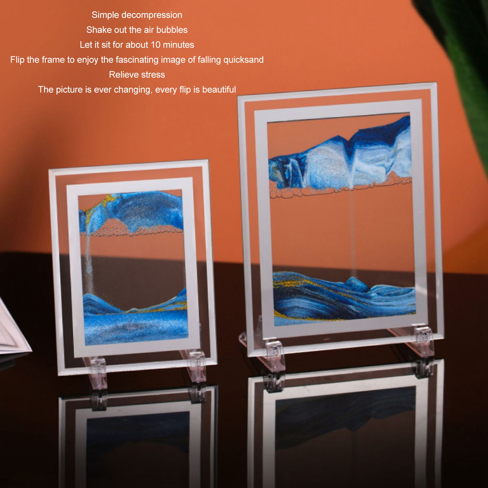 1、EXQUISITE: This quicksand painting changes with each turn, as the quicksand slowly flows down, and the falling of the quicksand forms a charming picture. 2、STRESS RELIEF: The colorful sand falls slowly, changing different scenes, relieving stress, relaxing your eyes and developing patience. 3、VIBRANT COLORS: Three dimensional sand painting with vibrant colors and delicate quicksand, with 2 stands, can be placed vertically or horizontally. 4、APPLICABLE PEOPLE: Sand art liquid motion is perfect for office workers, students, art creators and people who use computers for a long time. 5、APPLICABLE SCENES: 3D quicksand decor is perfect for decorating your desk, bookshelf and counter to brighten up your life.