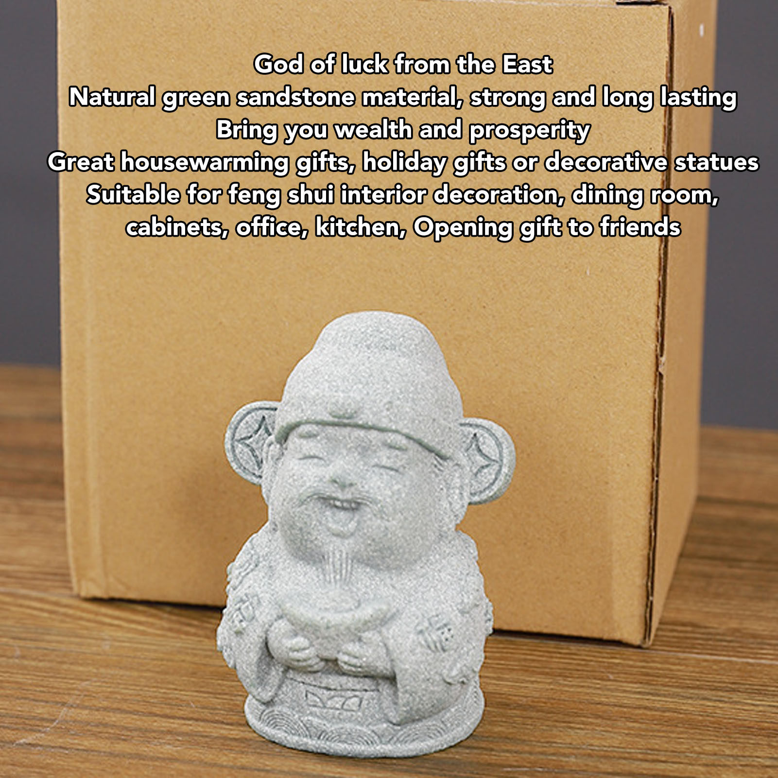 1、LUCKY ORNAMENT: The god of luck from the East. It is said that can make your wealth more and more and make your business better. Natural green sandstone material, strong and long lasting 2、NICE GIFT: Having a Chinese god statue in your home or office can bring you wealth and prosperity and make great housewarming gifts, holiday gifts or decorative statues 3、ELEGANT DECOR: Chinese god decor is suitable for feng shui interior decoration, dining room, cabinets, office, kitchen, can be used as an opening gift to friends 4、SYMBOL OF PROSPERITY: The oldest and most popular god of wealth and blessing, symbolizing great wealth and blessing, symbolizing that all things will succeed, symbolizing that wealth will be protected 5、WIDE APPLICATION: Lucky ornament can be used in Chinese tea pet ornament, home living room tea table ornament, fish tank micro landscape props, outdoor statues, and arts and crafts decoration