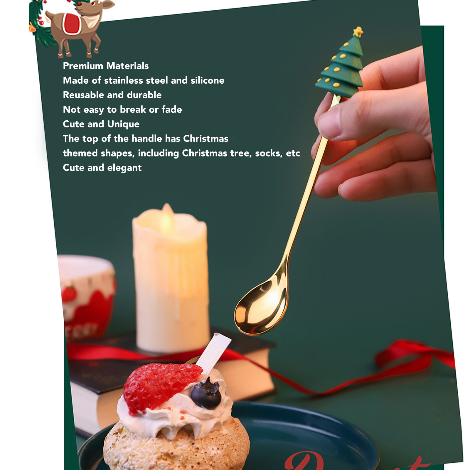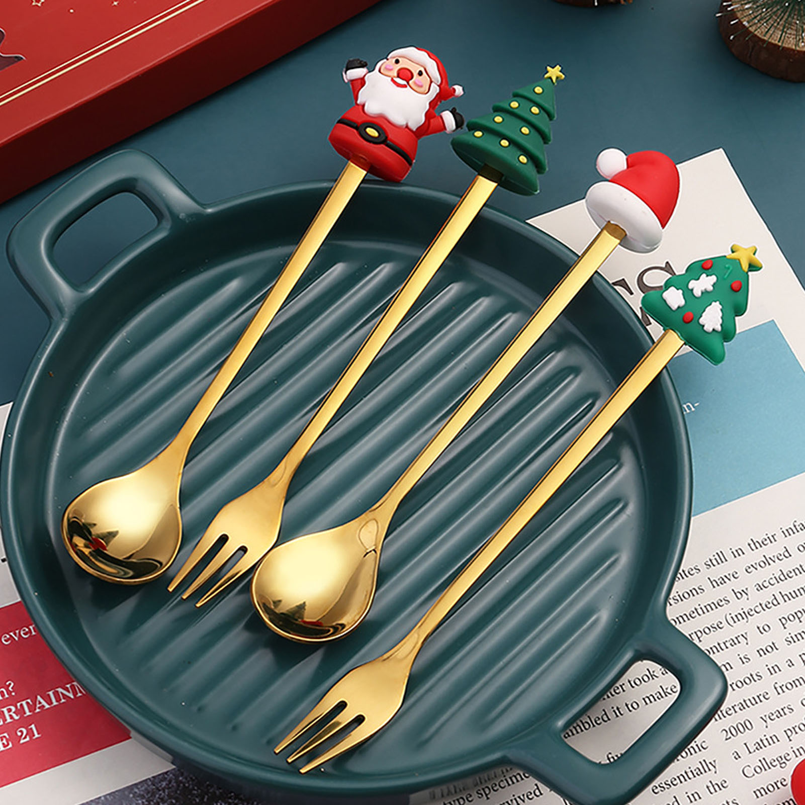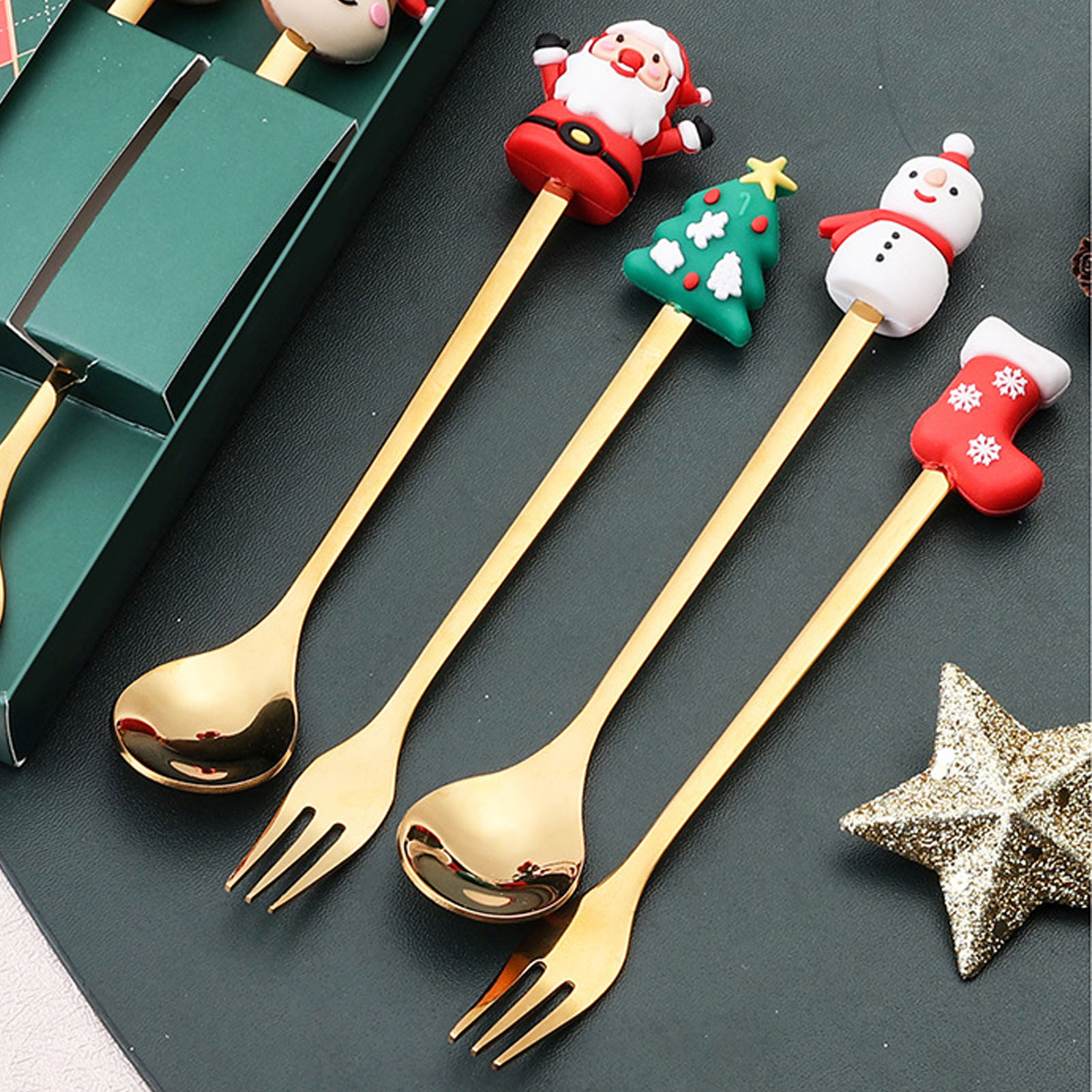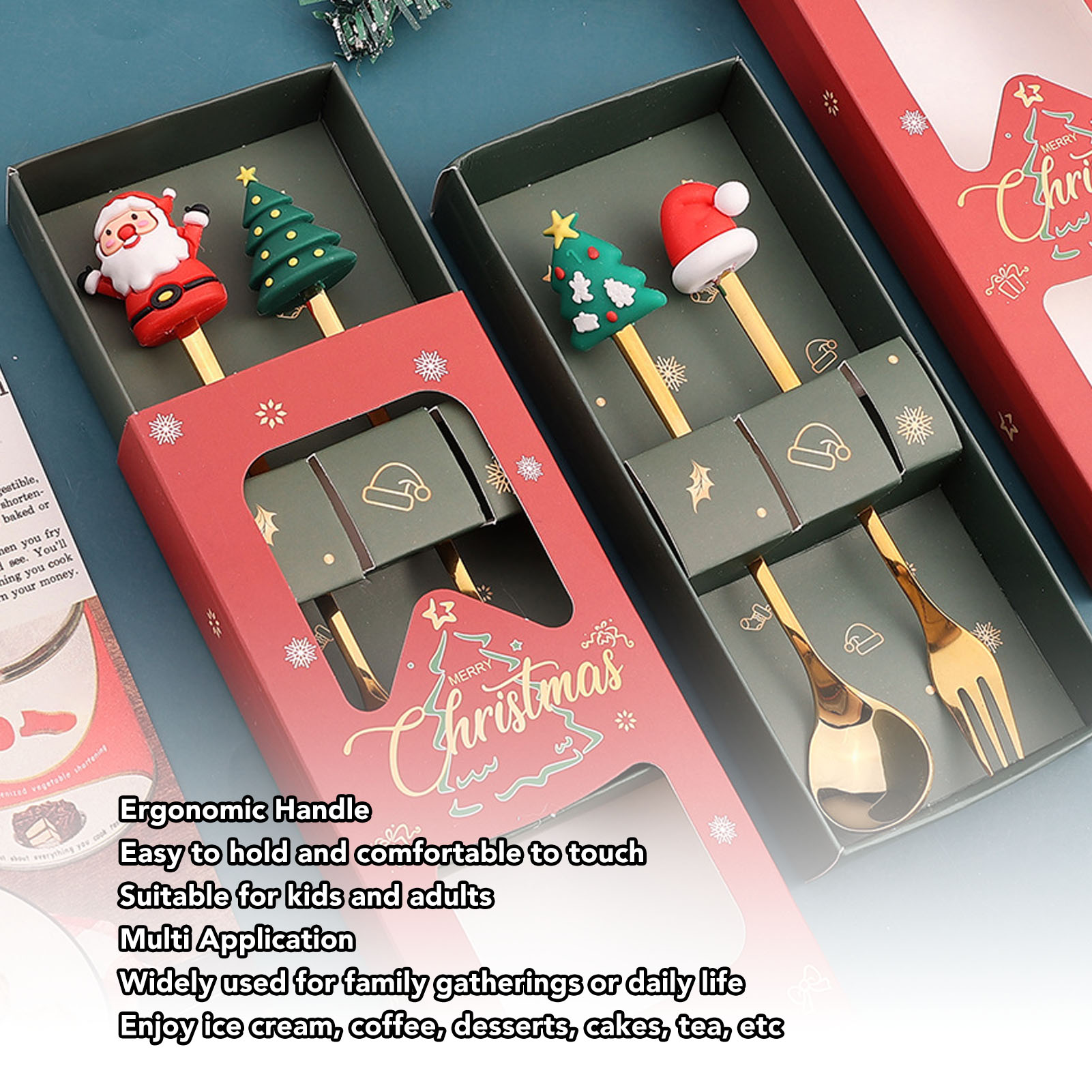 1、PREMIUM MATERIALS: Christmas spoon fork set made of stainless steel and silicone, reusable, sturdy and durable, not easy to break or discoloration. 2、CUTE AND UNIQUE: These tablewares have Christmas themed shapes on the top of the handles, including Christmas trees, socks, etc, cute and elegant. 3、ERGONOMIC DESIGN: Stylish spoon fork with ergonomic handle is easy to hold and comfortable to touch, suitable for kids and adults. 4、MULTIPLE APPLICATIONS: Christmas cutlery set, widely used in family gatherings or daily life. Easy to enjoy ice cream, coffee, dessert, cake, tea, etc. 5、CHRISTMAS GIFT: Practical and delicate stainless steel cutlery, easy to clean and maintain, beautifully boxed, can be shared with family and friends as a Christmas gift.