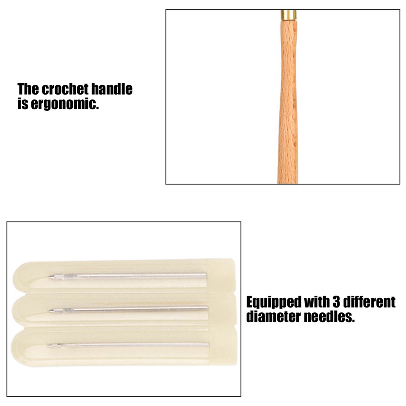 1、The crochet handle is ergonomic, non‑slip and labor‑saving, and comfortable to hold. 2、Equipped with 3 different diameter needles, which can meet your different needs. 3、Suitable for most crochet and embroidery work, it is a good helper for your home knitting. 4、Crochet hooks are made of high‑quality materials, which are durable and not easily deformed. 5、Easy to use, suitable for embroidery, beading or hand‑made crafts.