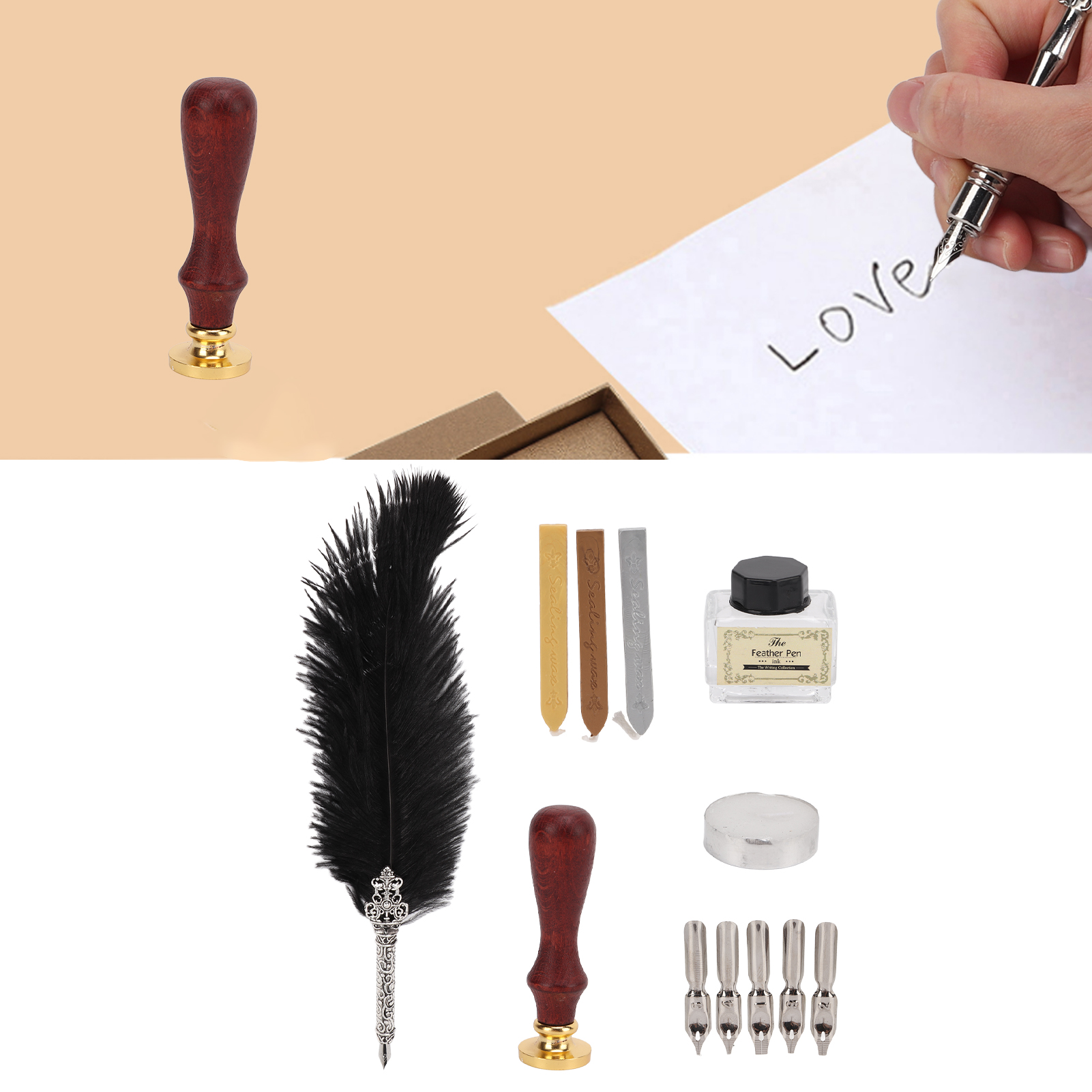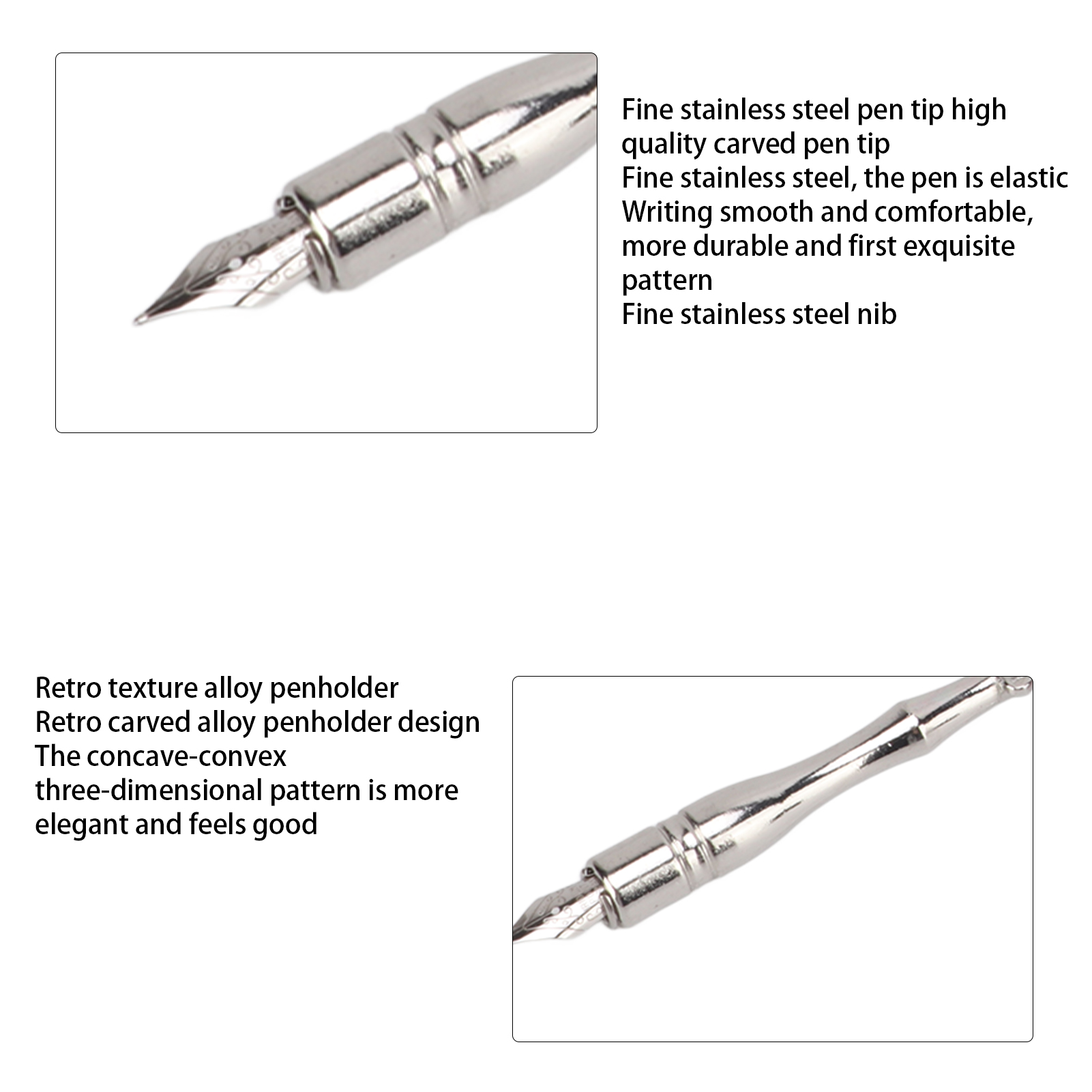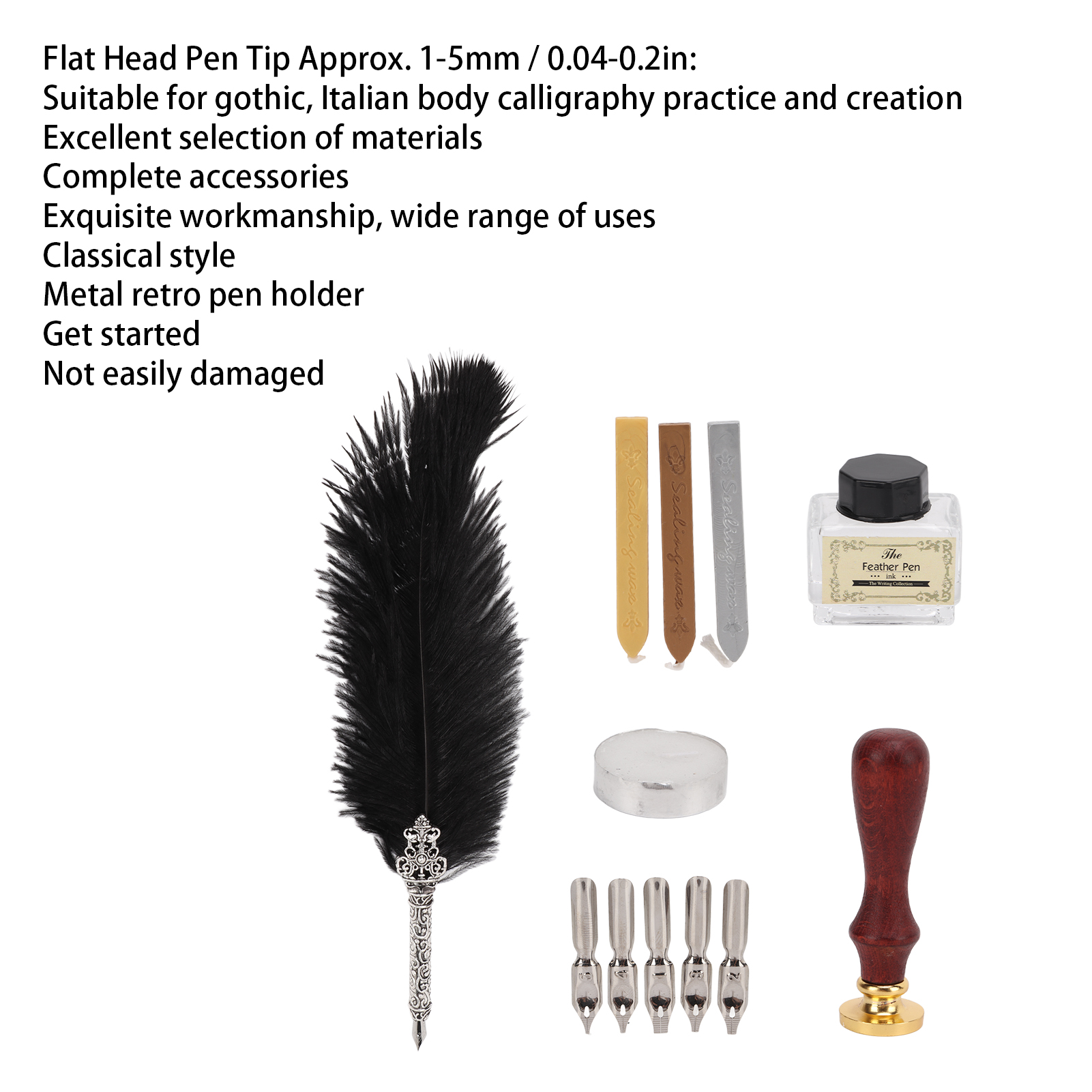 1、High quality carving nip, use fine stainless steel, the pen tip is rich, the writing is glossy, more durable and the first exquisite pattern 2、Preferred to make a retro and elegant writing tool with a variety of accuracy feathers and stainless steel nodes 3、Exquisite modeling and exquisite patterns, so exquisite and very artistic. It is a beautiful stationery 4、The lines of feathers are soft and easy to bifurcate. They can be recovered by gently pinching them upward with your fingers 5、Comfortable feathers, hardness high‑profile durable, easy writing. Stainless steel nibs, wear resistance, not easy to damage