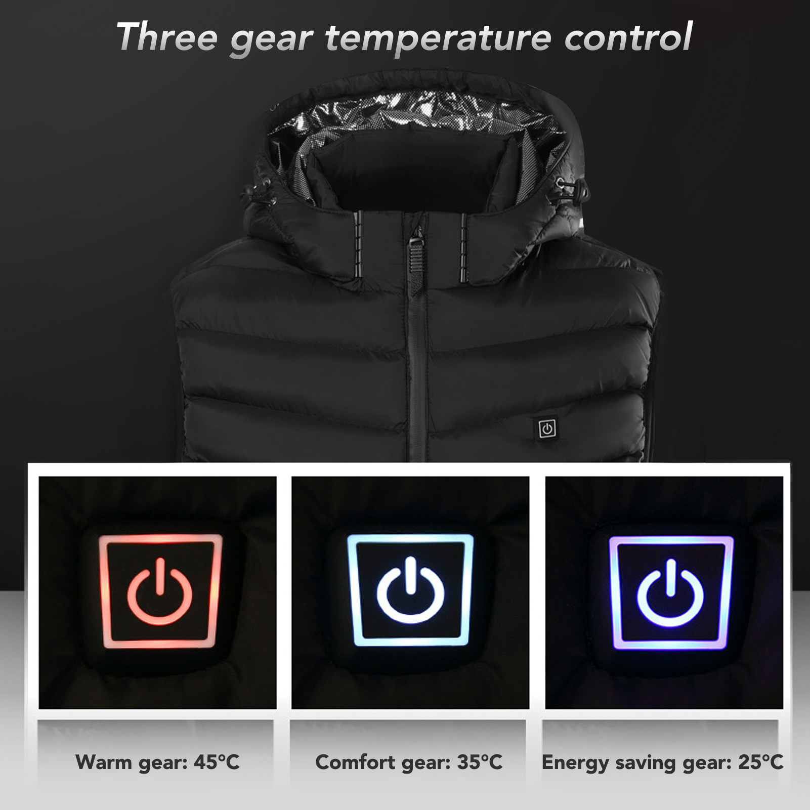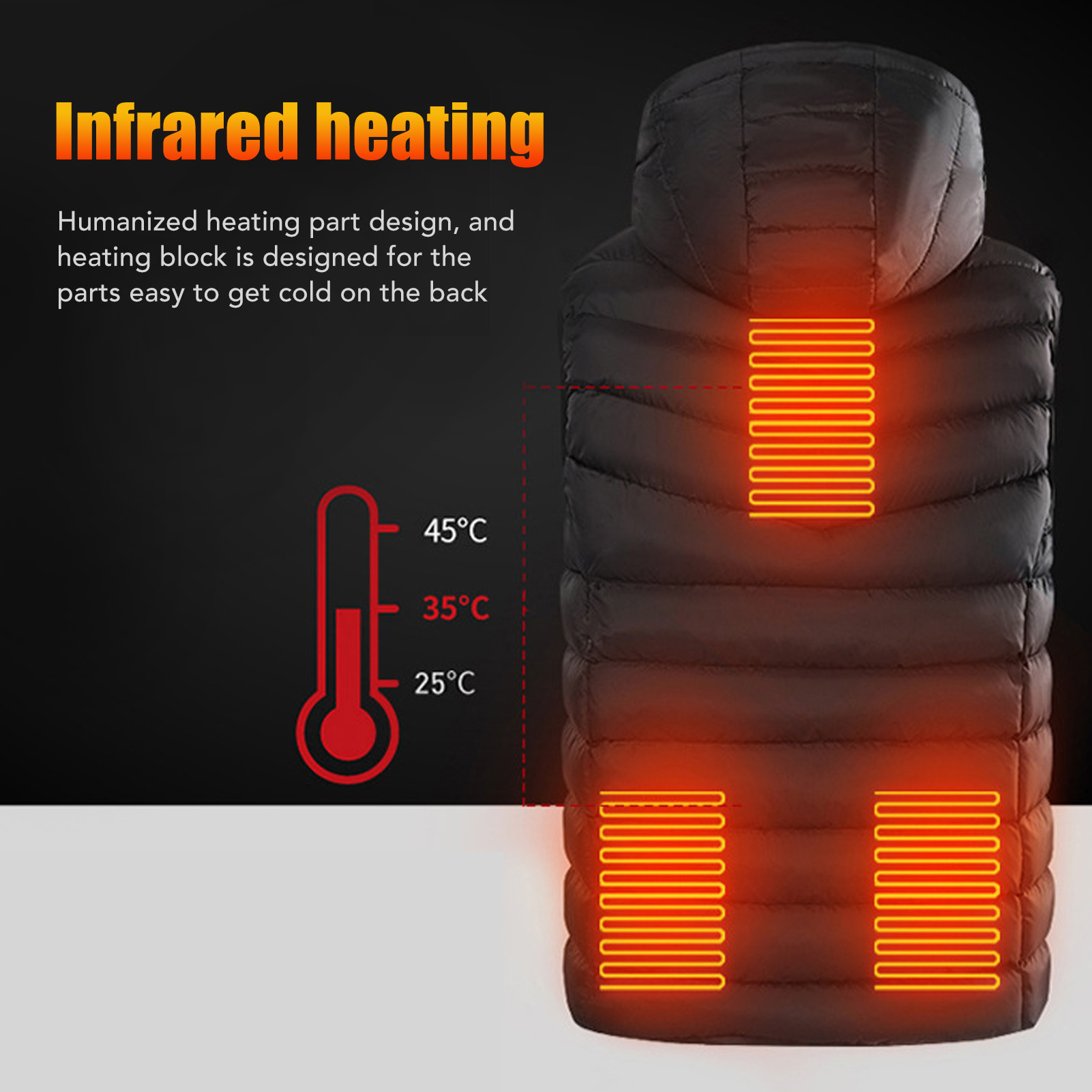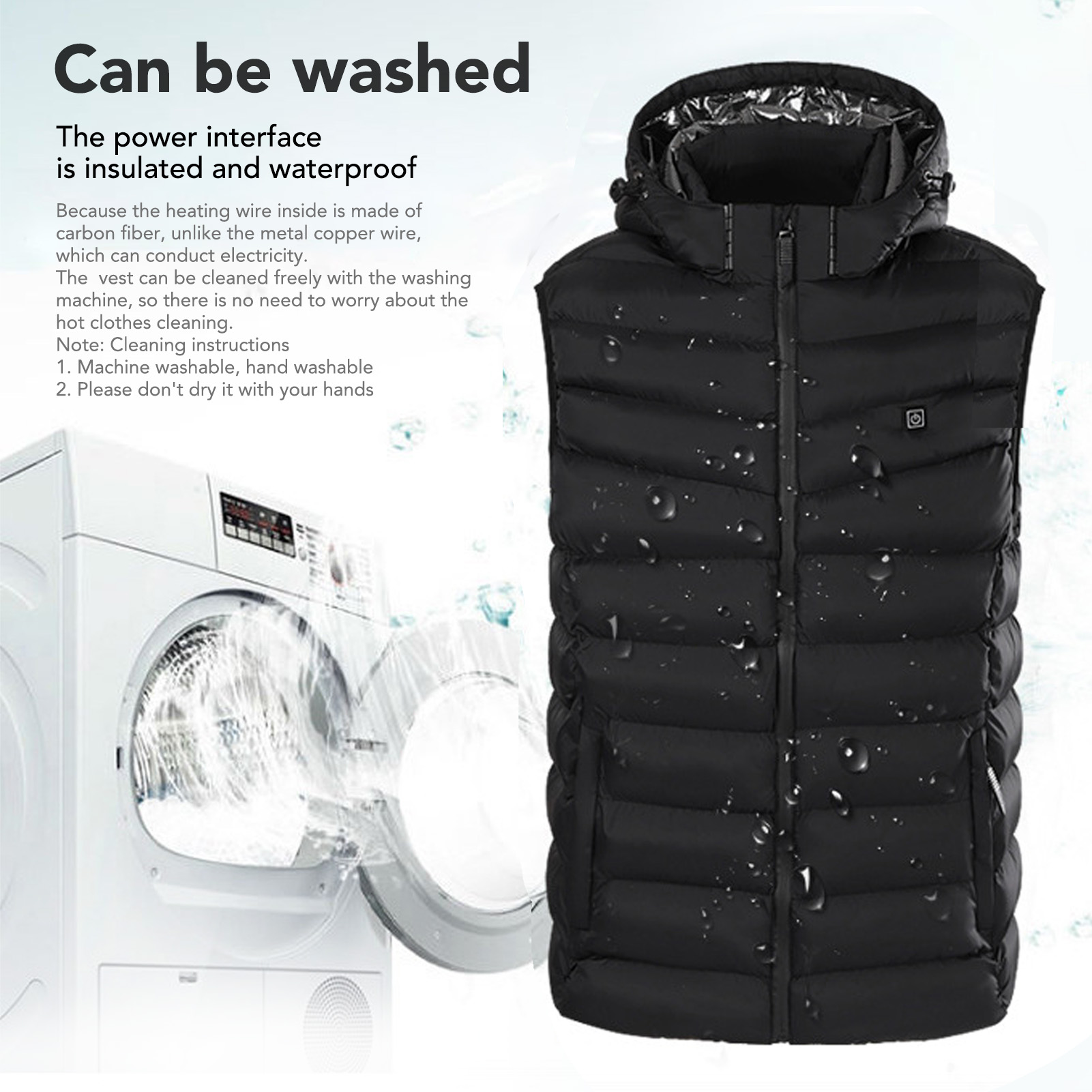 1、Three Level Temperature Adjustment: One button heating, three level temperature adjustment, intelligent heating, only 5V voltage, 10000 mA continuous heating for 8 hours. 2、Washable Waterproof: Washable, power interface using insulation waterproof, windproof, support hand washing, machine washing, dry cleaning. 3、Infrared Heating: Infrared heat, no harmful radiation. Humanized heating part design, and heating block is designed for the parts easy to get cold on the back. 4、Zipper Pocket Design: Anti loss zipper pocket design, can receive small items, practical and more convenient, with a smoothing zipper. 5、Stand Collar and Hooded Design: Stand collar design, comfortable neckline, warm hooded design, comfortable fit neck.