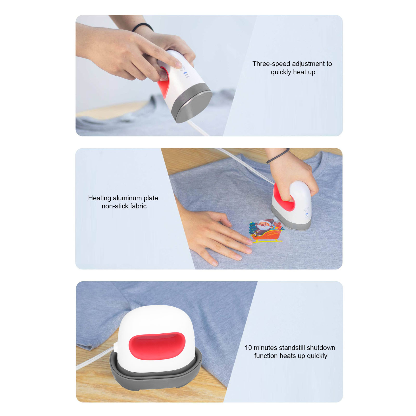1、Portable: The mini heat press is small and portable, easy to operate and use. Three level temperature control to meet the needs of unintelligible. PTFE heating plate, heat evenly. 2、Using Resistance Heating Tube: Shorter heating time. Automatic temperature sensing function, automatic power off when the temperature exceeds the standard, safer. 3、Three Level Temperature: Suitable for different HTV materials, through the UL power cord, safe and reliable, high quality thermal heads are selected, high temperature protection, fast heating speed, and color switching prompts when the temperature is reached. 4、Cooling Down: Stand for 10 minutes to shut down, and the heat insulation pad is suitable for high temperature resistant materials to quickly cool down. 5、Exquisite Craftsmanship: In appearance, the new model has a hollow in the middle, which is more convenient and safe for hand held operation. Compared with the old model, the craftsmanship has one less processing procedure, and the price is more favorable when the quality function is not affected.