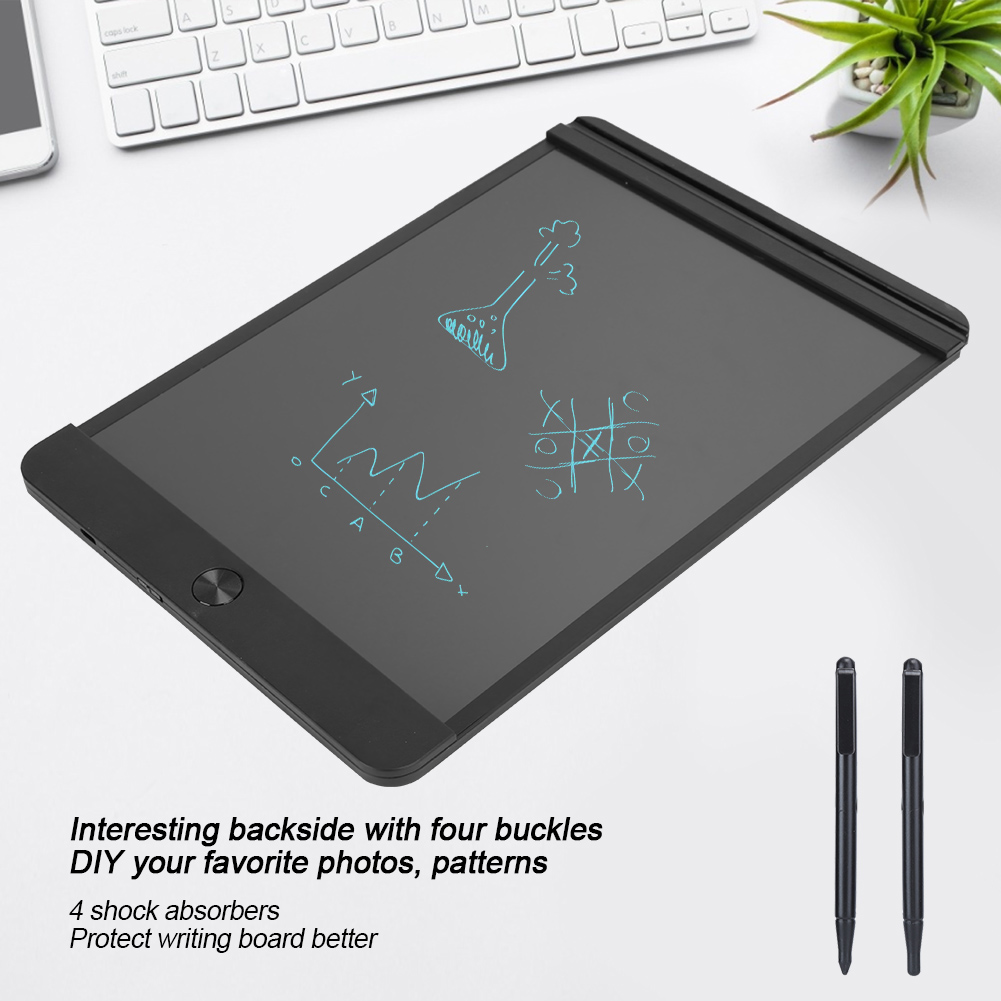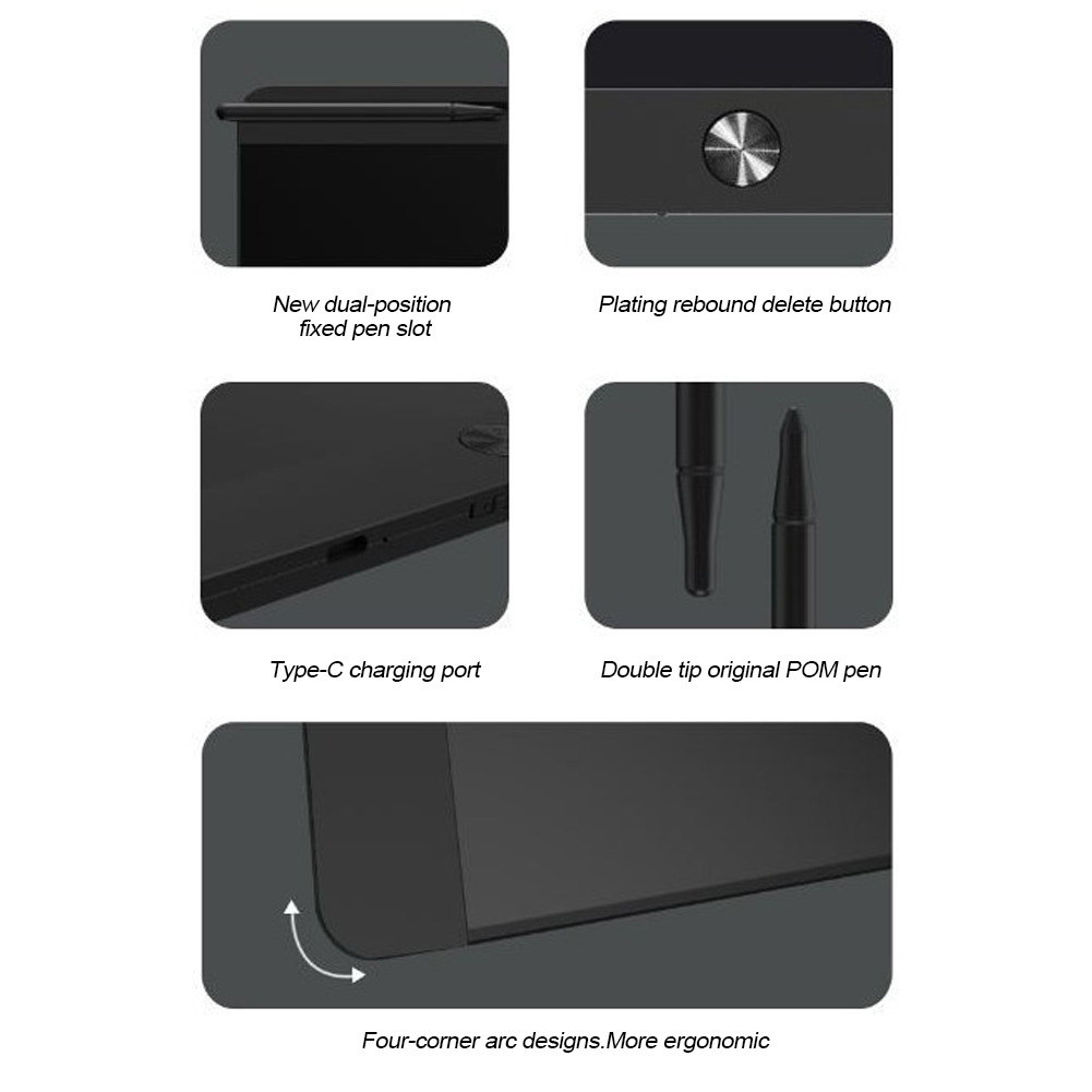 1、Using a new generation of flexible diaphragm with two original POM pens, writing without leaving marks or damage the diaphragm, and the display effect of writing thickness can be switched at will, bringing you an unobstructed writing experience 2、In addition to convenient and fast charging, the product also has a long standby time, which does not consume electricity for daily writing, and consumes a small amount of electricity every time you delete a handwriting 3、Standby time for one charge is about 6 months, the power can support about 100,000 times repeated delete in every day use 4、The one‑key clear designs are in line with children's habit of smearing at will. The product is equipped with a lock function key to prevent accidental deletion after opening, which allowing children to devote themselves to creation 5、Possess an interesting backside with four buckles on the back, you can DIY your favorite photos, patterns and other inserts, 4 shock absorbers on the four sides of the back to protect the writing board better