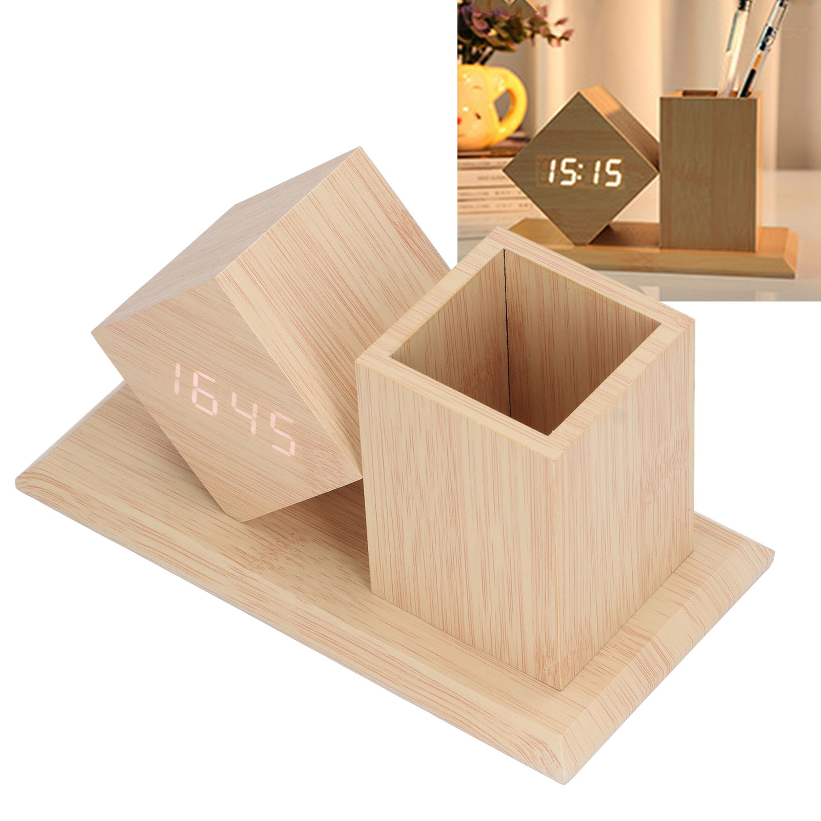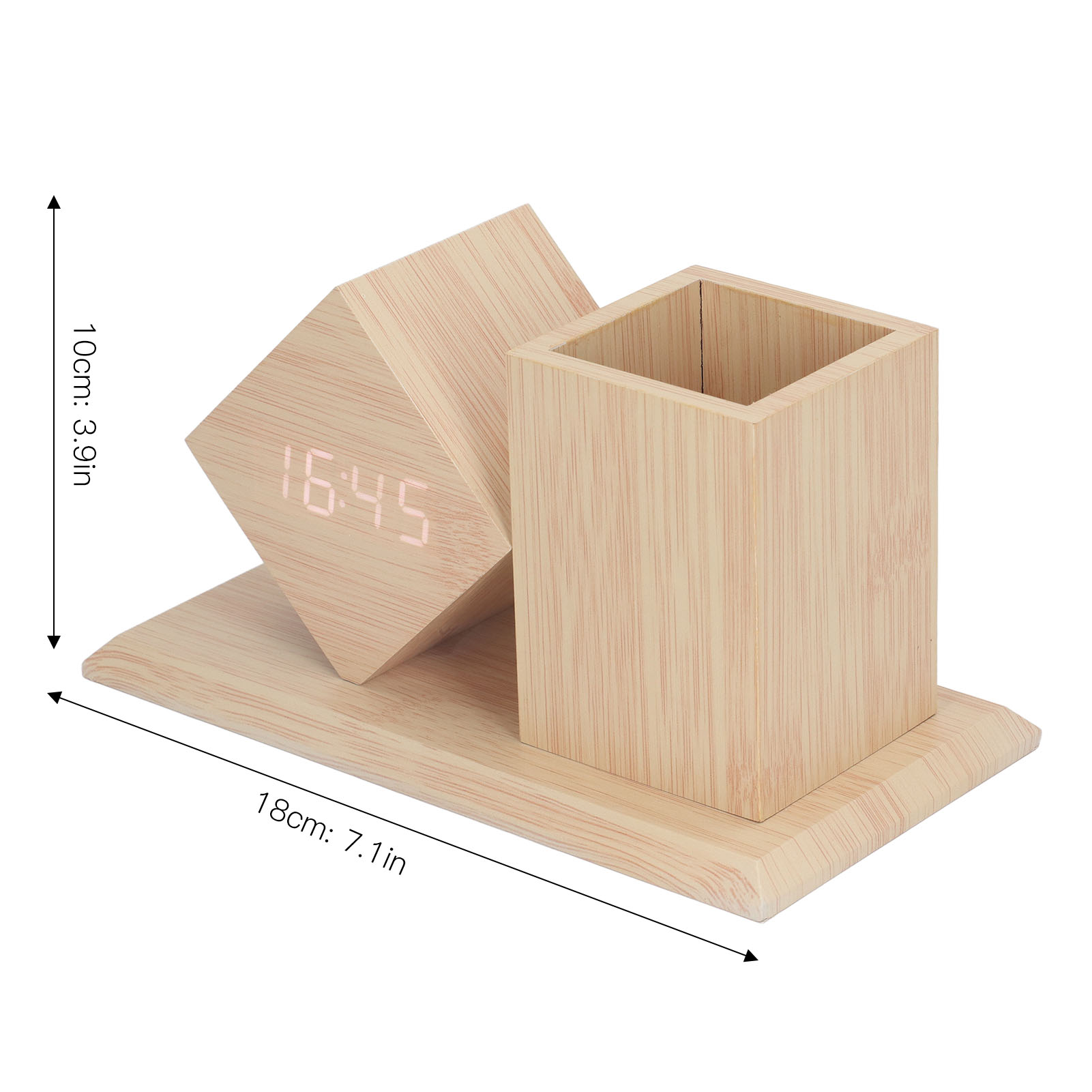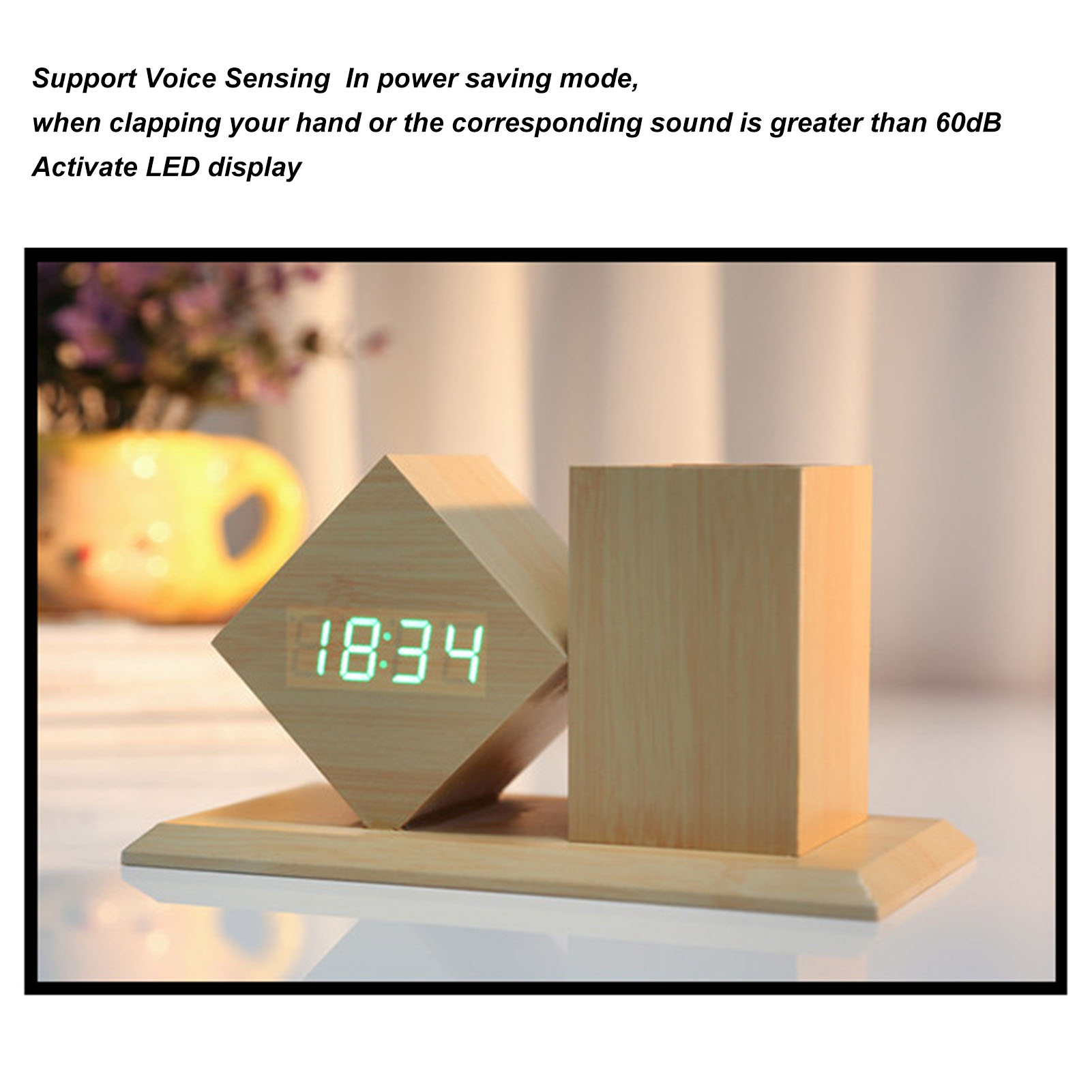 Pen Holder Clock Voice Control HD LED Display USB Battery Powered Wooden Digital Alarm Clock with Thermometer