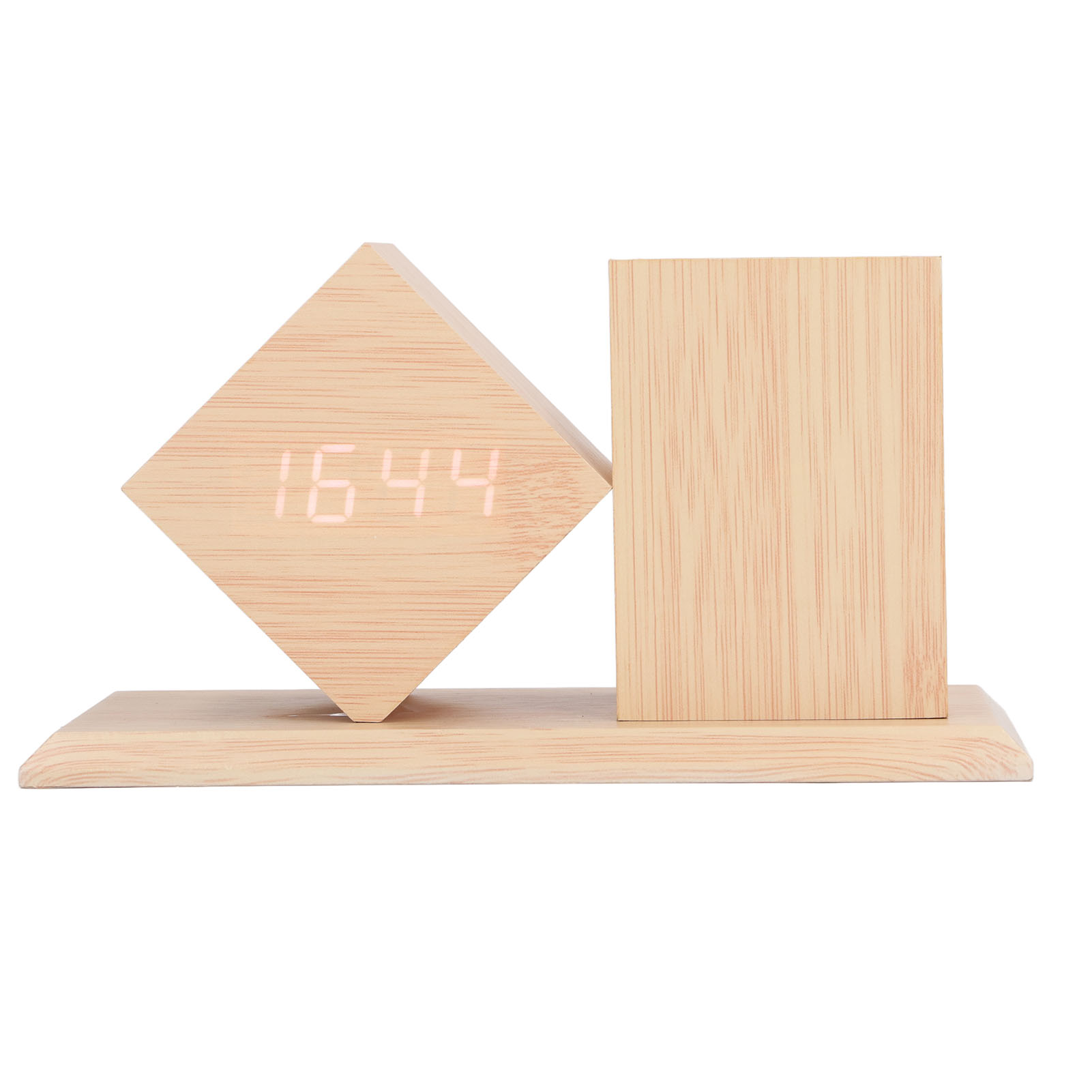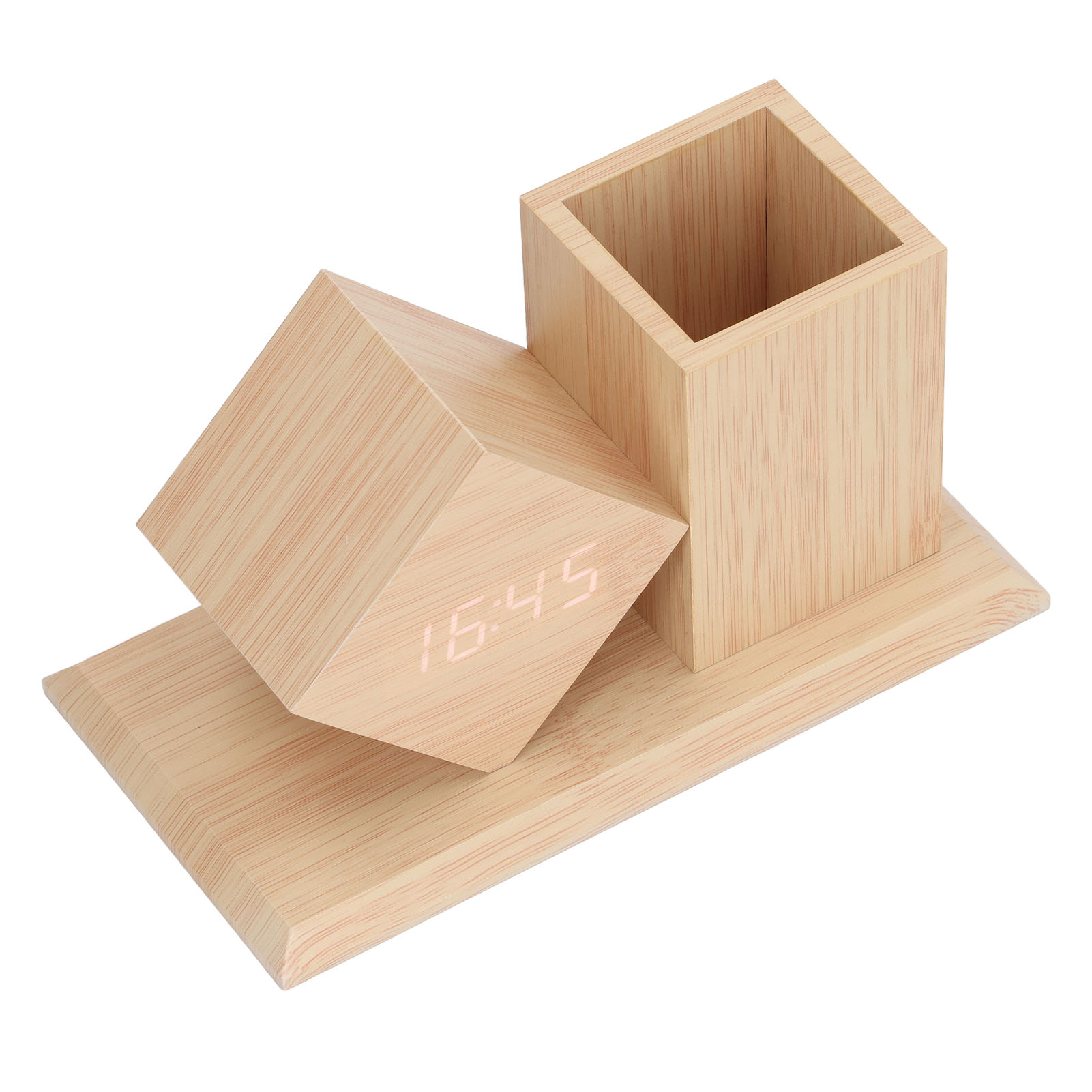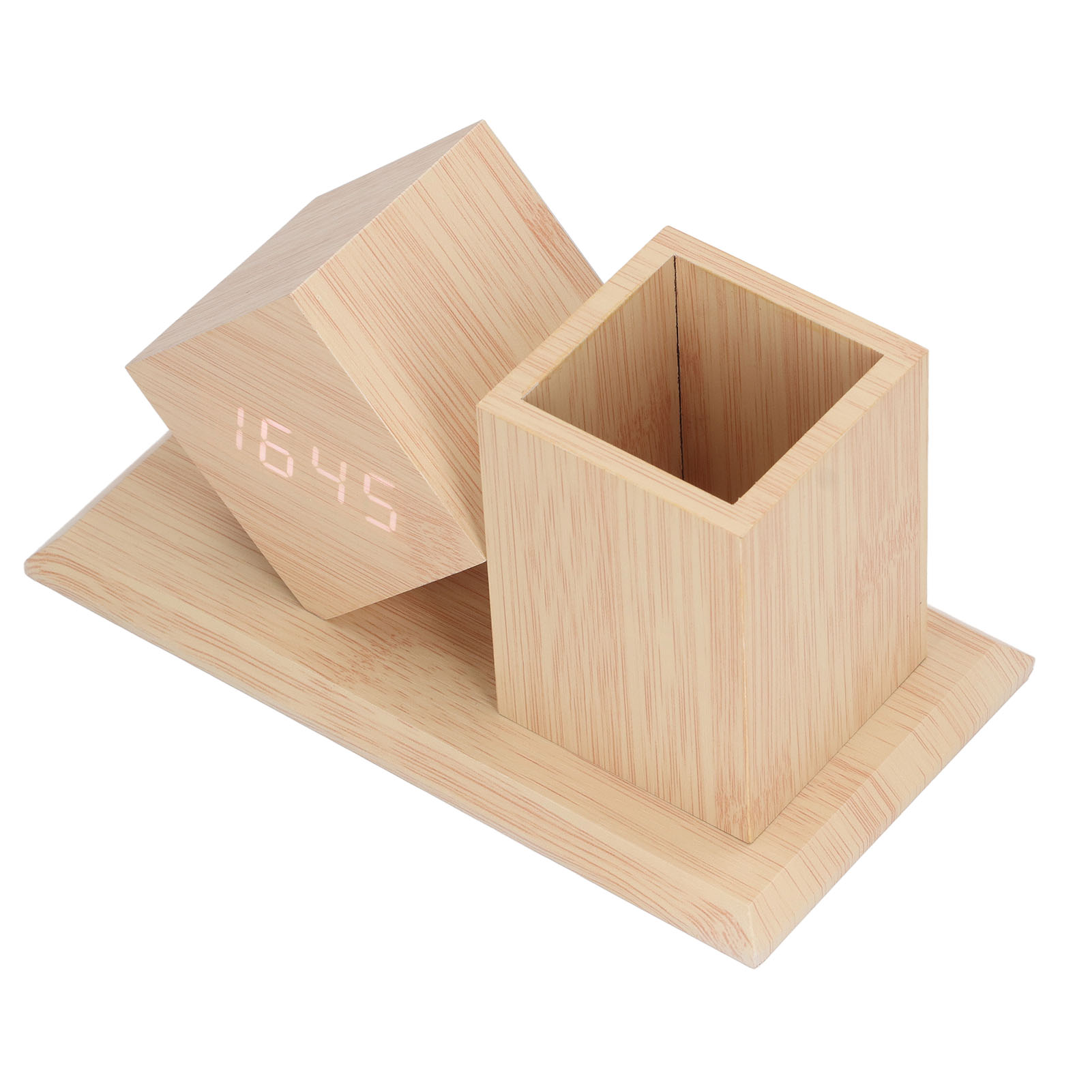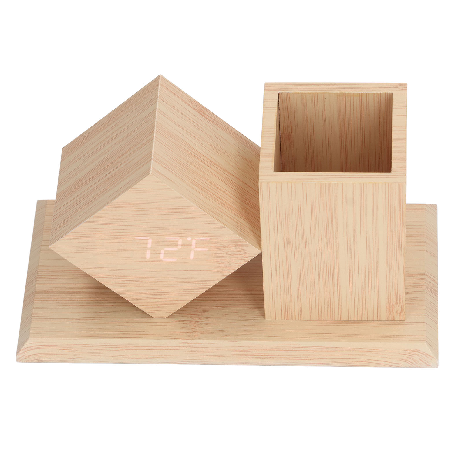 Pen Holder Clock Voice Control HD LED Display USB Battery Powered Wooden Digital Alarm Clock with Thermometer