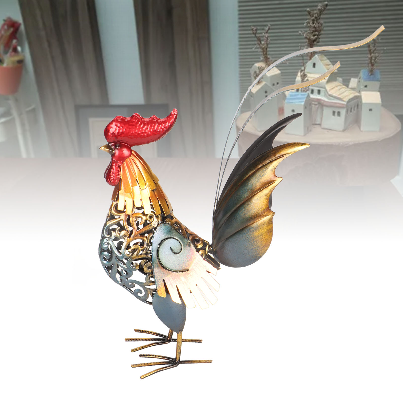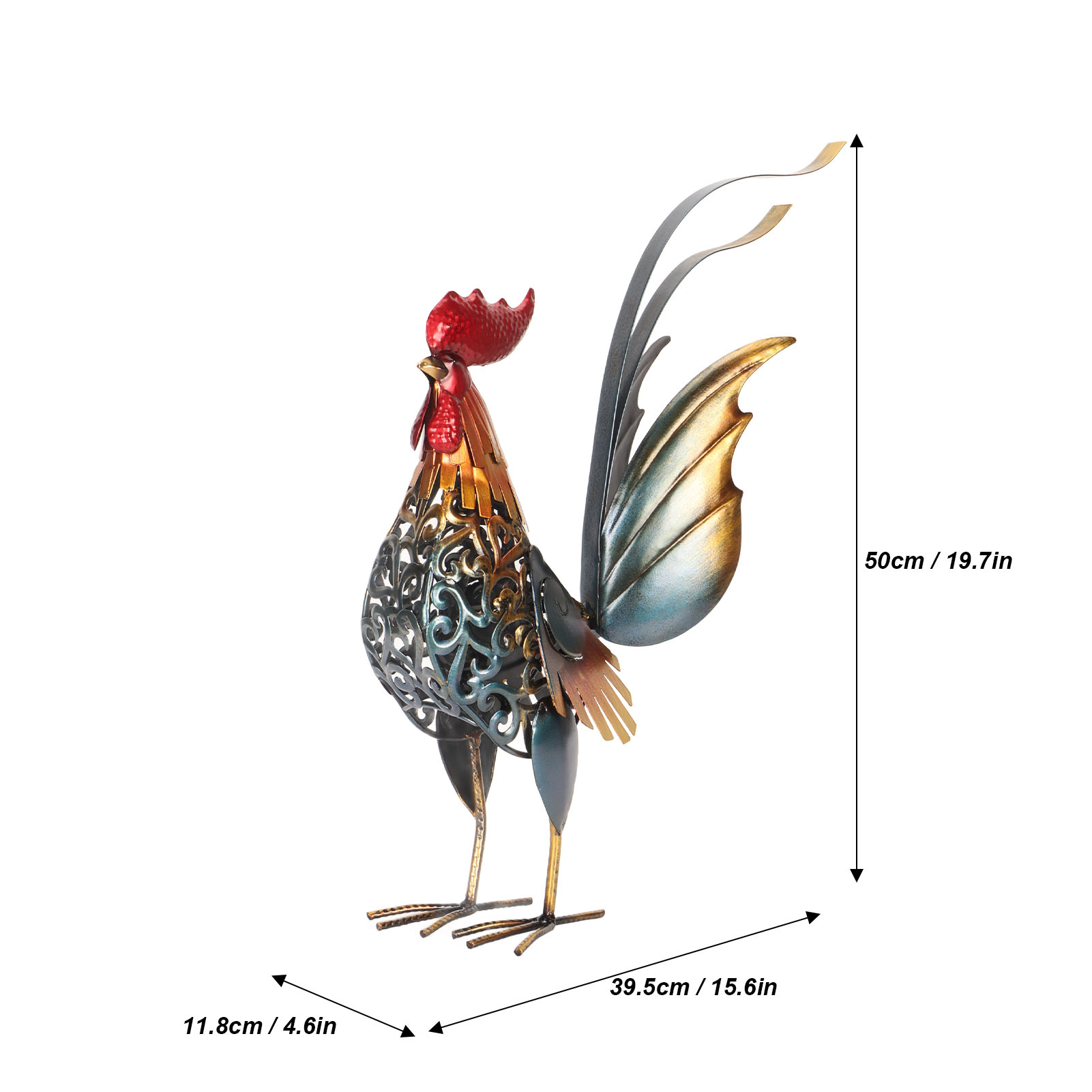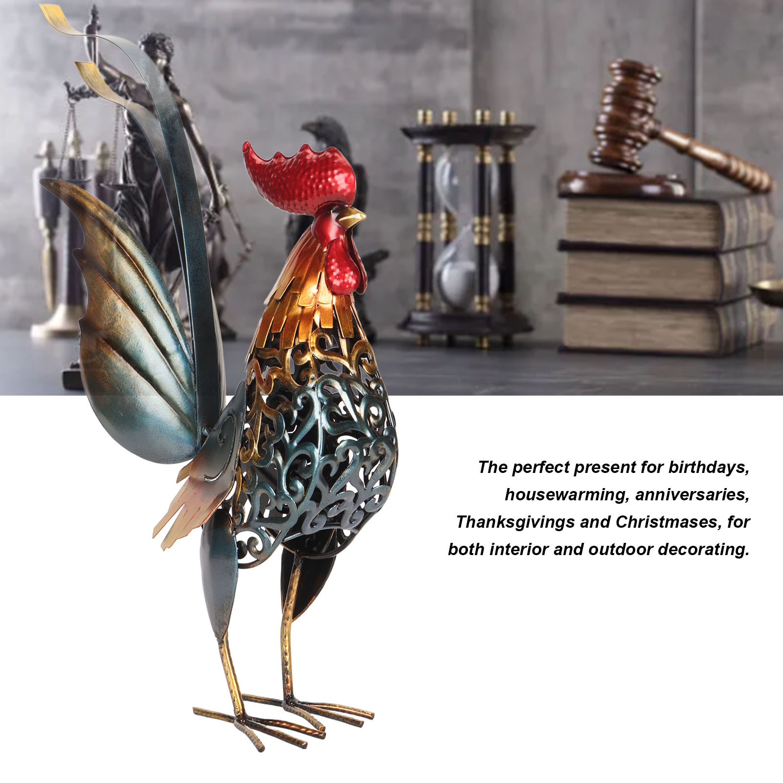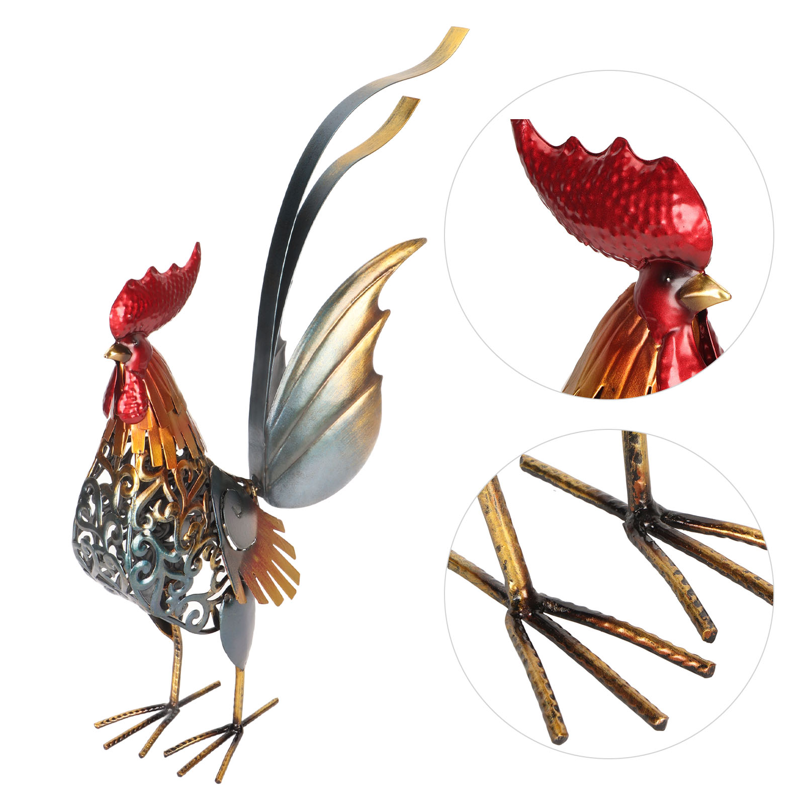 1、[Iron Material]: The rooster sculpture is crafted from iron material, ensuring durability and longevity, and the surfaces undergoes high temperature baking paint process, visually appealing and environmentally friendly. 2、[Hollow Design]: The rooster sculpture features a captivating hollow design, adding depth and dimension to the overall appearance. The detachable tail allows for customization and adjustment to suit your preferences. 3、[Versatile Decoration]: Add a touch of interesting to your backyard, lawn, or garden with the intricately carved iron rooster sculpture. Its dynamic form and lifelike details make it a captivating decoration for both indoor and outdoor spaces. 4、[Delicate Present]: The rooster sculpture serves as a perfect present for birthdays, housewarmings, anniversaries, Thanksgiving, Christmas, and more, is memorable and thoughtful present. 5、[Wide Application]: The carved rooster sculpture is suitable for both indoor and outdoor, can be placed on the kitchen cabinet, in the living room, or in the garden.