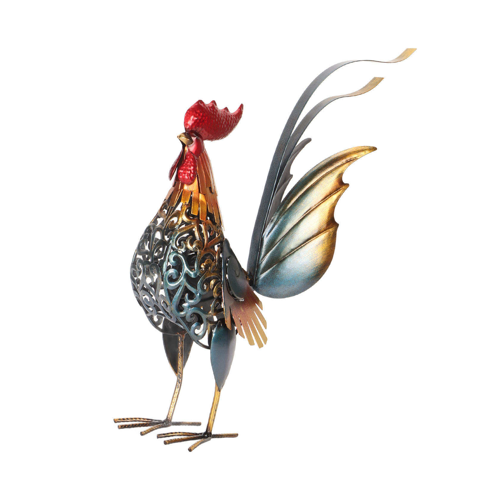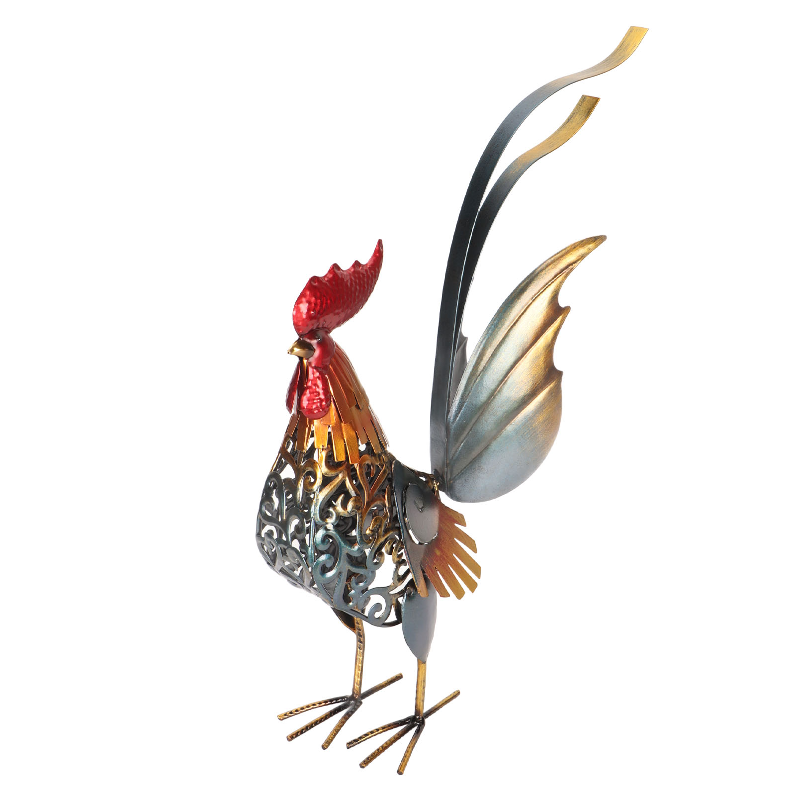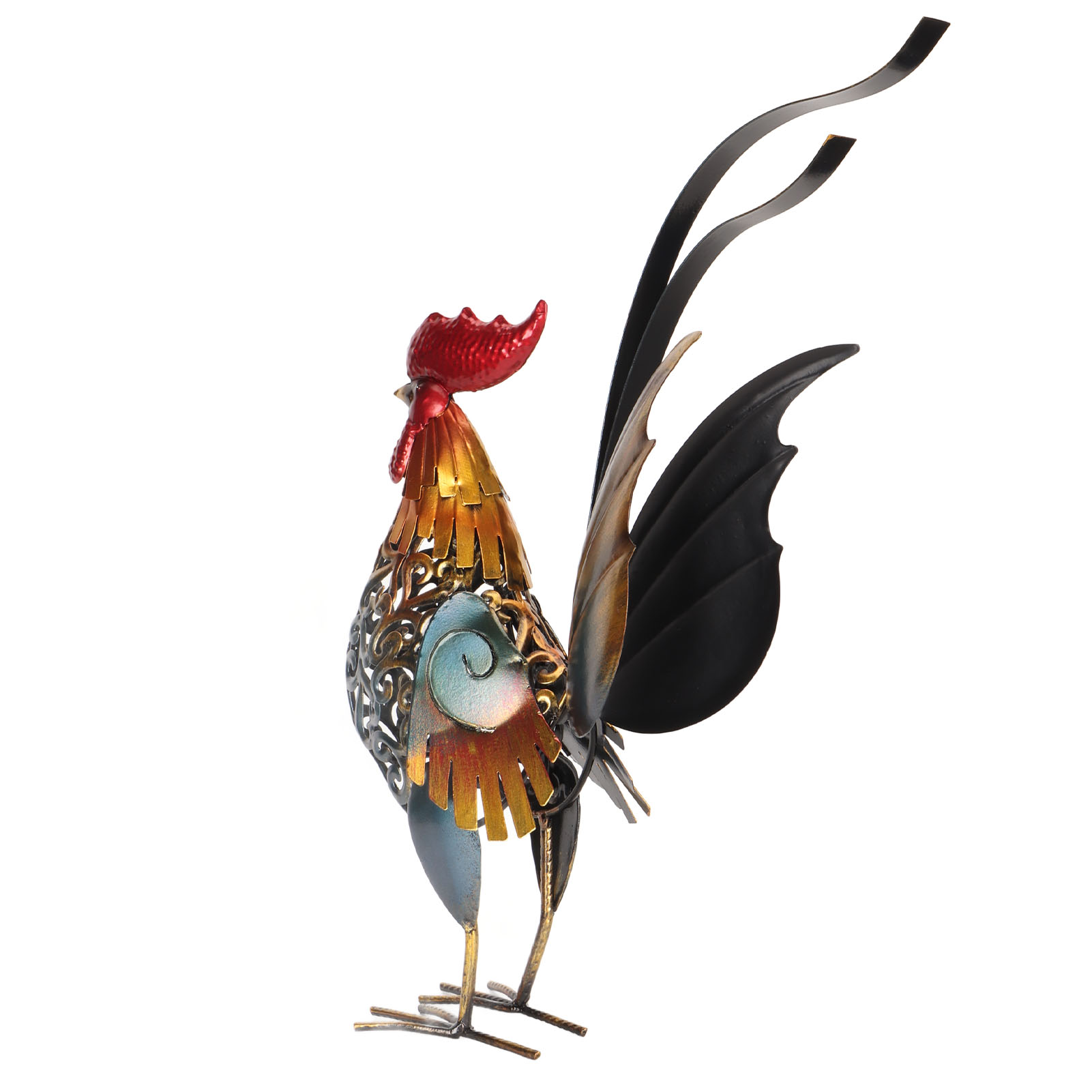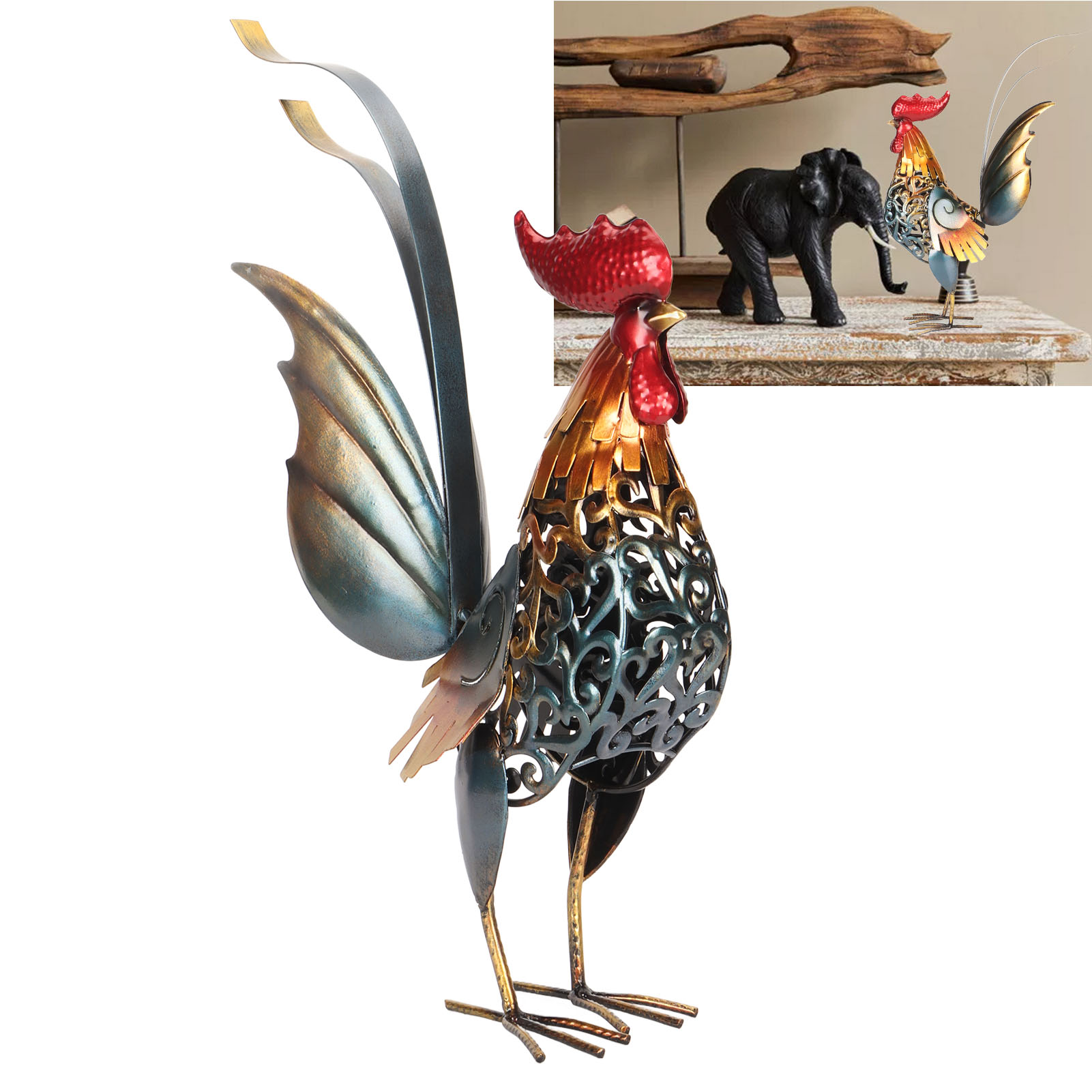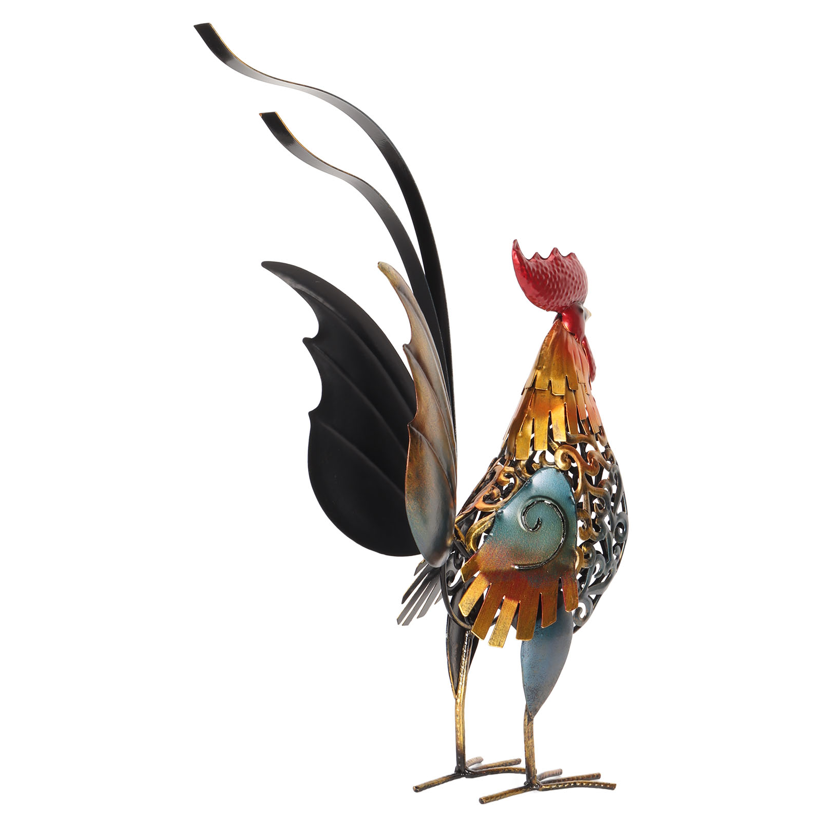 1、[Iron Material]: The rooster sculpture is crafted from iron material, ensuring durability and longevity, and the surfaces undergoes high temperature baking paint process, visually appealing and environmentally friendly. 2、[Hollow Design]: The rooster sculpture features a captivating hollow design, adding depth and dimension to the overall appearance. The detachable tail allows for customization and adjustment to suit your preferences. 3、[Versatile Decoration]: Add a touch of interesting to your backyard, lawn, or garden with the intricately carved iron rooster sculpture. Its dynamic form and lifelike details make it a captivating decoration for both indoor and outdoor spaces. 4、[Delicate Present]: The rooster sculpture serves as a perfect present for birthdays, housewarmings, anniversaries, Thanksgiving, Christmas, and more, is memorable and thoughtful present. 5、[Wide Application]: The carved rooster sculpture is suitable for both indoor and outdoor, can be placed on the kitchen cabinet, in the living room, or in the garden.