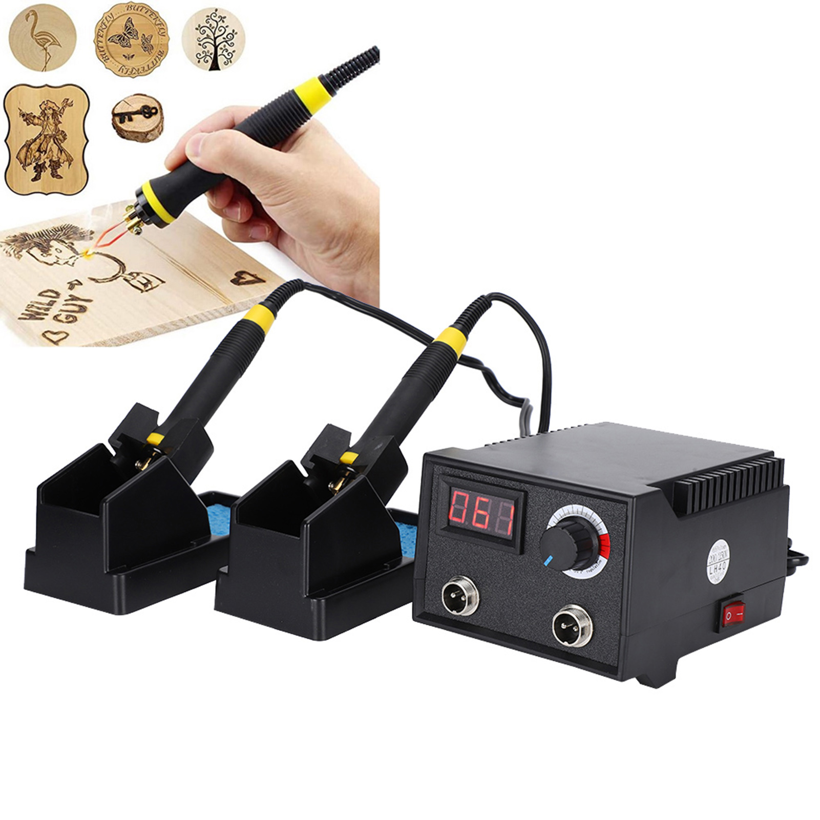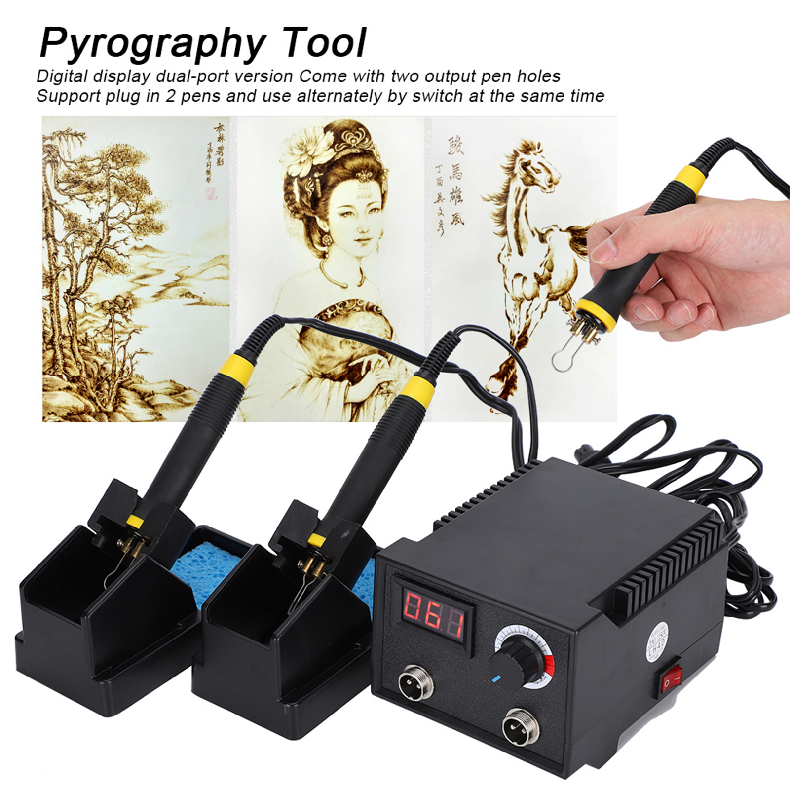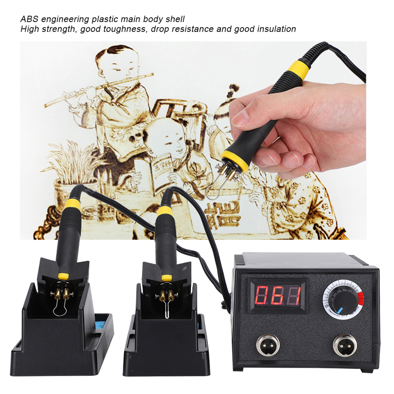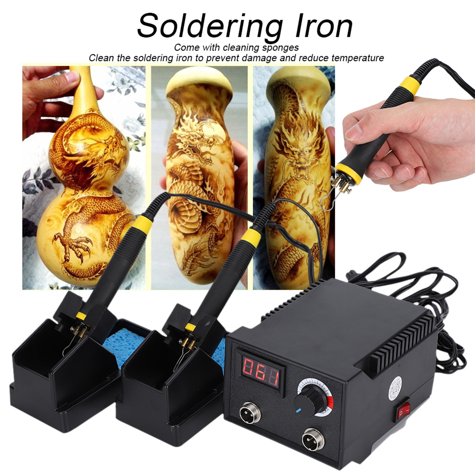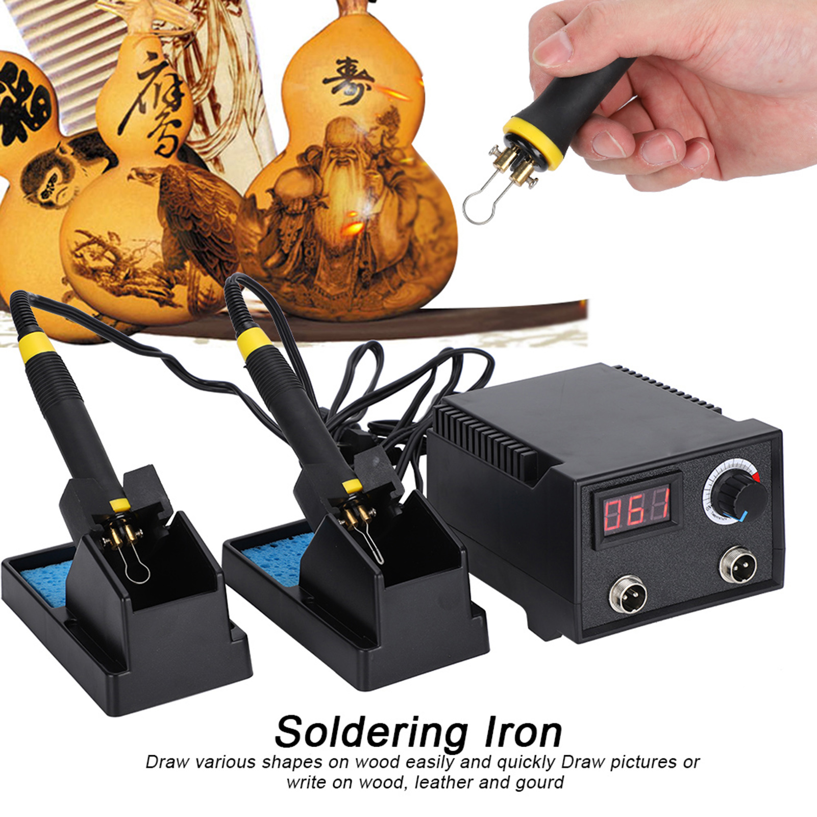 1、The main body shell is made of ABS engineering plastic, which possess high strength, good toughness, drop resistance and good insulation 2、The digital display dual‑port version has the function of digital display host, come with two output pen holes, which support plug in two pens and use alternately by switch at the same time 3、Draw various shapes on wood easily and quickly, which can be used to draw pictures or write on wood, leather and gourd, etc. 4、Come with cleaning sponges, which can be used to clean the soldering iron to prevent damage and reduce temperature, because the welding of iron oxide and iron carbide will damage the tool and reduce heat conduction 5、Made of high class plastic and iron material with good quality, sturdy and durable for a long service life