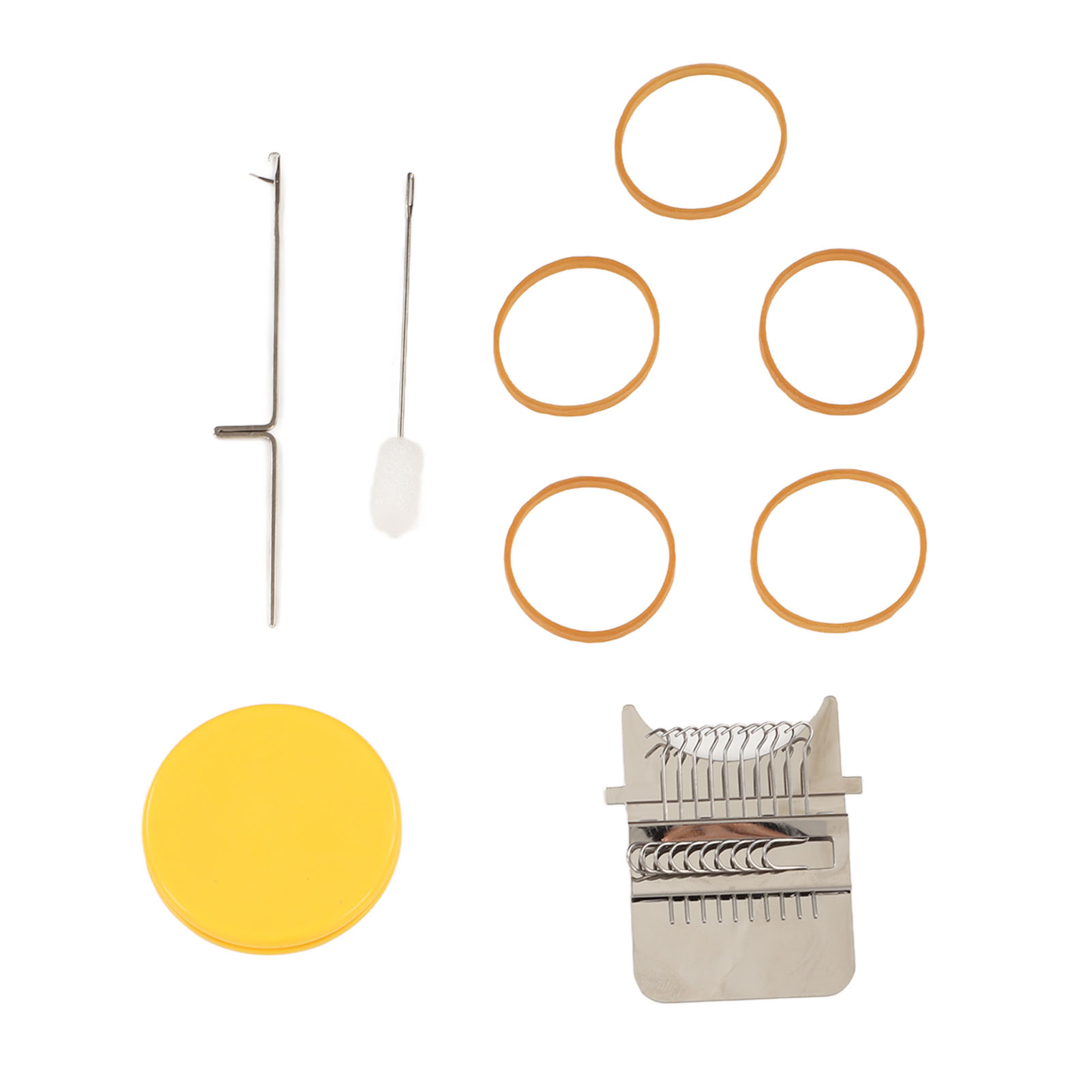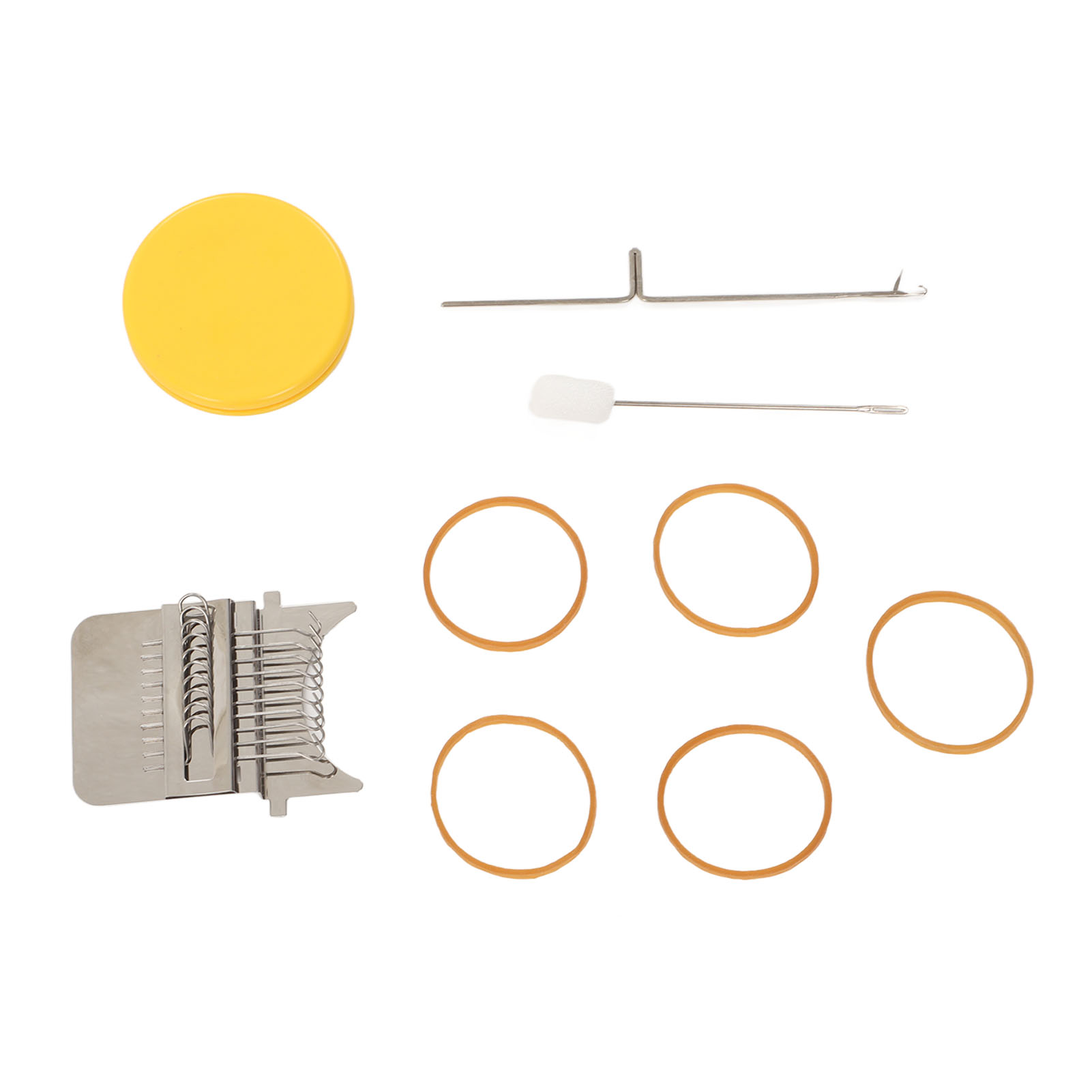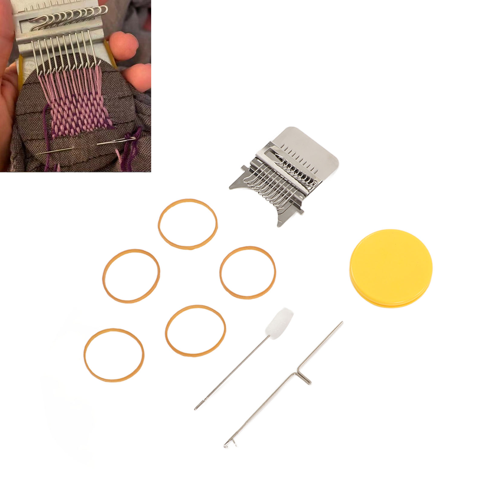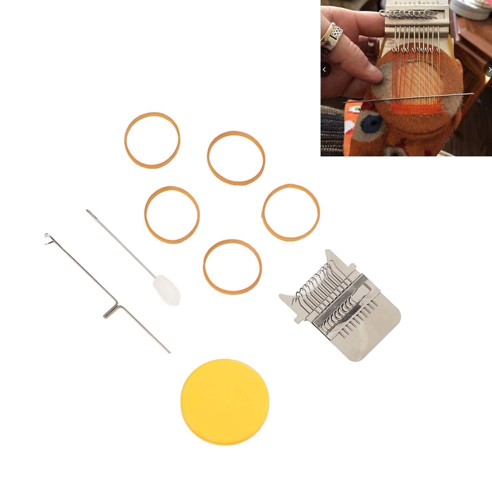 1、Accessories Included: Uniquely designed, high speed knitting alarm machine consists of two parts metal strap hook and a plastic disc, the parts are connected to each other by durable rubber bands, including loom picking tool and needle, you can create patterns in the design. 2、DIY Sewing: This cautionary mini loom can repair small holes in clothes and you can create various patterns in your designs. 3、Easy to Use: Easy to use, just stretch the fabric onto the tool, use a rubber band to hold the fabric and loom in place, unfold your warp and plait, the small trimmer makes your sewing easier and more convenient. 4、Scope of Application: DIY darning tool can be used to mend jean, socks and clothes, and can also plait tapestries, carpets, scarves, etc. 5、Perfect Gift: The knitting action improves hand eye coordination and concentration, great for art governors and design programs, a great choice for giving a quick warning tool as a gift to a friend or family member.