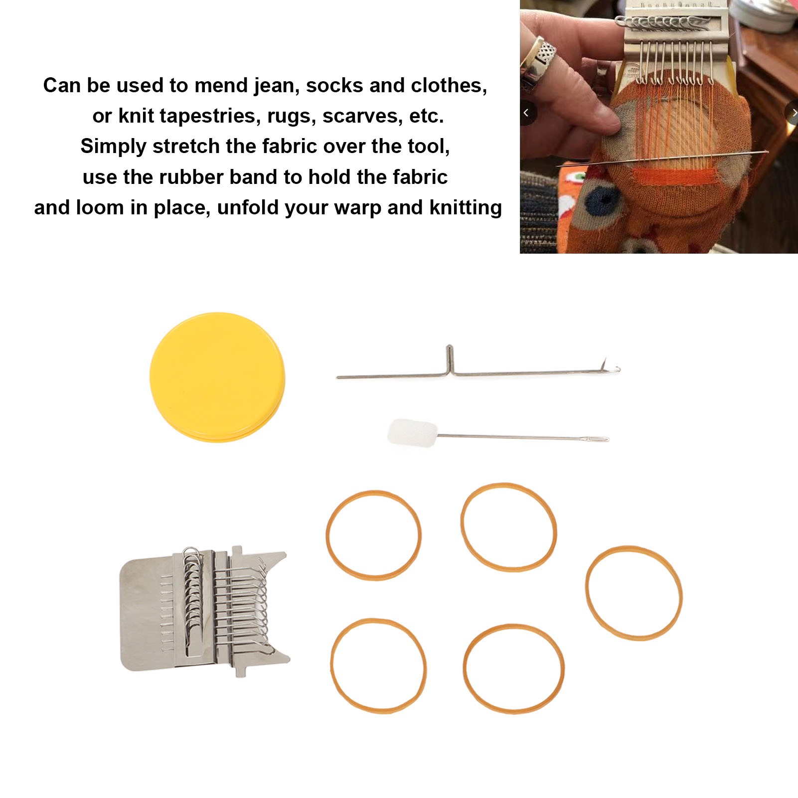 Function: Sewing helper, this warning mini loom can repair small holes in clothes, you can create various patterns in your design, it can be used to mend jean, socks and clothes, or knit tapestries, rugs, scarves, etc.