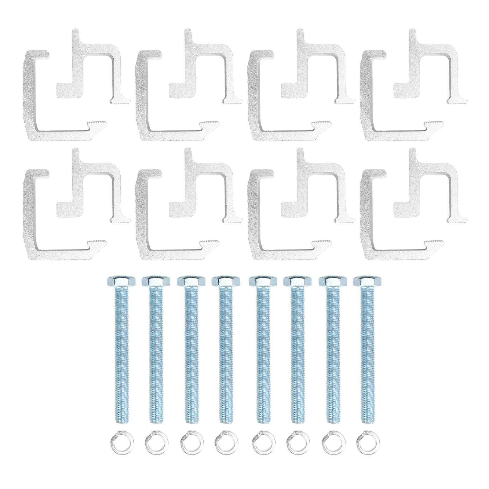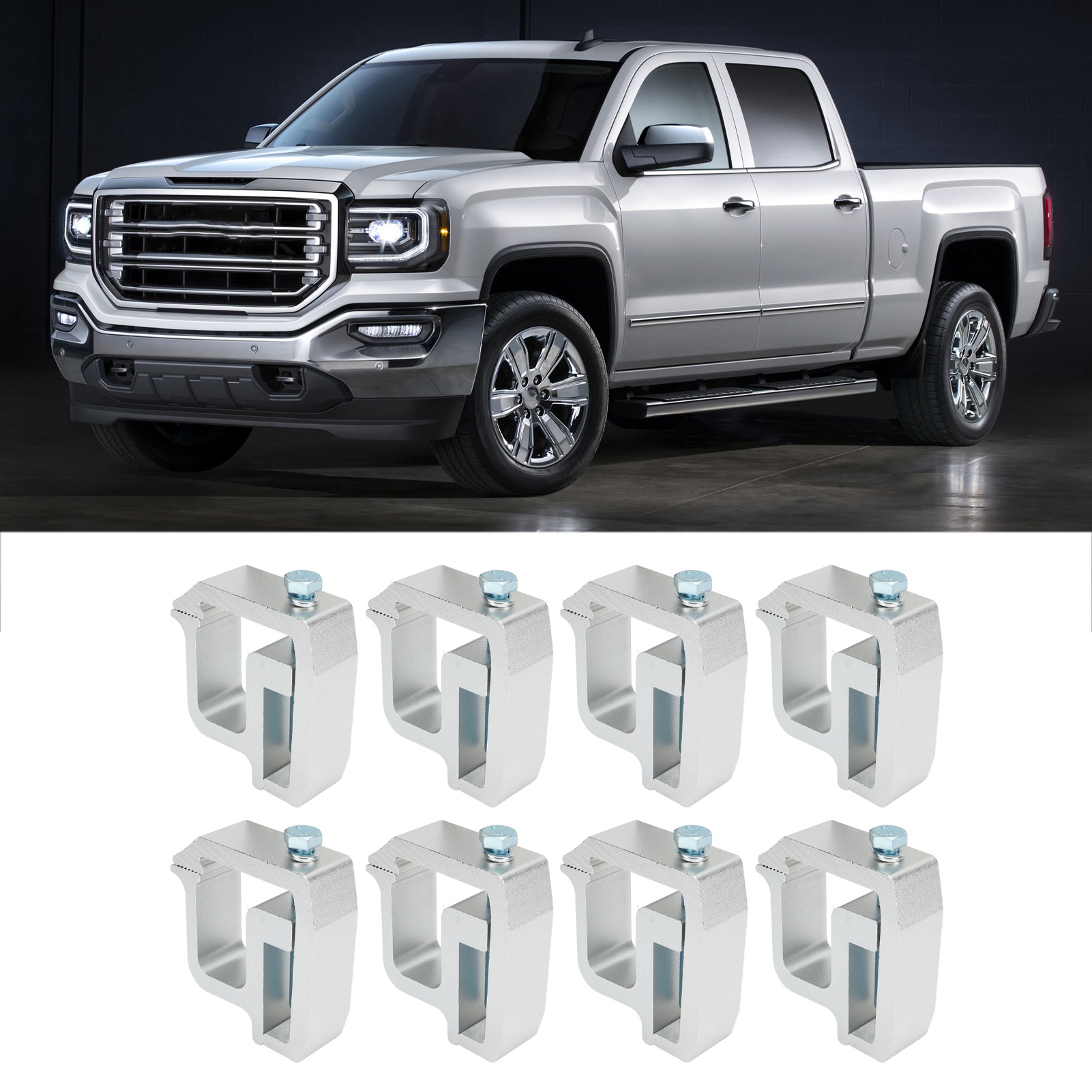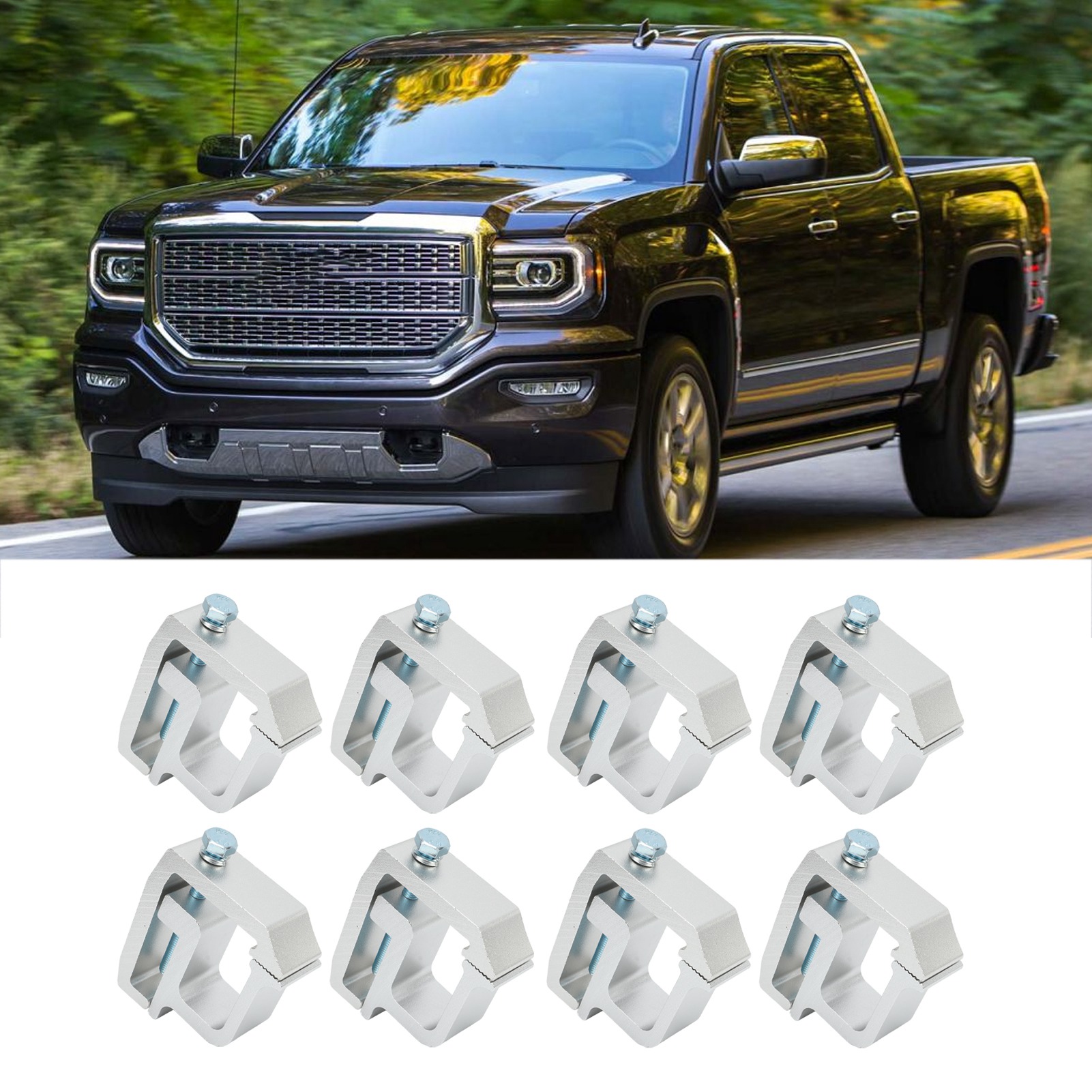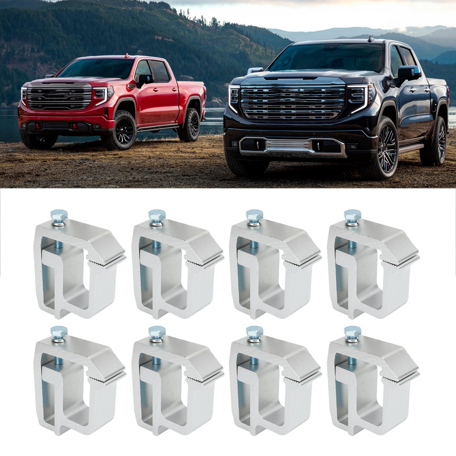 1、Applicable Model: Replacement for Chevy Silverado 1500, 2500, 3500; Replacement for Chevy Sierra 1500, 2500, 3500; Replacement for Ram 1500, 2500, 3500; Replacement for Ford F250 and more. 2、Main Function: The truck mounting clamp is designed for mounting truck caps with fiberglass or aluminum rails. It can meet your various installation needs and provide convenience for your travel. 3、Wide Application: This item is a set of 8 pieces, which can be used as truck topper clamps, ladder rack clamps, truck bed clamps and truck cover clamps, canopy clamps etc. 4、Durable Construction: Truck bed clamps are made of aluminum, which has high hardness and is not easy to rust and corrode, ensuring maximum strength and service life. 5、Easy Installation: Install around the mounting bracket of a large camper or truck lower lip. The bolts can be tightened quickly with a wrench or a ratchet without drilling.