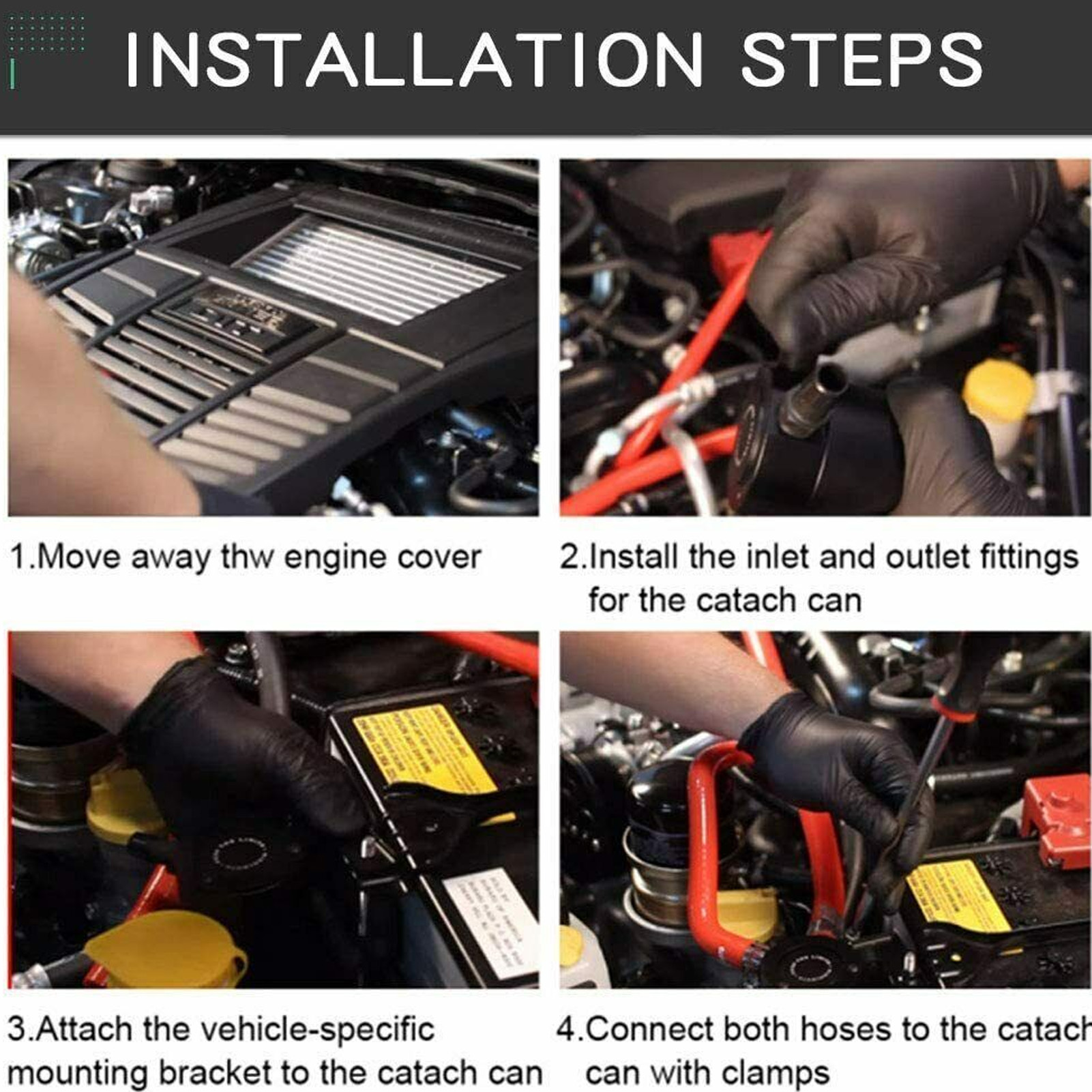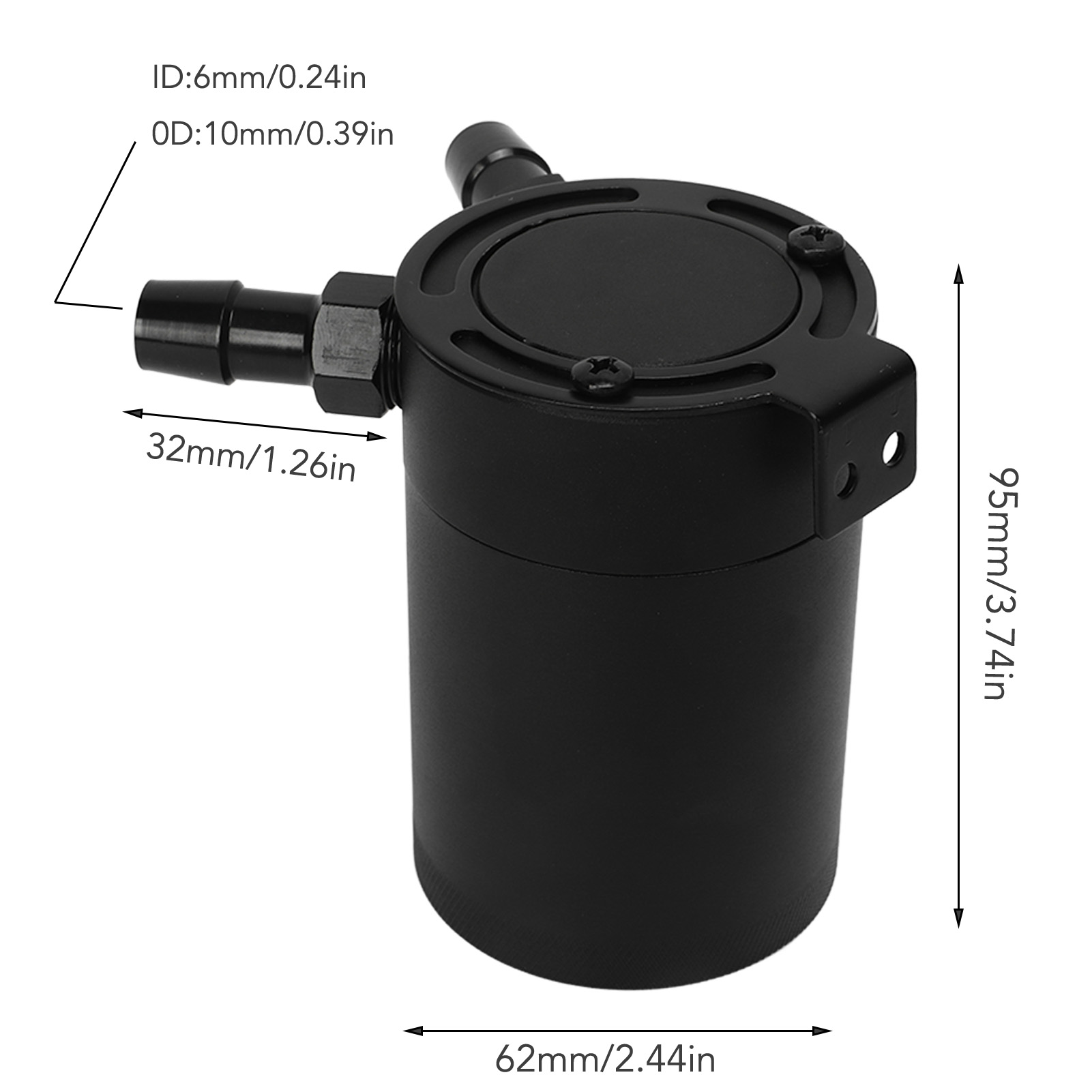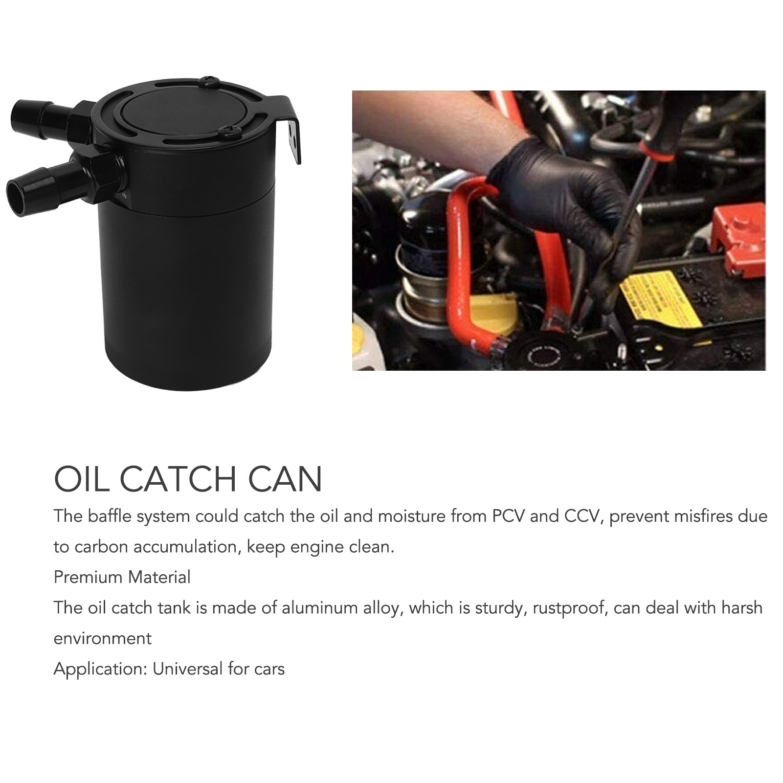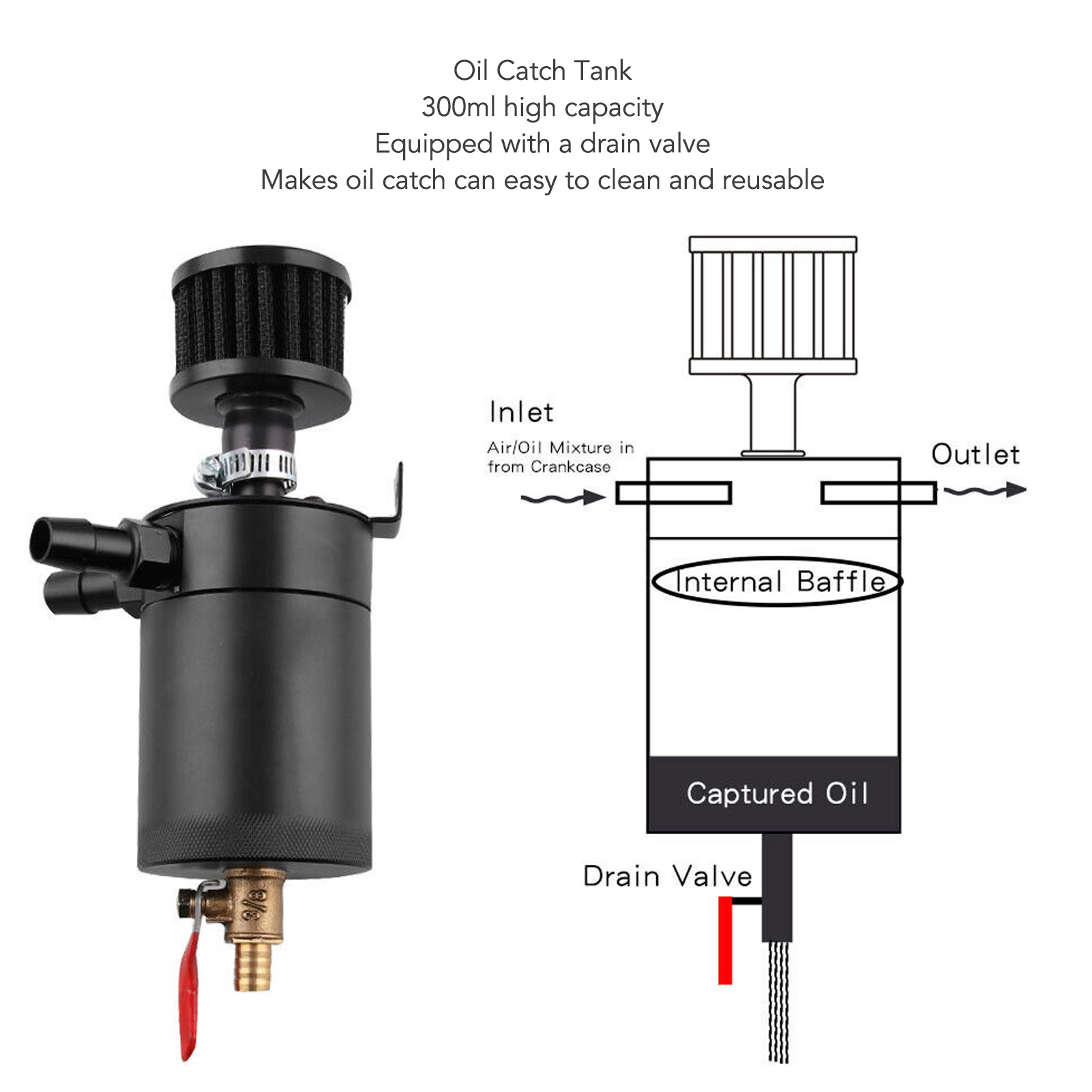 1、Universal Application: 300ml large capacity oil catch tank with one inlet and one outlet, can be used for most automobiles. 2、Keep Engine Clean: The baffle system could catch the oil and moisture from PCV and CCV, prevent misfires due to carbon accumulation, keep engine clean. 3、Reusable: The oil catch tank kit is equipped with a drain valve at the bottom to make cleaning easier, and the oil catch tank can be reused. 4、Premium Material: The oil catch tank is made of aluminum alloy, which is sturdy, rustproof, can deal with harsh environment. 5、Safe and Dependable: The manufacturing conforms to the standard specification, strictly follows the factory quality control, high reliability.