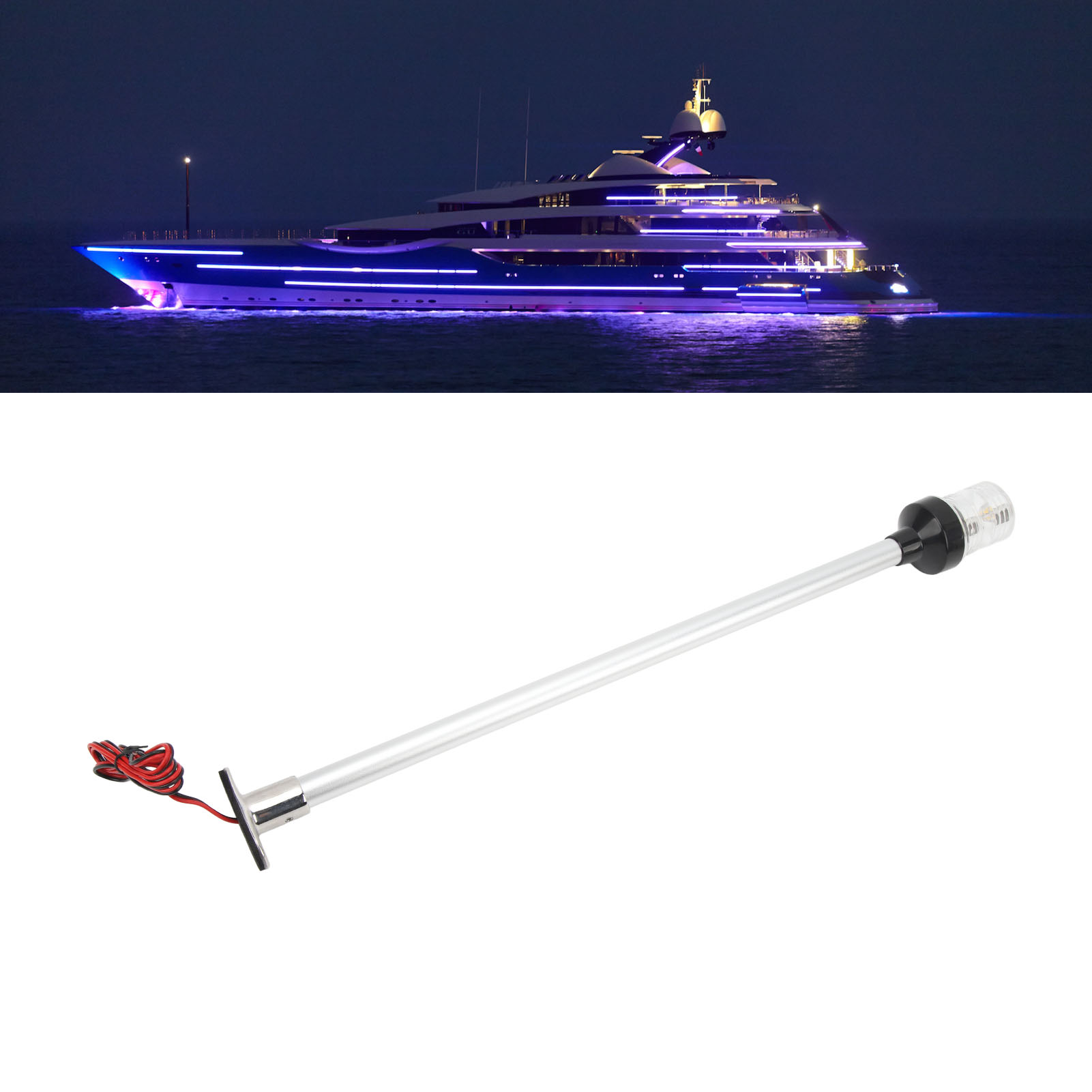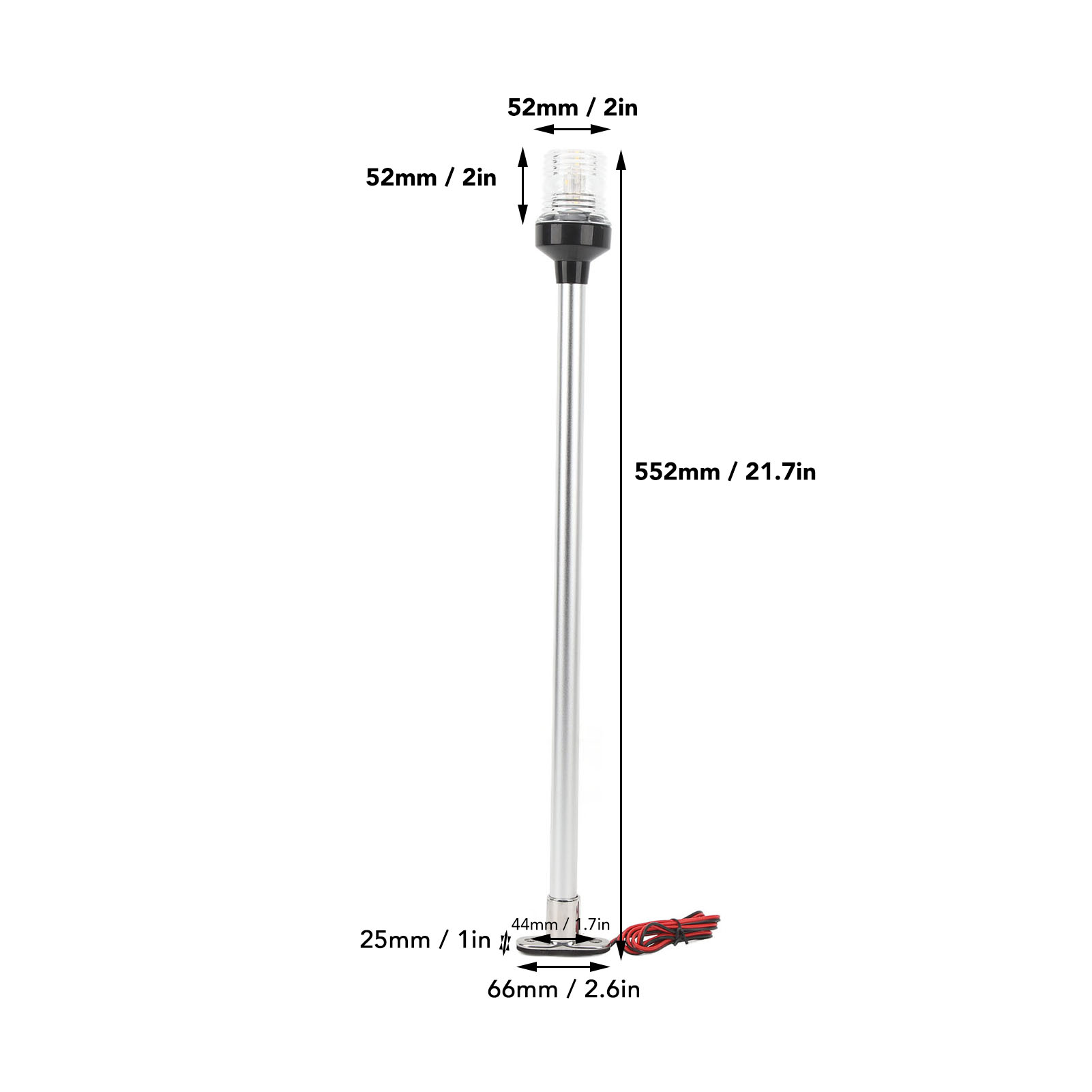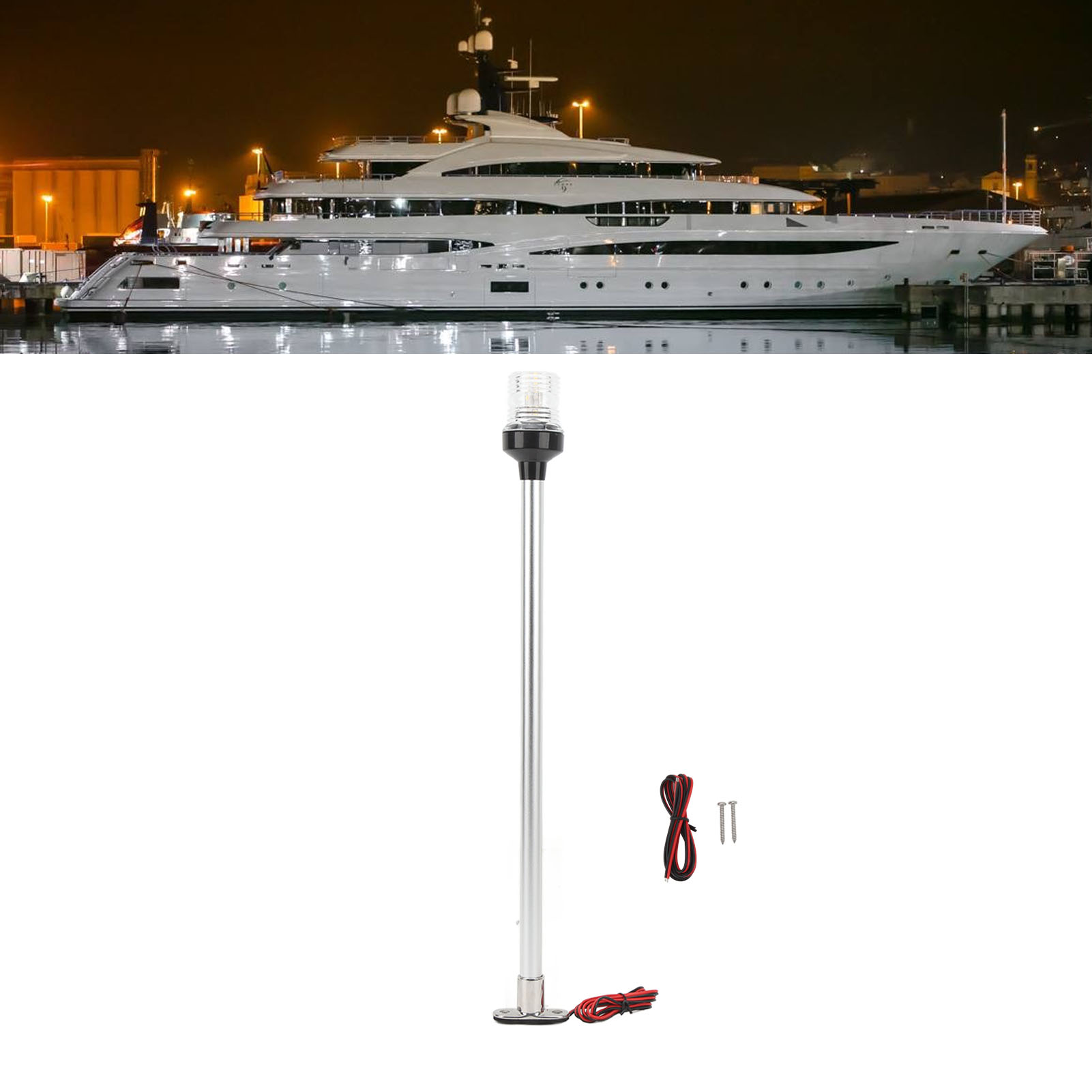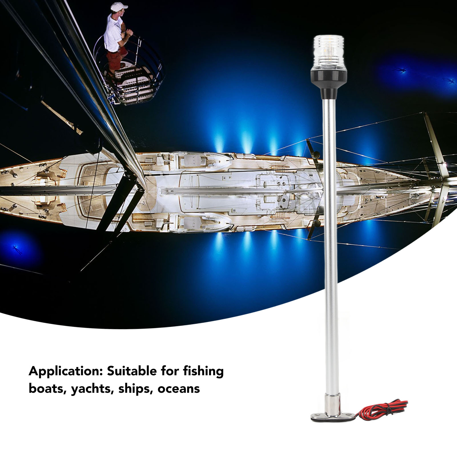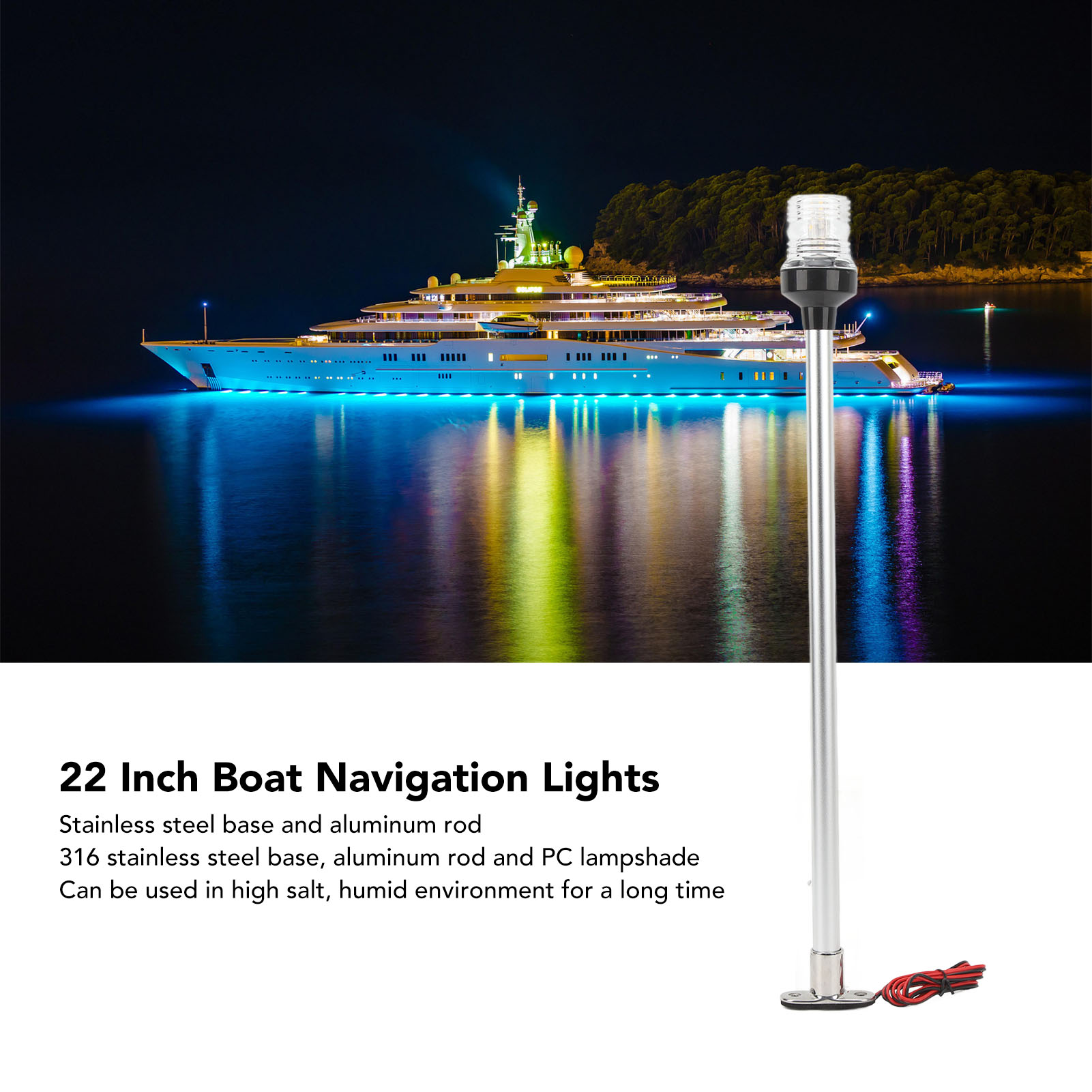 1、Stable Base and Pole: The navigation light has a stainless steel base and aluminum rod, which can stand stably in rough seas without worrying about the base breaking. 2、Sea Water Resistant: The navigation light adopts 316 stainless steel base, aluminum rod and PC lampshade, which can be used in high salt, humid environment for a long time. 3、High Stability: Dual contact base design, non peelable or accidental removal, more stable, not easy to fall off. 4、IP66 Waterproof: The anchor light with waterproof ring completely prevents dust from entering and can withstand the impact of violent waves or strong water mist. 5、High Performance: Suitable for use in seawater, lamp beads are 33LED, visibility is greater than 2 nautical miles, wide voltage 12‑24V.