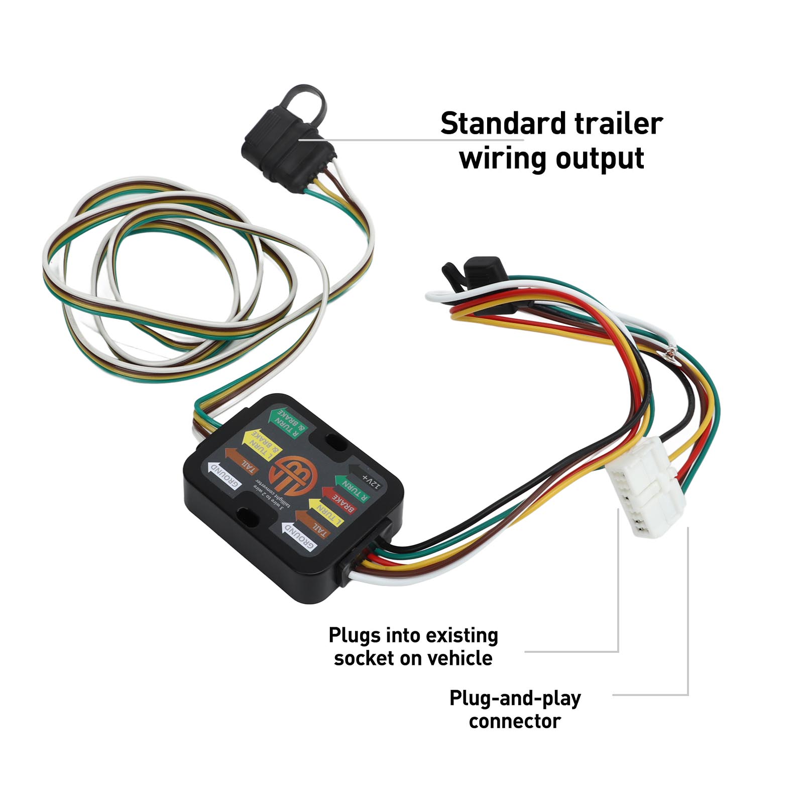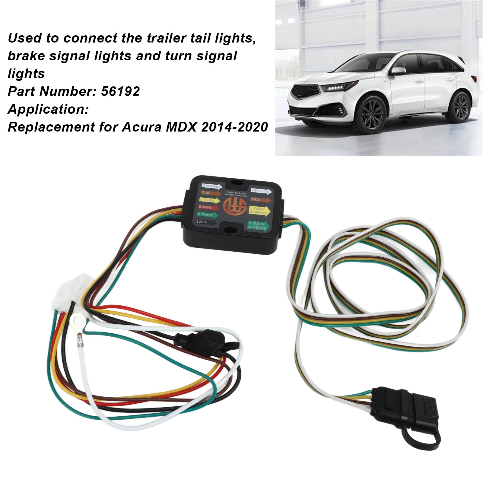 1、Fitment: Trailer wiring harness is replacement for Acura MDX 2014‑2020, which is made according to the prototype model. 2、Part Number: Trailer wiring harness kit replace part number is 56192. Please check the part numbers whether it suits your vehicle before purchasing. 3、Application: 4 pin trailer wire harness can be used to connect the trailer tail lights, brake signal lights and turn signal lights. 4、Excellent Performance: Fast, easy and secure connections, professional manufacturing and stable performance, flexible and sensitive. 5、Simple Installation: The installation is simple, direct replacement, no modification is required, convenient for using, save your efforts.