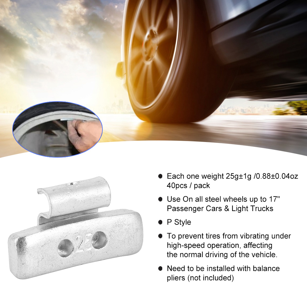 1、P Style wheel balance weights used on all steel wheels up to 17in passenger cars & light trucks. 2、Will prevent the tires from vibrating under high-speed operation, and ensure the normal running of the vehicle. 3、25g±1g /0.88±0.04oz per weight, and 40pcs weights each pack, small weight error with large quantity to meet yor needs. 4、Compensated for the wheel with a balance weight, and the dynamic balance of the wheel is corrected by locally increasing the weight. 5、With this balance weight, there will be no problems such as steering wheel shake and vehicle body shake during high-speed driving.