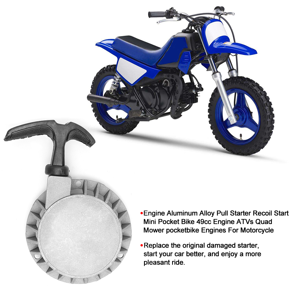 1、Engine aluminum alloy pull starter recoil start mini pocket bike 49cc engine ATVs quad mower pocketbike engines for motorcycle. 2、New hand pull starter with excellent quality and long-term durability, more reliable in use. 3、Replace the original damaged starter, start your car better, and enjoy a more pleasant ride. 4、Suitable for Mini Pocket, Bicycle, Quad, Lawn Mower, Motorcycle Engines. 5、Manufactured to meet standard specification, strictly follow factory quality control.
