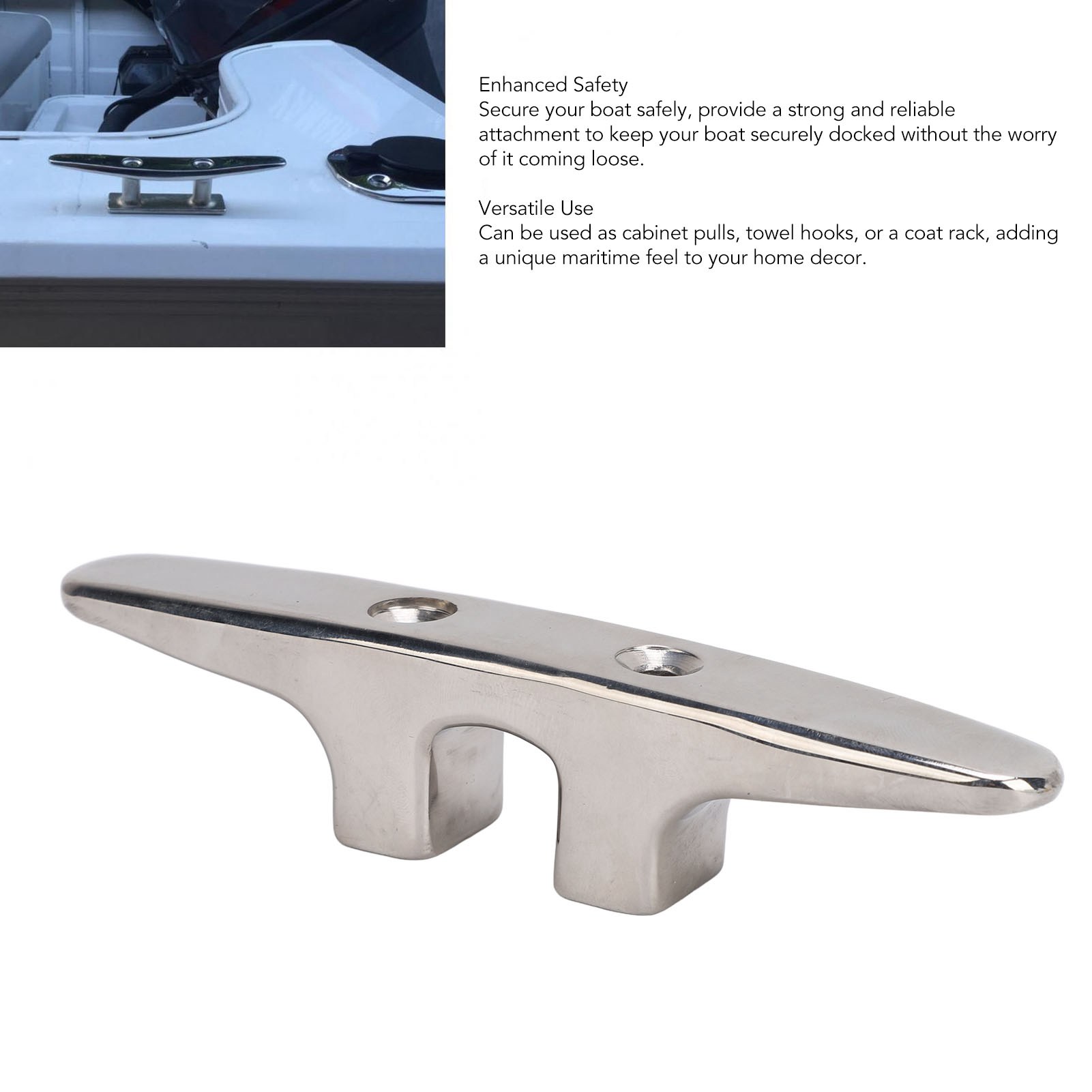 1、Stainless Steel Construction: Made of 316 stainless steel material, the dock cleat is solidly built with internal fillings, making them highly resistant to rust and durable, can withstand harsh marine conditions with ease. 2、Enhanced Safety: Secure your boat, kayak, canoe, yacht, or any other watercraft safely to the boat deck rope cleat. Ensuring a strong and reliable attachment, your boat will stay securely docked without easily coming loose. 3、Versatile Use: In addition to fixing boat, the marine dock rope cleat can also be used as cabinet pulls, towel hooks or as a coat rack to decorate your home with a unique, maritime feel. 4、Easy Installation: The deck rope tie down anchor cleat features easy mounting design, providing a secure attachment point for your watercraft. Simply attach it to your dock or boat deck with screws. 5、Stylish and Functional Design: The stylish design of the deck anchor line tie down cleat not only adds a touch of elegance to your boat, but also provides a reliable and secure mooring solution for your watercraft.