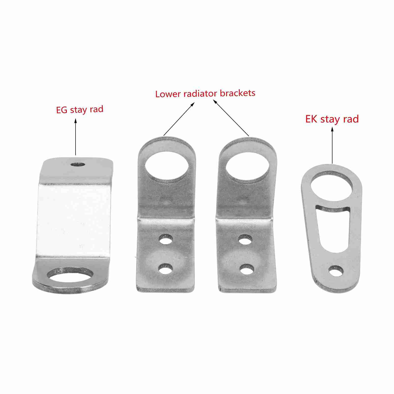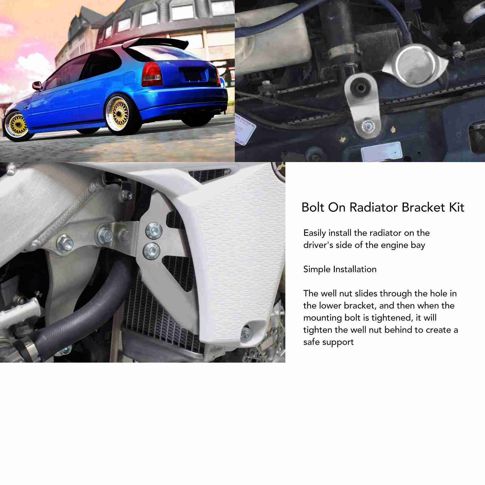1、Applicable Model: The bolt on radiator bracket kit is a replacement for Civic EG DC2 EK 1992‑2000, applicable for K‑Swap K20‑K24 engines. 2、Main Function: These brackets are bolted to the upper and lower brackets, allowing you to easily install the radiator on the driver's side of the engine bay. 3、Material: Comes with hardwares, the upper radiator bracket is plated with silver powder, the lower bracket is made of stainless steel and polyurethane gaskets. 4、Brackets are Included: The package including 2 different lower radiator brackets, one for EG stay rad and one for EK stay rad, dependable to use. 5、Simple Installation: The well nut slides through the hole in the lower bracket, and then when the mounting bolt is tightened, it will tighten the well nut behind to create a safe support.