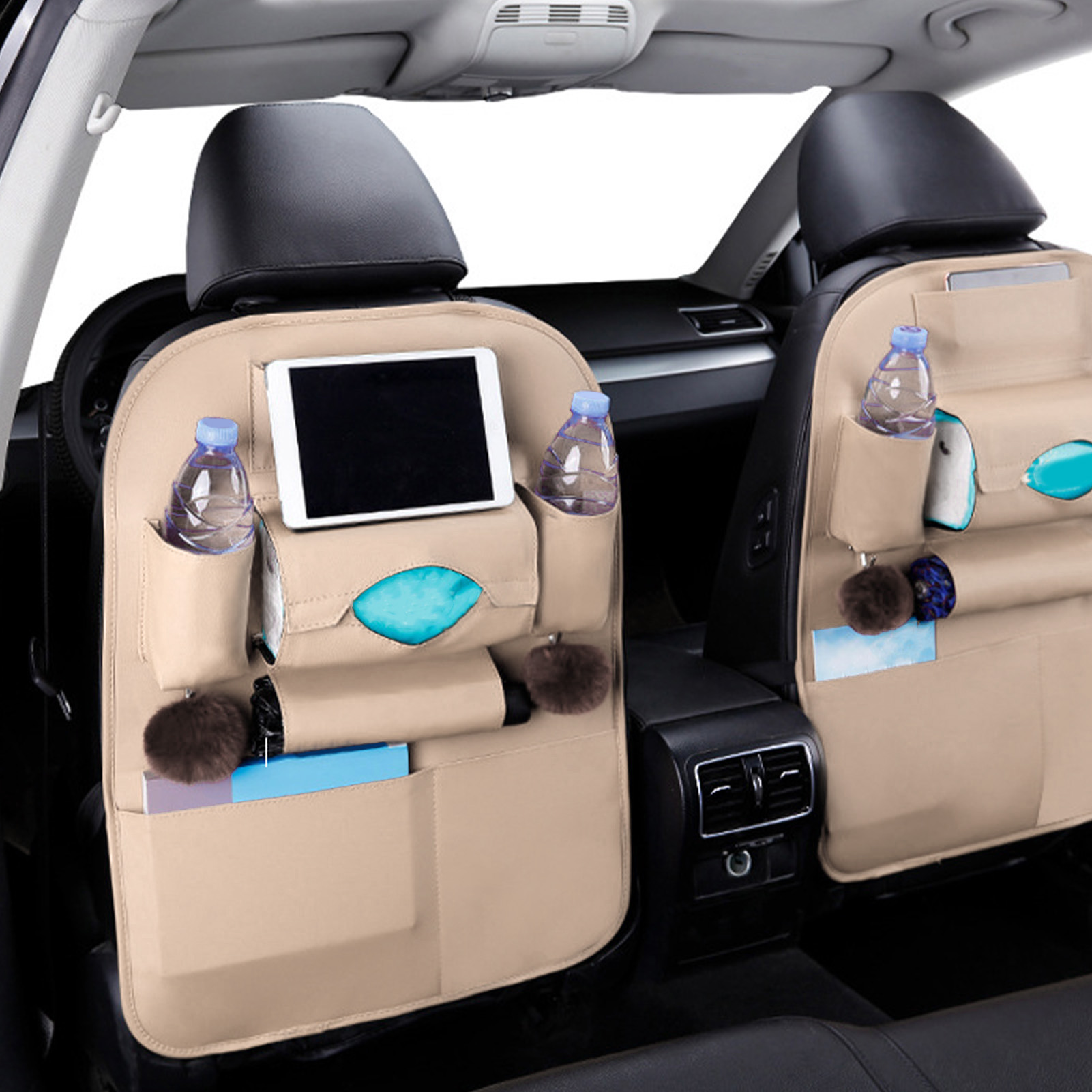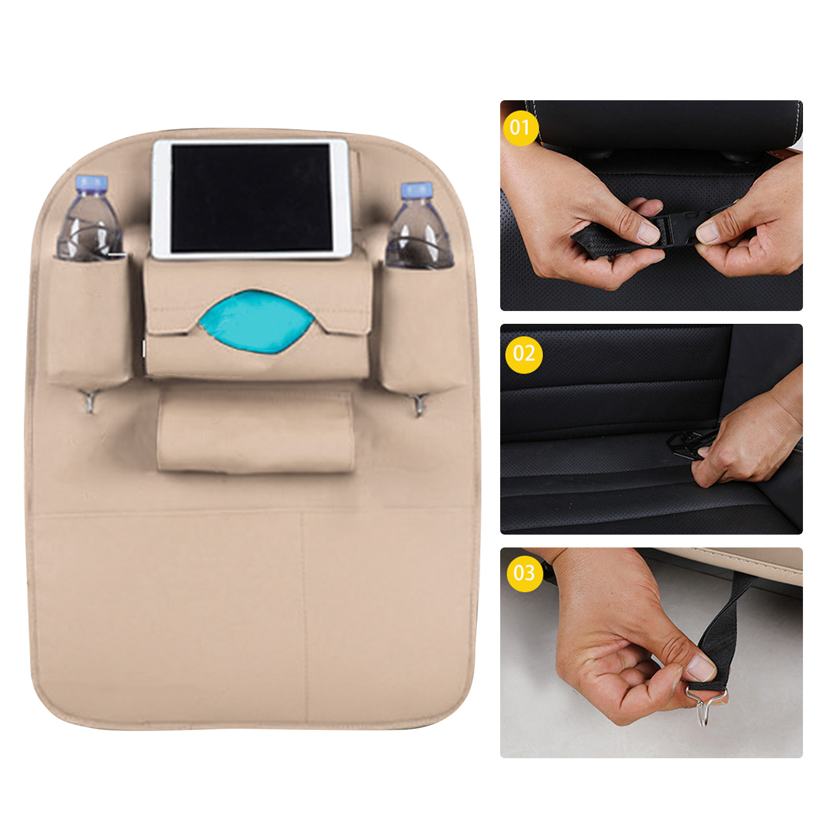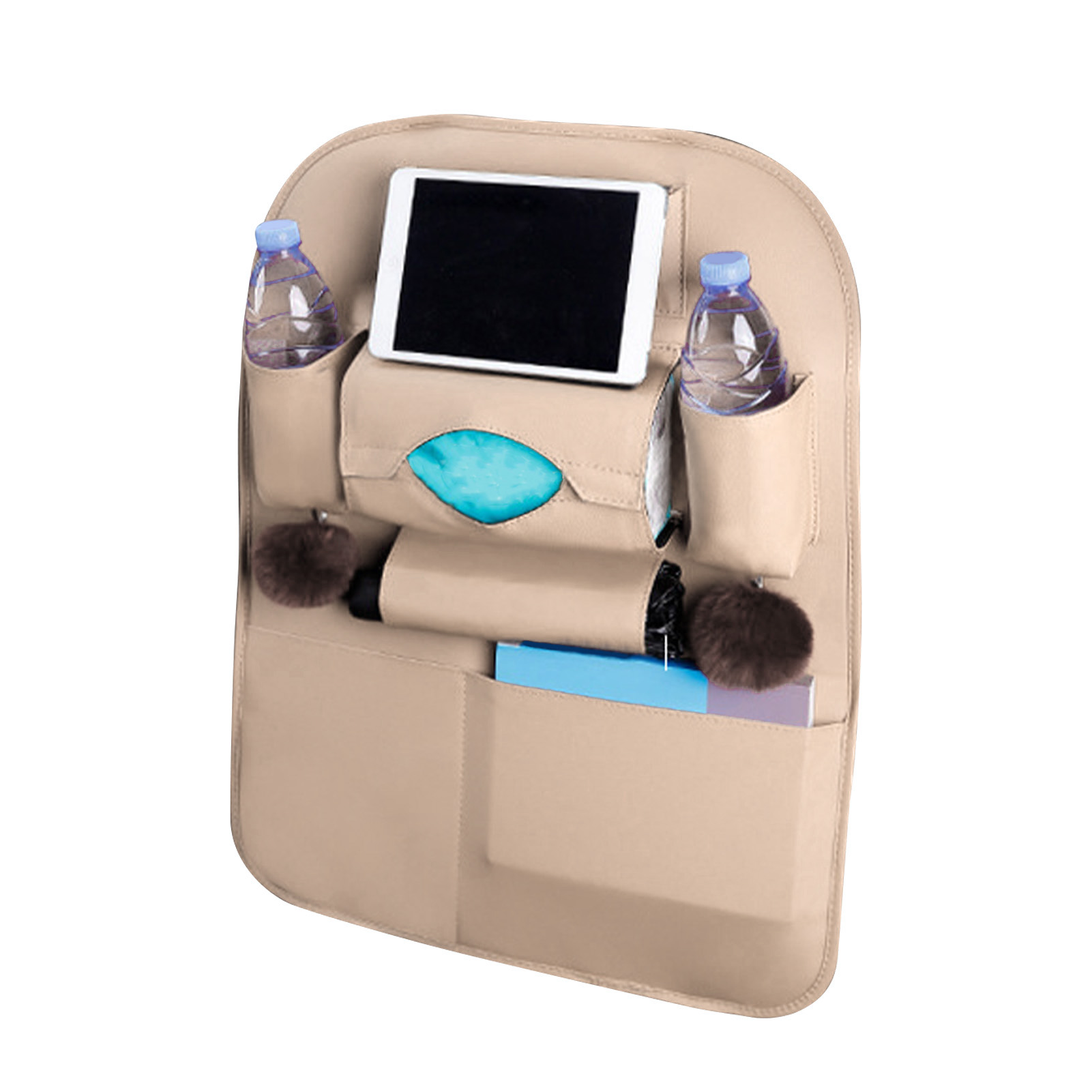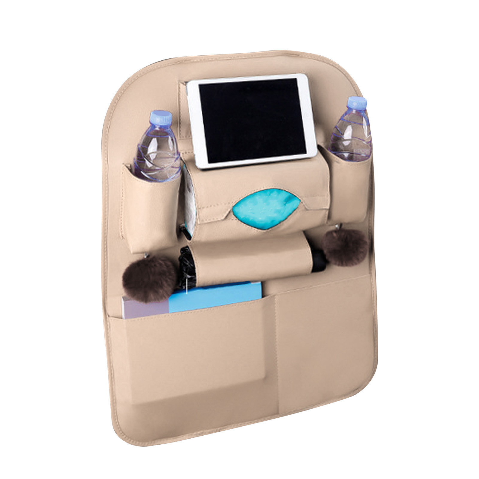 Car Chair Back Bag Multi Pockets Space Saving Protective PU Leather Seat Back Organizer for Water Cup Book Tissue Beige (Normal Version)