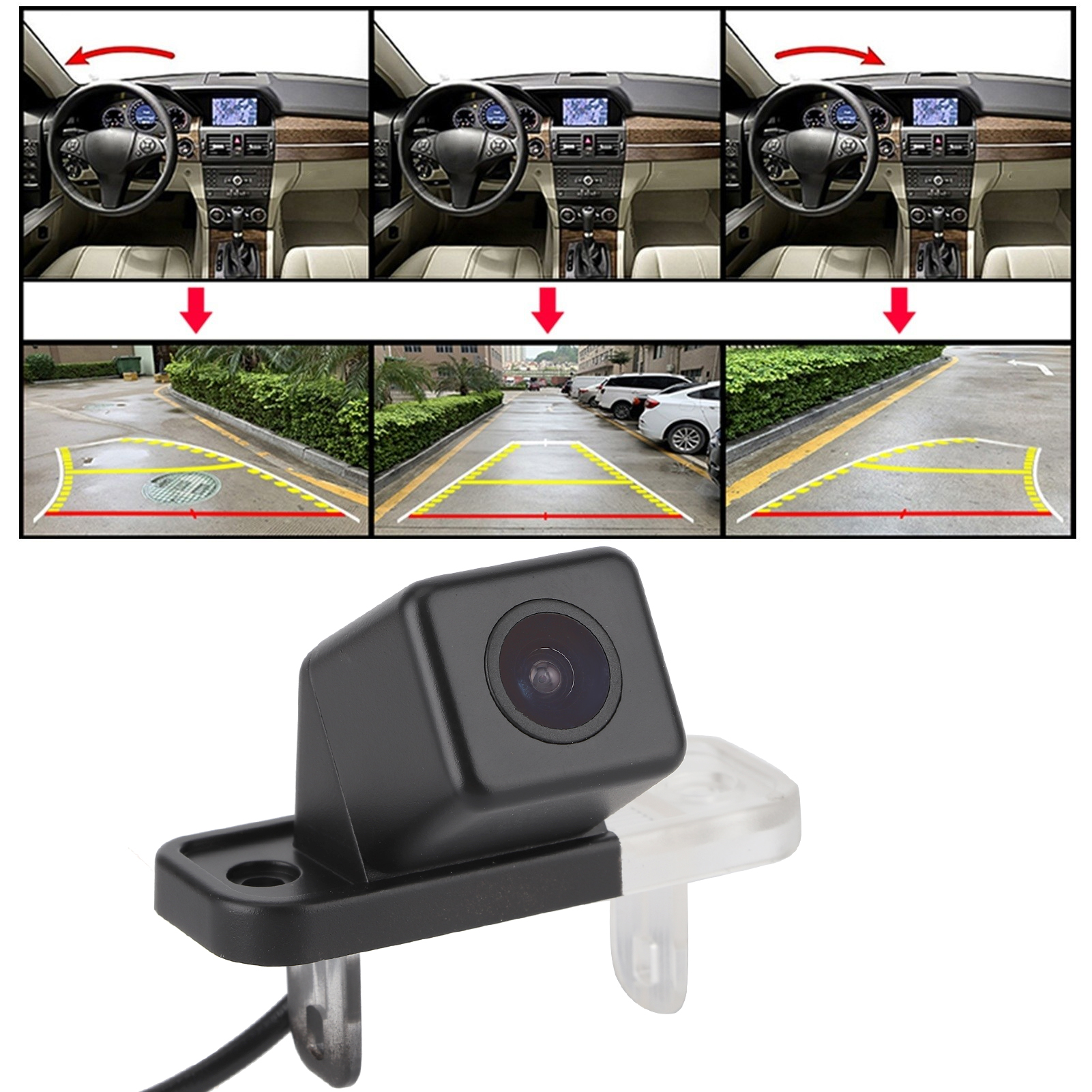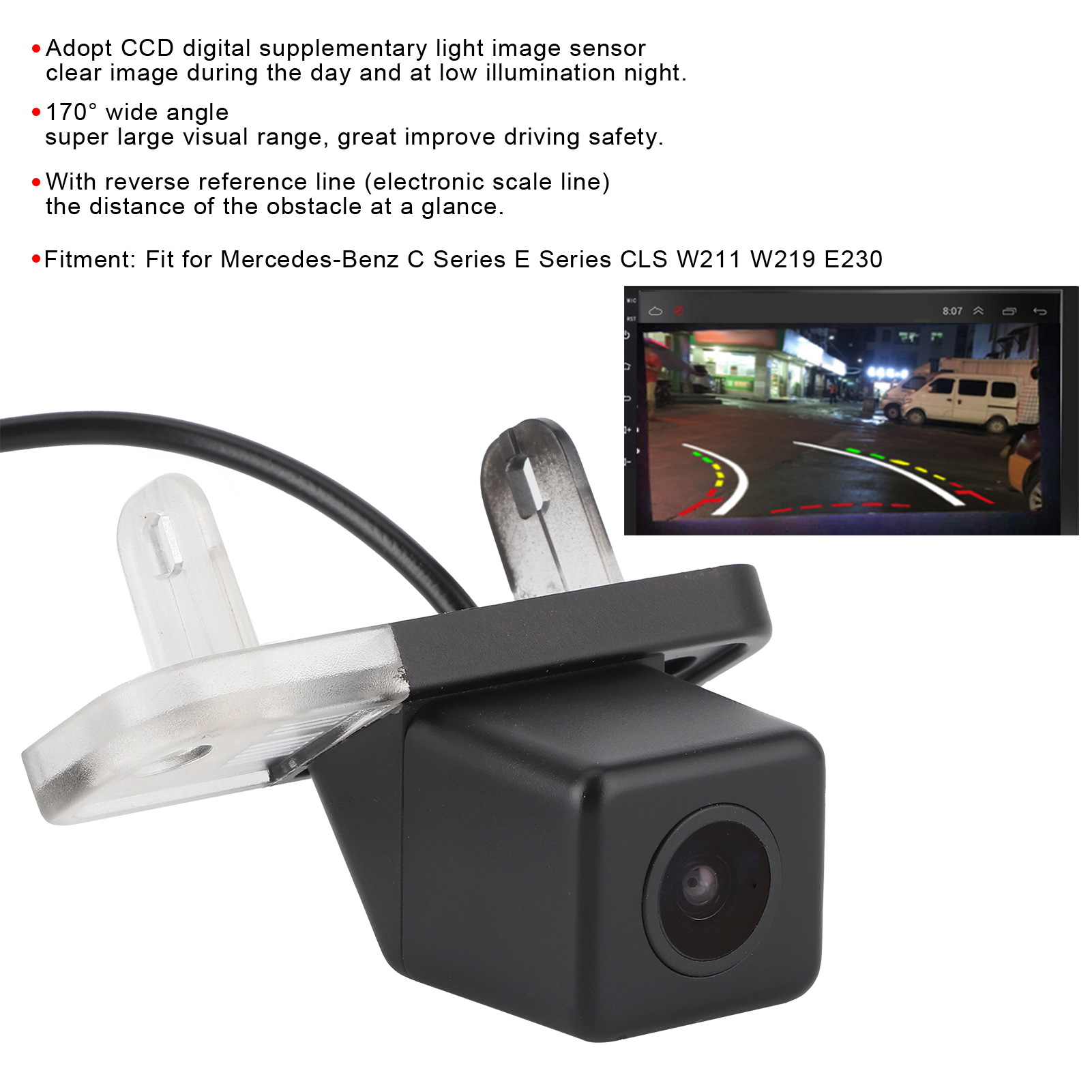 1、With 648x480 resolution, high definition, fit for Mercedes‑Benz C Series E Series CLS W211 W219 E230. 2、Adopt CCD digital supplementary light image sensor, provides clear image during the day and at low illumination night. 3、170 degree wide viewing angle, super large visual range, greatly enhance the safety of reversing. 4、With reverse reference line (electronic scale line), the distance to the obstacle is clear at a glance. 5、Passed high-pressure water immersion test and 12-hour power-on aging test, multi-layer waterproof.