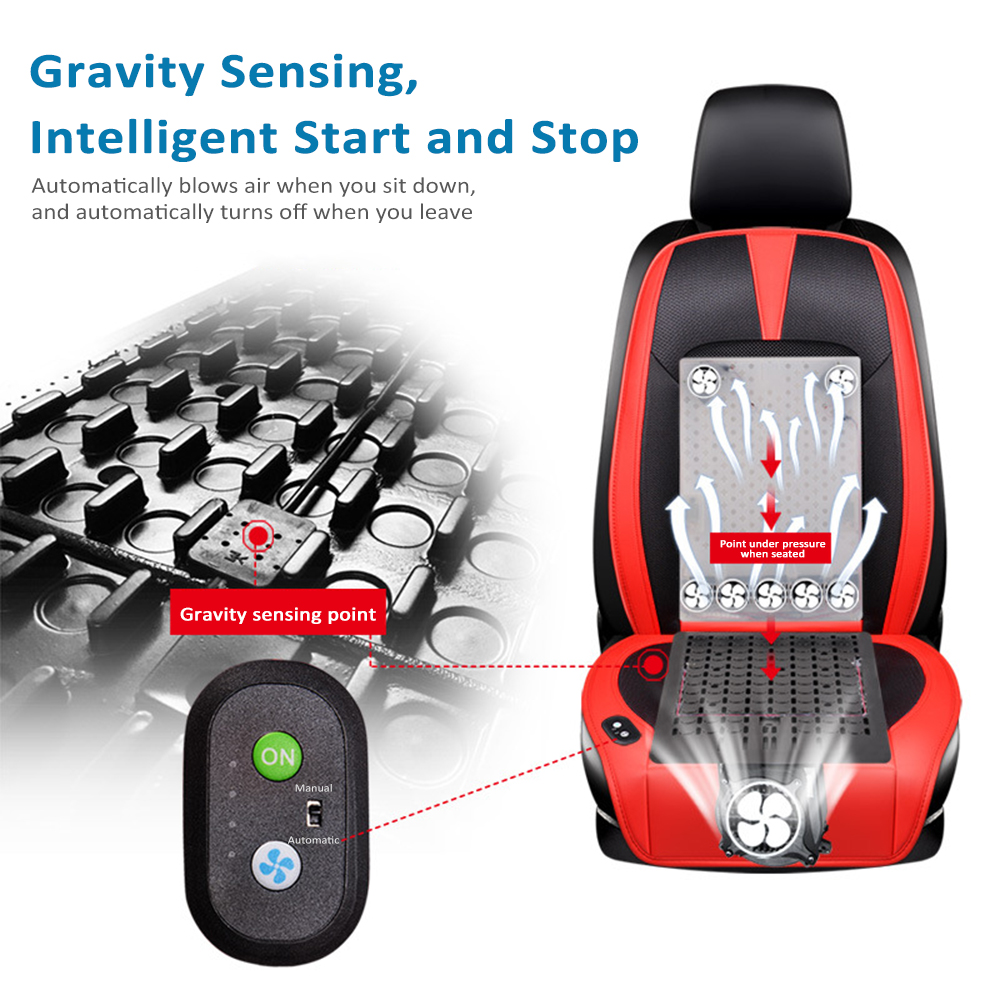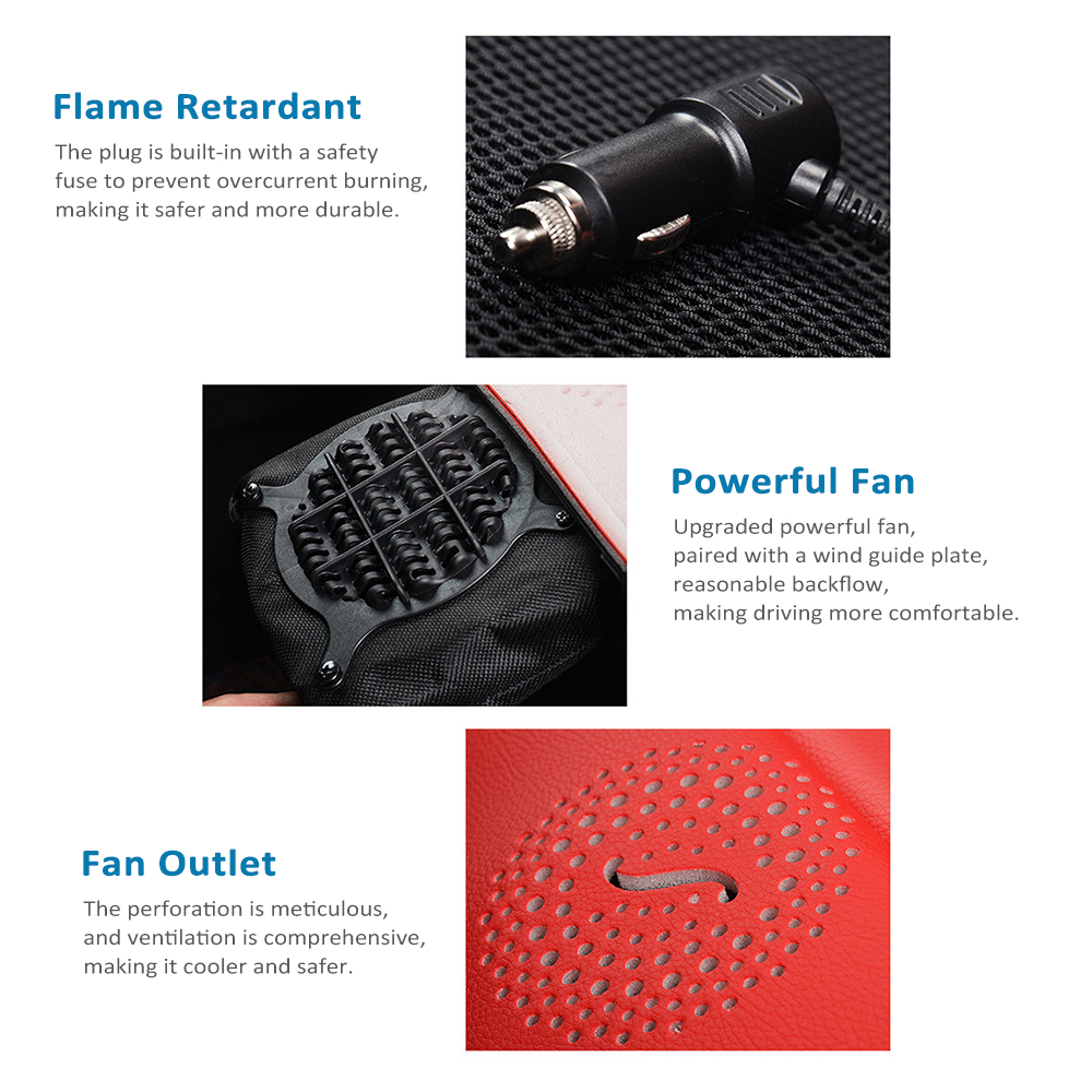 1、Premium Material: The car seat cushion is made of premium sandwich fabric, resistant to sun exposure and does not heat up. Its 3D hollow design ensures strong breathability, preventing discomfort and sweat from prolonged sitting. Additionally, it boasts quick-drying, moisture-wicking attributes and is resistant to bacteria and mites. 2、Intelligent Gravity Sensing: Equipped with smart gravity sensing technology, the seat cushion automatically starts blowing air when you sit down and shuts off when you get up. This intelligent cushion provides convenience and energy efficiency. 3、Powerful and Quiet Fans: The seat cushion for cars features one hidden front independent large fan (12W, 3000 RPM) and seven back fans (17W, 5000 RPM). These high-speed, quiet fans ensure larger and more even air distribution for optimal comfort.