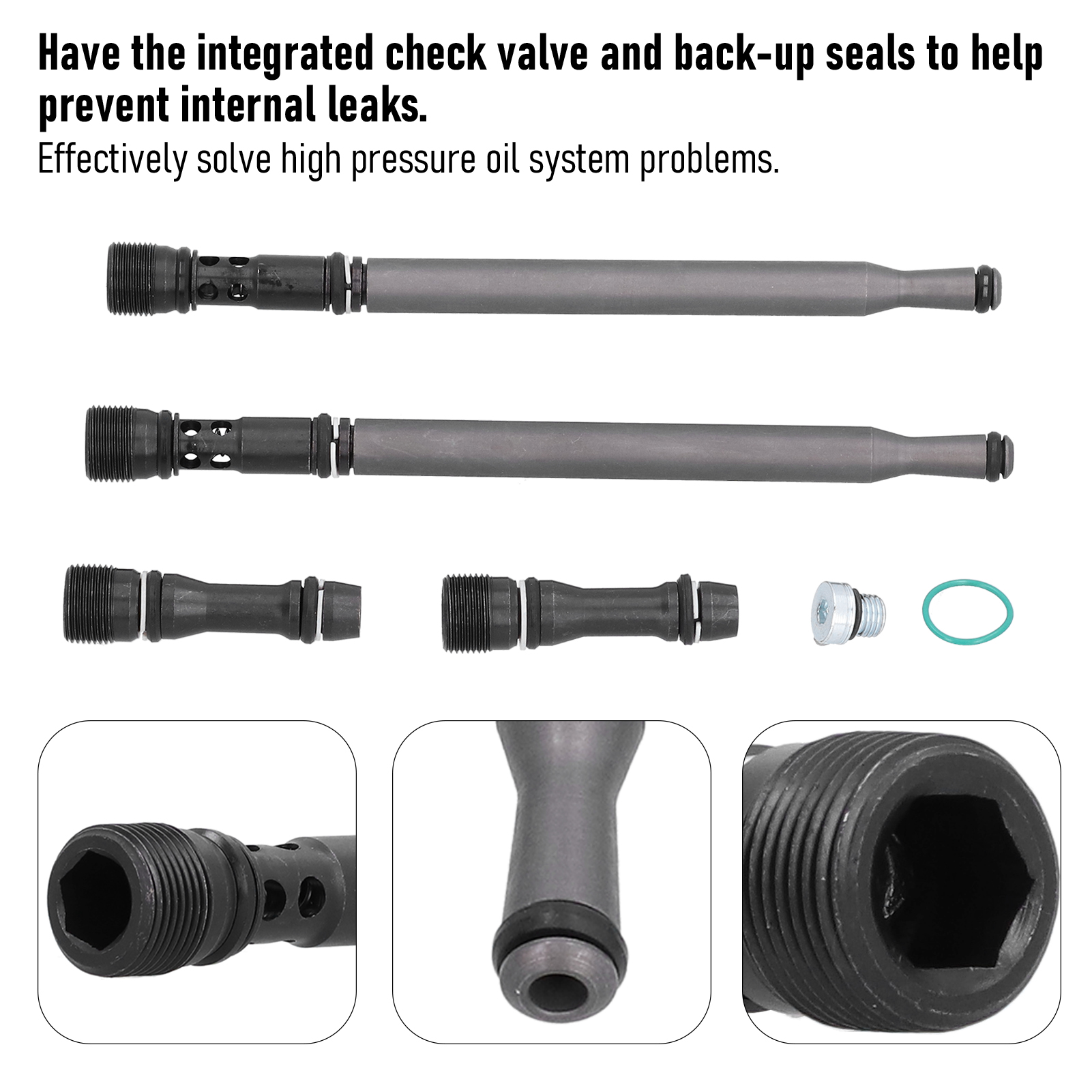 1、A replacement for Ford F250/350/450/550 6.0L Diesel Truck 2004‑2007 and replacement for Ford E‑Series 6.0L Diesel Van 2004‑2010. 2、The replacing reference OEM number is 6E7Z-9A332-A, W302908, 3C3Z-9K042-A, W302675. 3、The stand pipes have the integrated check valve and back‑up seals to help prevent internal leaks. 4、The upgrade stand pipes and dummy plugs can effectively solve high pressure oil system problems. 5、Replace the stand pipes and dummy plugs before they go bad and leave you stranded is recommended.