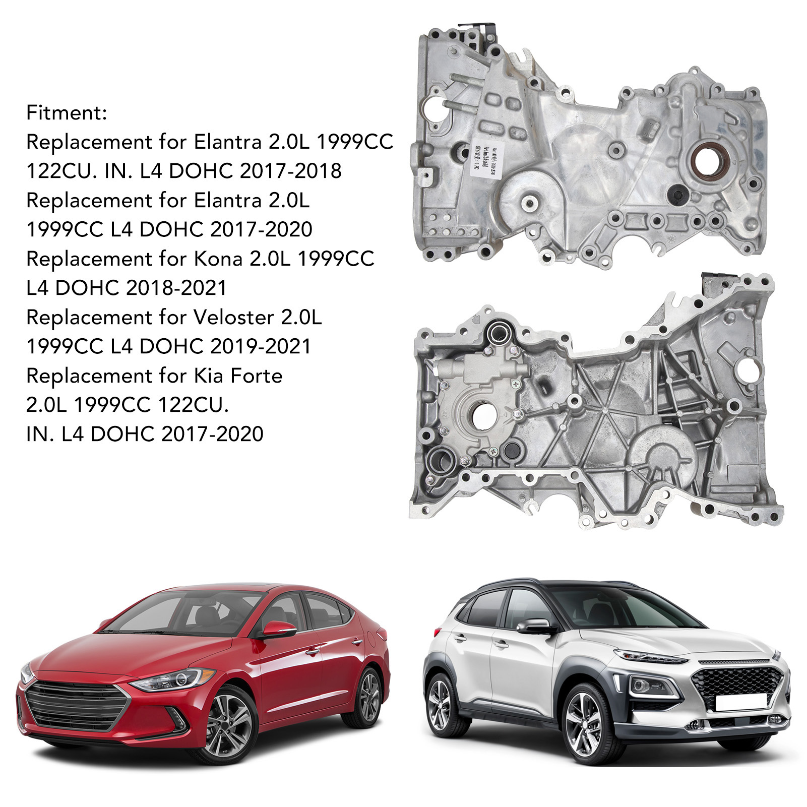 1、Fitment: Fit for Elantra 2.0L 2017‑2018; Fit for Kona 2.0L 2018‑2021; Fit for Veloster 2.0L 2019‑2021; Replacement for Kia Forte 2.0L 2017‑2020. 2、OEM Numbers: The part number for reference are 213502E740, 21350 2E740, please confirm whether it is consistent with the OE you need. 3、Function: The oil pump timing chain cover protects and maintains the normal operation of the engine's timing chain drive system, ensuring proper lubrication of the oil pump. 4、Rugged Construction: Oil pump timing chain cover is made from high strength aluminium alloy, rustproof, anti rust, impact proof, sturdy and durable. 5、Accurate Fit: Original standard, the manufacturing in accordance with strict OE specifications, direct replacement, perfectly fit your car.