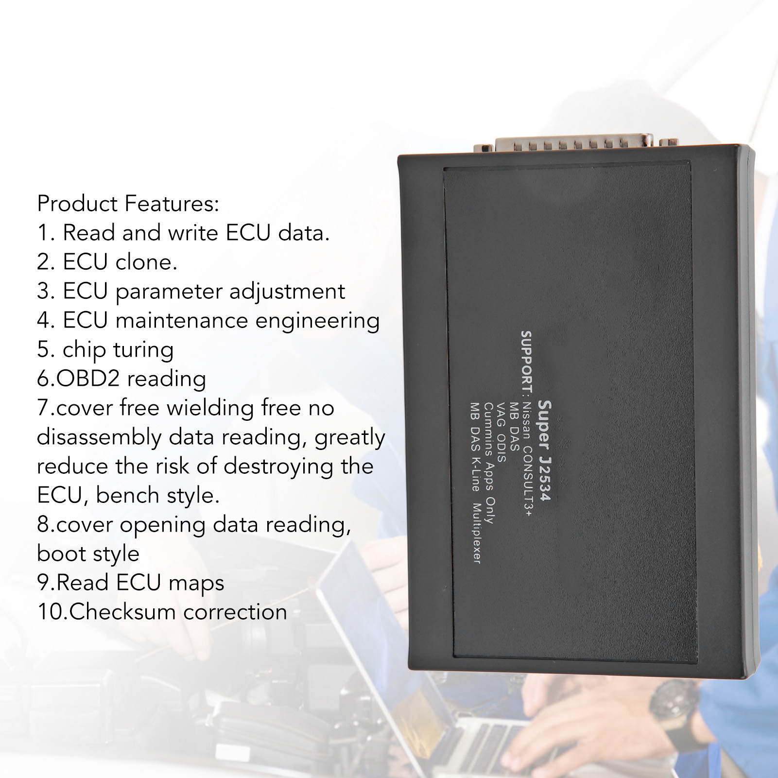 1、Fitment: Replacement for Isuzu Transtron; Replacement for Hyundai; Replacement for Greatwall DCM6.2AP; Replacement for Ford; Replacement for Mitsubishi, etc. 2、Multifunctional: The diagnostic tool can read ECU map, read flash and ep files, powertrain tuning, calibration and correction, transmission tuning, cover open data reading. 3、Reliable Performance: Chip tuning tool has excellent diagnostic function and does not produce calibration errors, undergo strict quality inspection and factory testing for excellent performance and reliable quality. 4、Durable Material: ECU programmer is made of ABS and metal materials, durable, high strength, impact resistance, not easy to damage, not easy to aging, can be used for a long time. 5、Portable: ECU chip tuning tool is easy to install and use, no complicated operation is required, compact and lightweight design, easy to transport and carry.