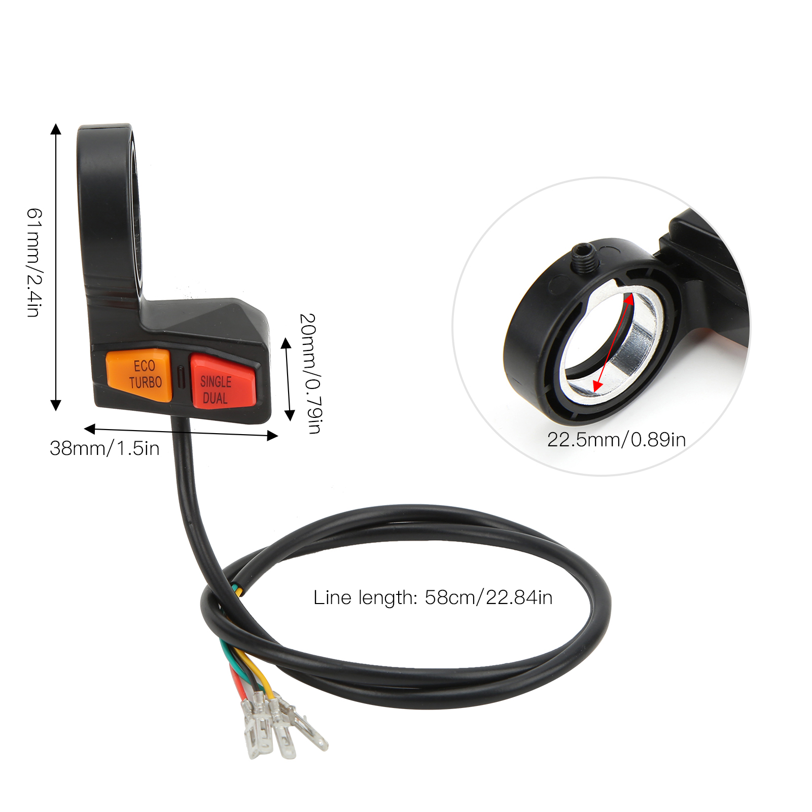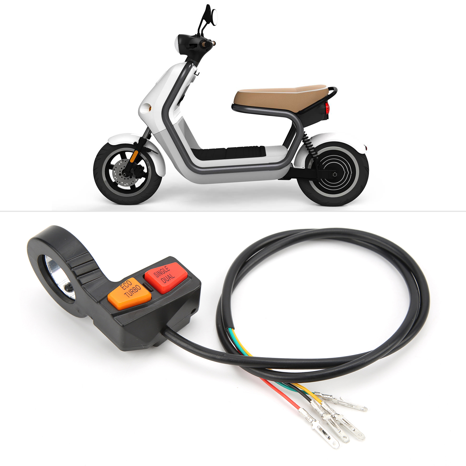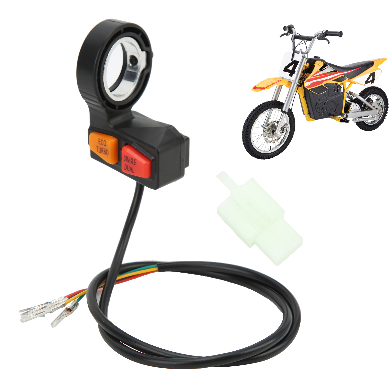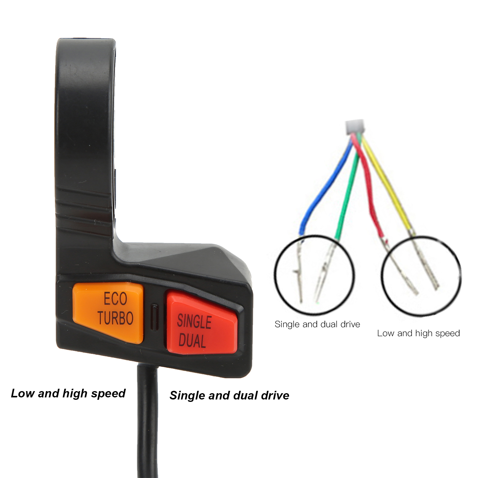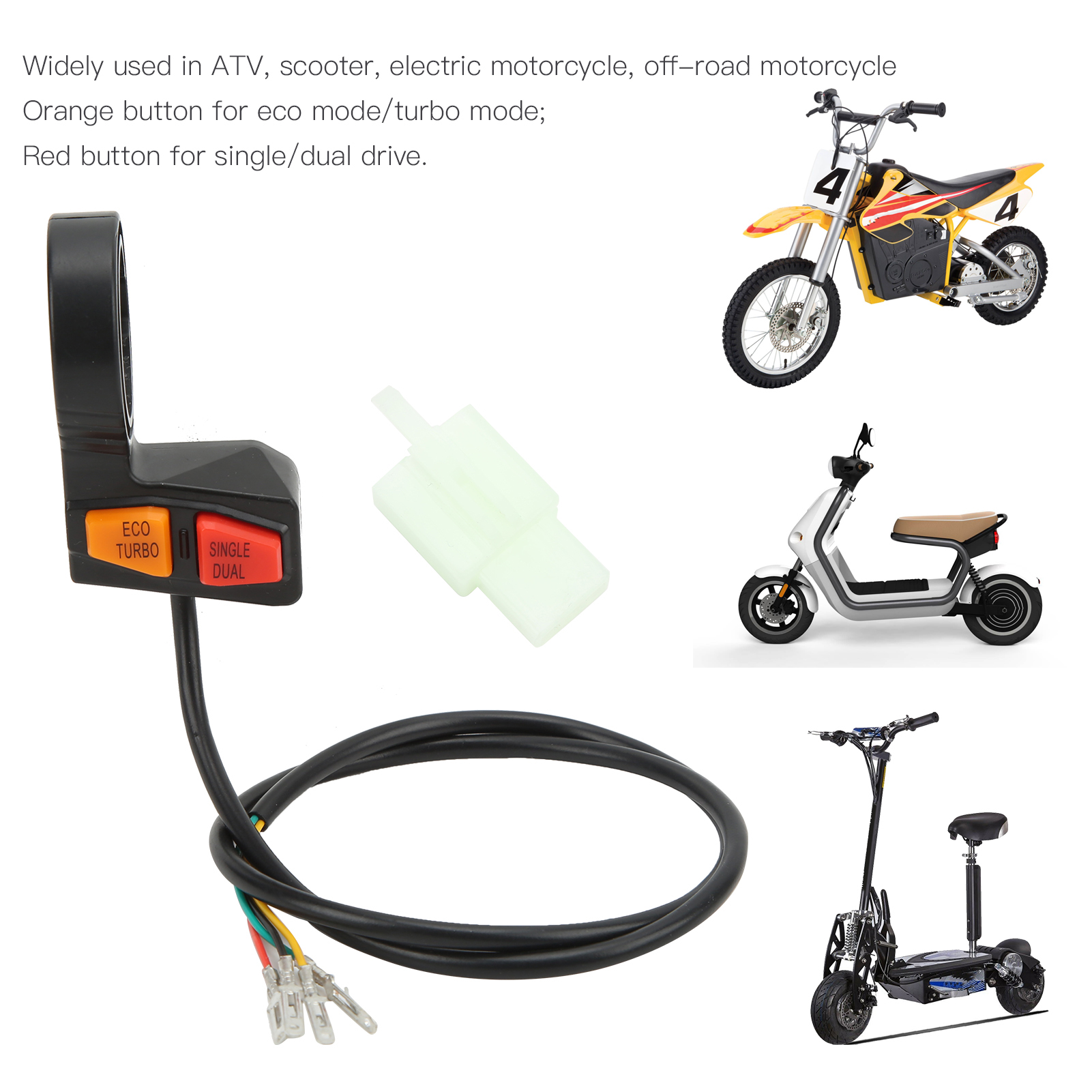 1、Multifunction Switch: This switch is for dual motor driven scooter, you can use it to control high low speed and single or dual motor driven. 2、Wide Application: This handlebar switch with 58cm cable, widely used in ATV, scooter, electric motorcycle, off‑road motorcycle modification. 3、Button Switch: The orange button for eco mode/turbo mode; the red button for single/dual drive. Ipx4 waterproof switch, durable for a long time. 4、Long Durability: Made of high quality ABS plastic material for excellent anti‑aging and wear resistance performance. 5、Good Replacement: Built to strict quality control standards, simple wiring, easy removal and installation, direct replacement of old or broken switches.