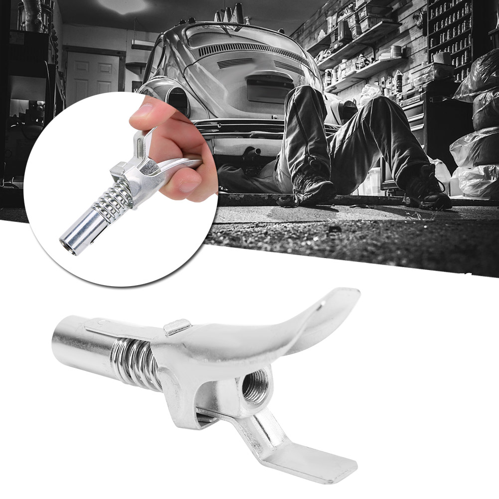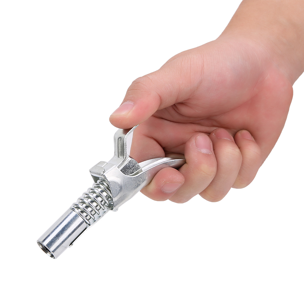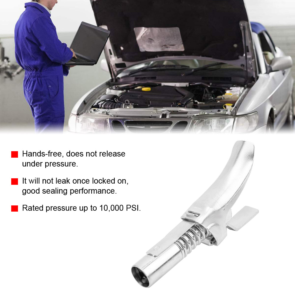 1、Hands-free, does not release under pressure 2、It will not escape once locked on, good sealing performance 3、Rated pressure up to 10,000 PSI 4、Compatible with all grease guns 5、Comes with free replacement seal and jaws. Fully rebuildable.