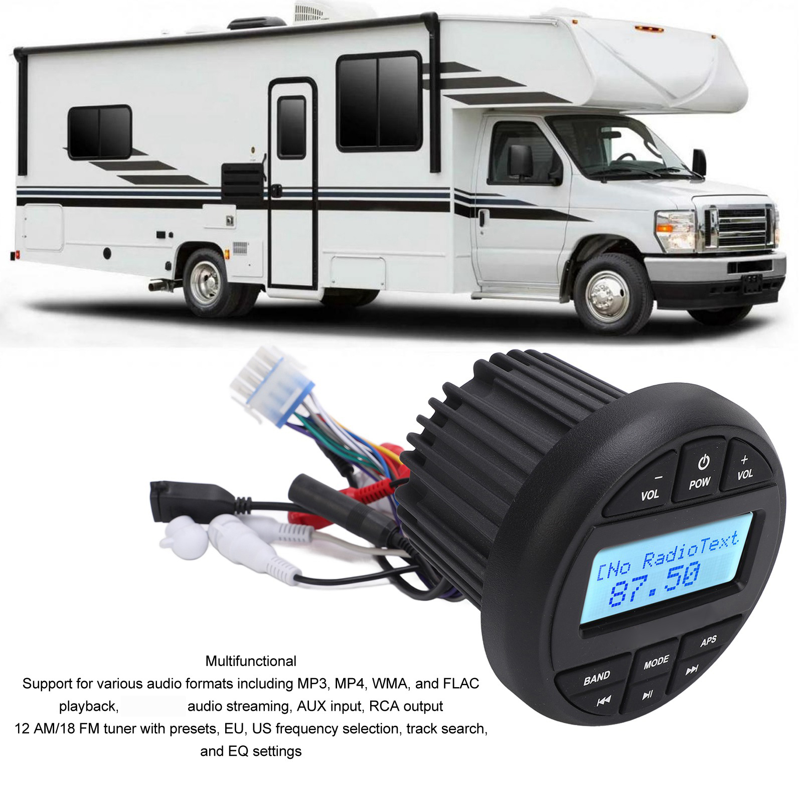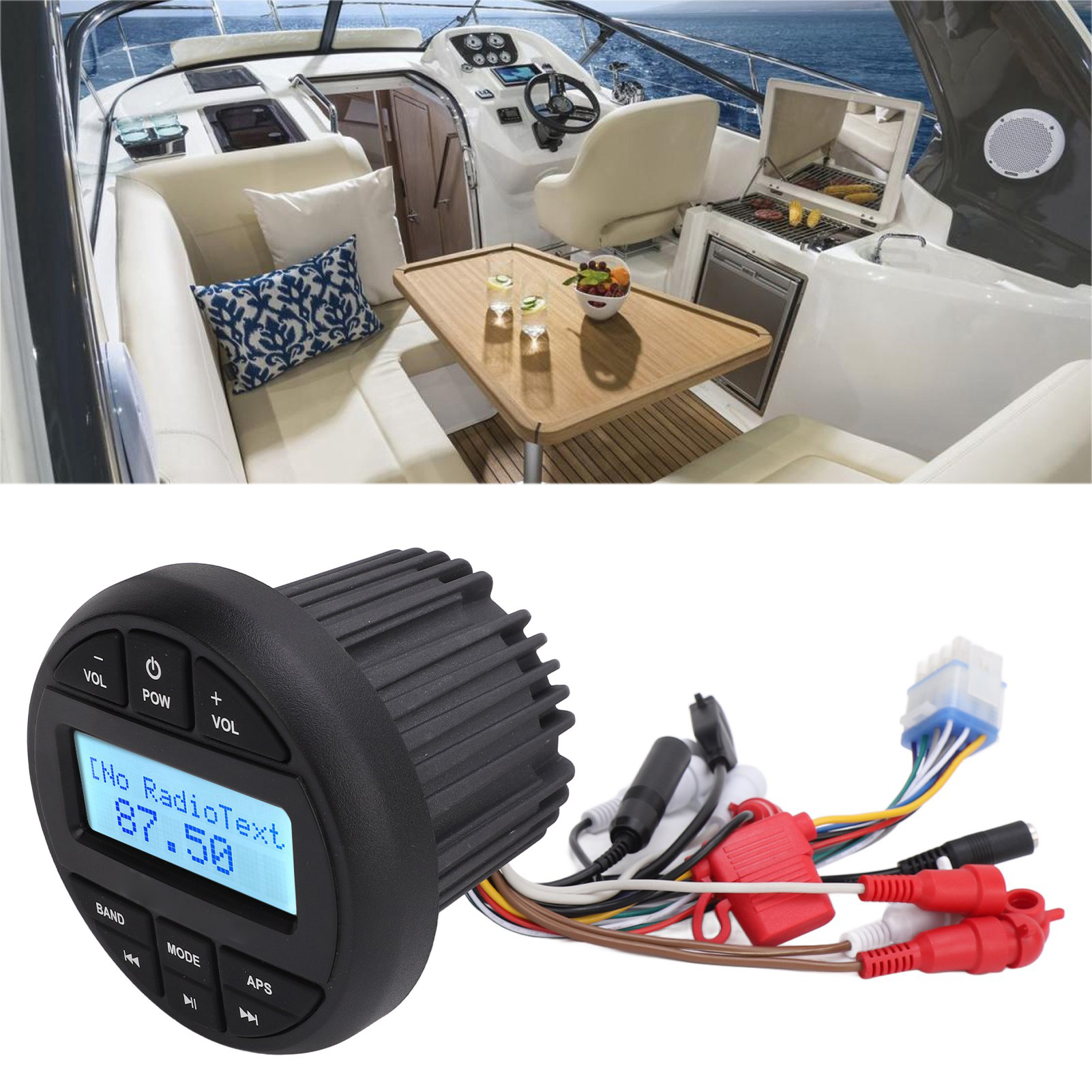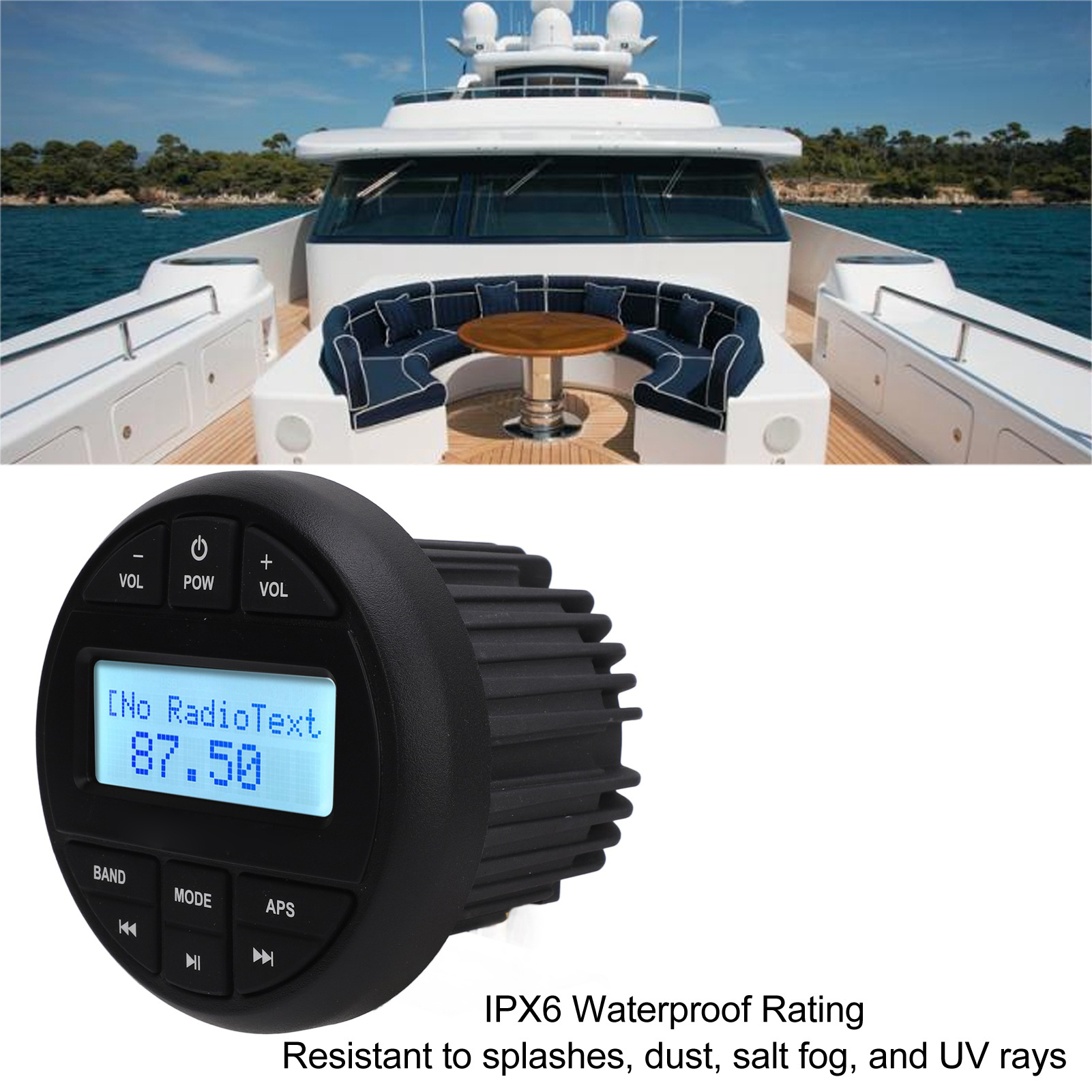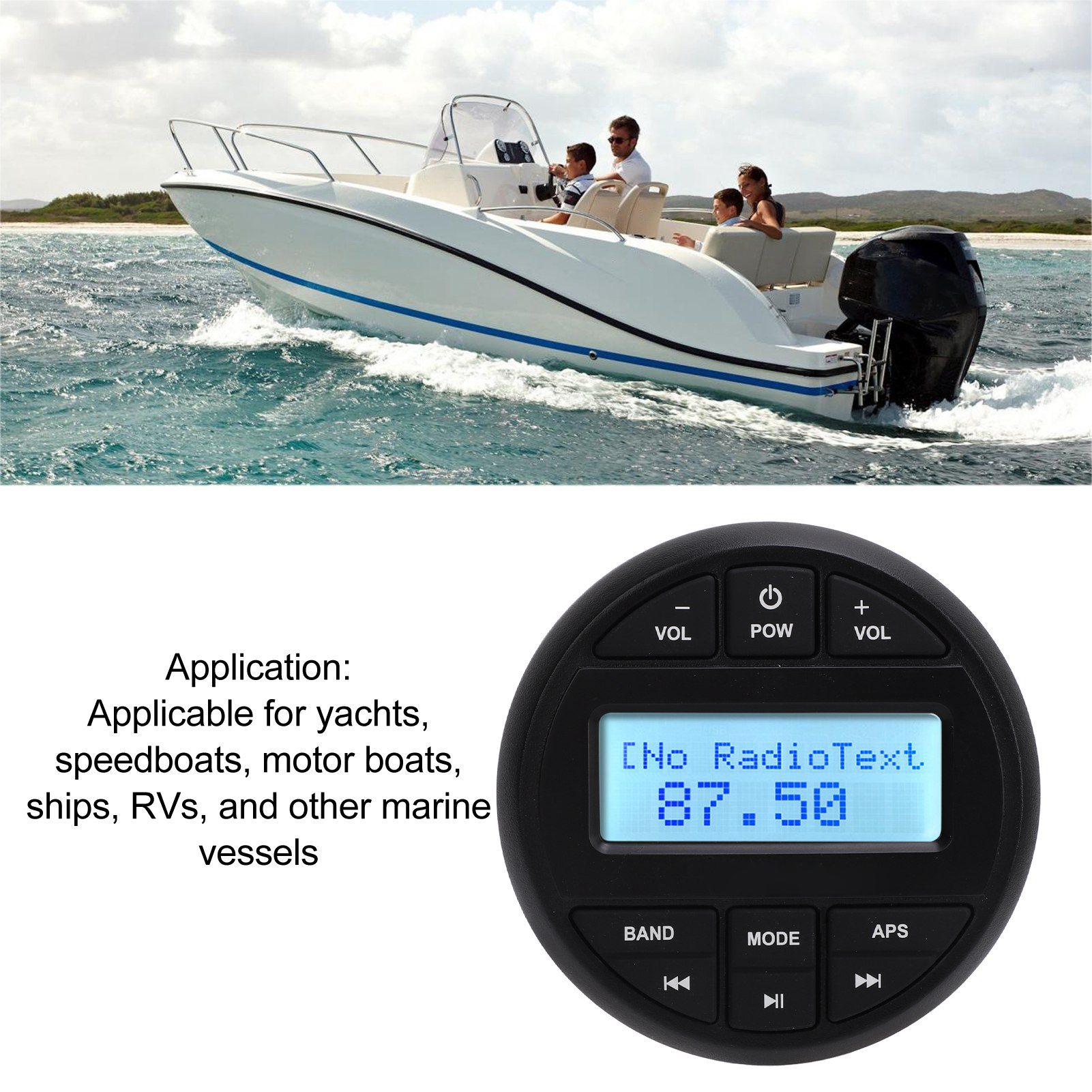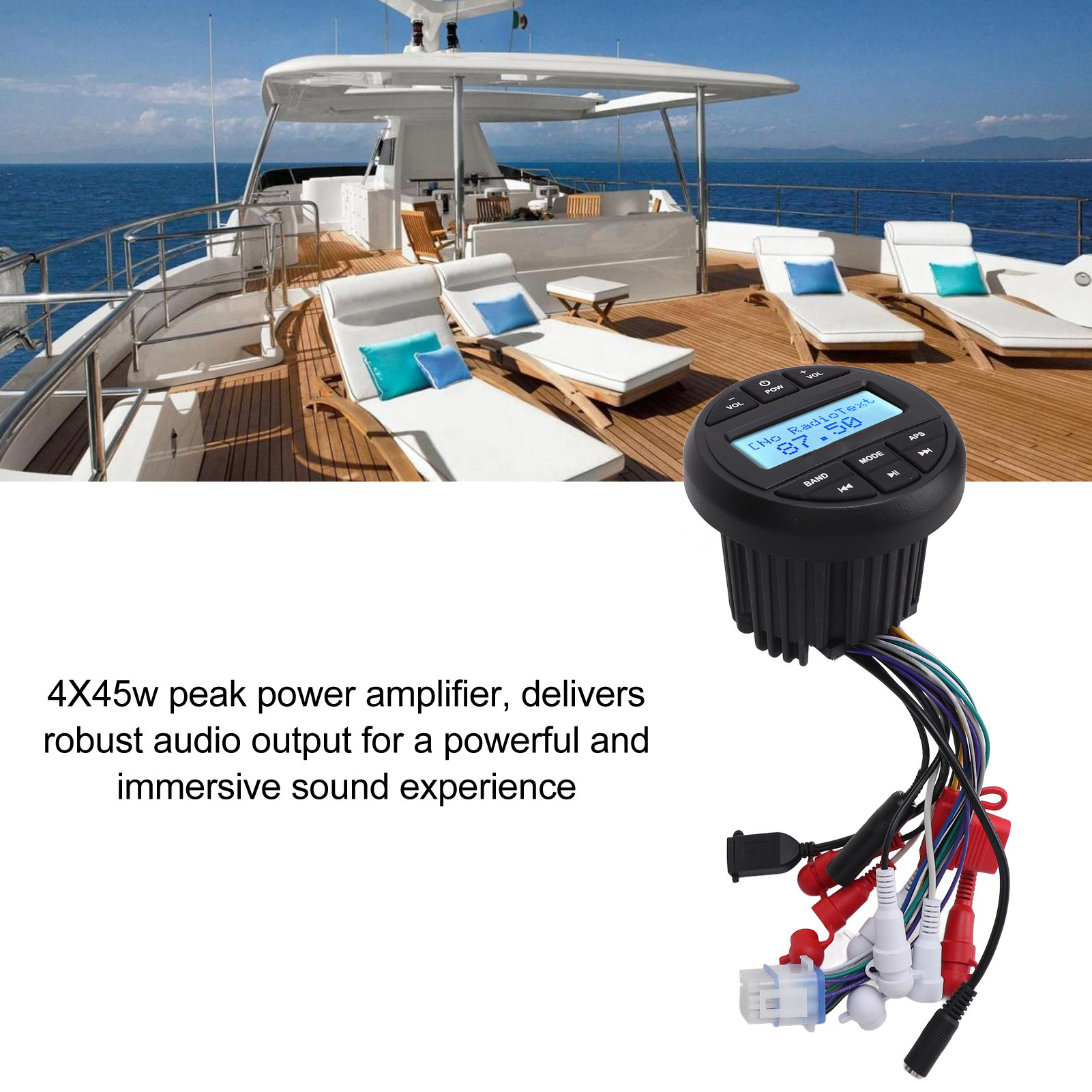 1、Multifunctional: Support for various audio formats including MP3, MP4, WMA, and FLAC playback, Bluetooth audio streaming, AUX input, RCA output, 12 AM/18 FM tuner with presets, EU, US frequency selection, track search, and EQ settings. 2、USB and Radio Playback: Users can play music through the USB port or tune in to AM, /FM radio stations for the latest music, news, sports, and more, offering flexibility in entertainment options. 3、High Power Amplification: With a built in 4X45w peak power amplifier, this marine MP3 player delivers robust audio output for a powerful and immersive sound experience on board. 4、IPX6 Waterproof Rating: Designed with an IPX6 waterproof rating, this MP3 player is resistant to splashes, dust, salt fog, and UV rays, ensuring durability and longevity in marine environments. 5、Wide Applications: Suitable for use on yachts, speedboats, motor boats, ships, RVs, and other marine vessels, as well as in bathrooms or other wet areas, adaptable to various marine and recreational settings.