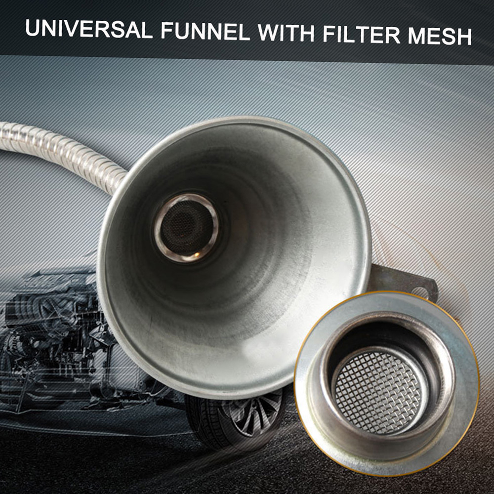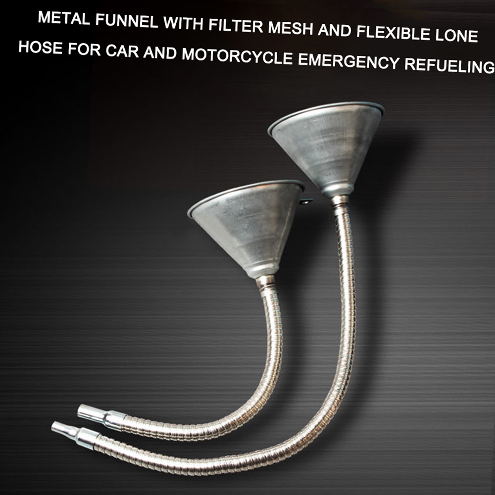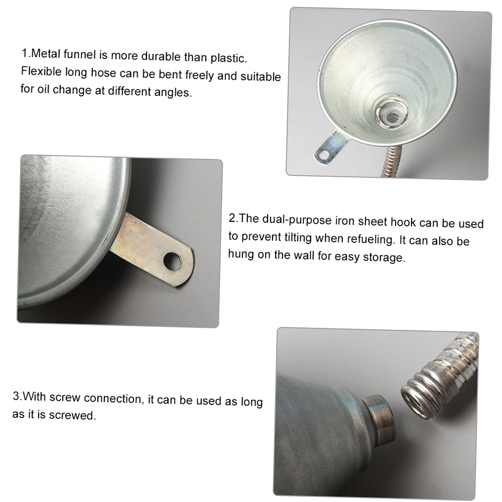 1、Wide applications: for car and motorcycle emergency refueling and also can be used as water filler. 2、Meatal funnel is more durable than plastic. Flexible long hose can be bent freely and suitable for oil change at different angles. 3、This funnel with filter mesh for effective filtering of impurities. 4、The dual-purpose iron sheet hook can be used to prevent tilting when refueling. It can also be hung on the wall for easy storage. 5、With screw connection, it can be used as long as it is screwed.