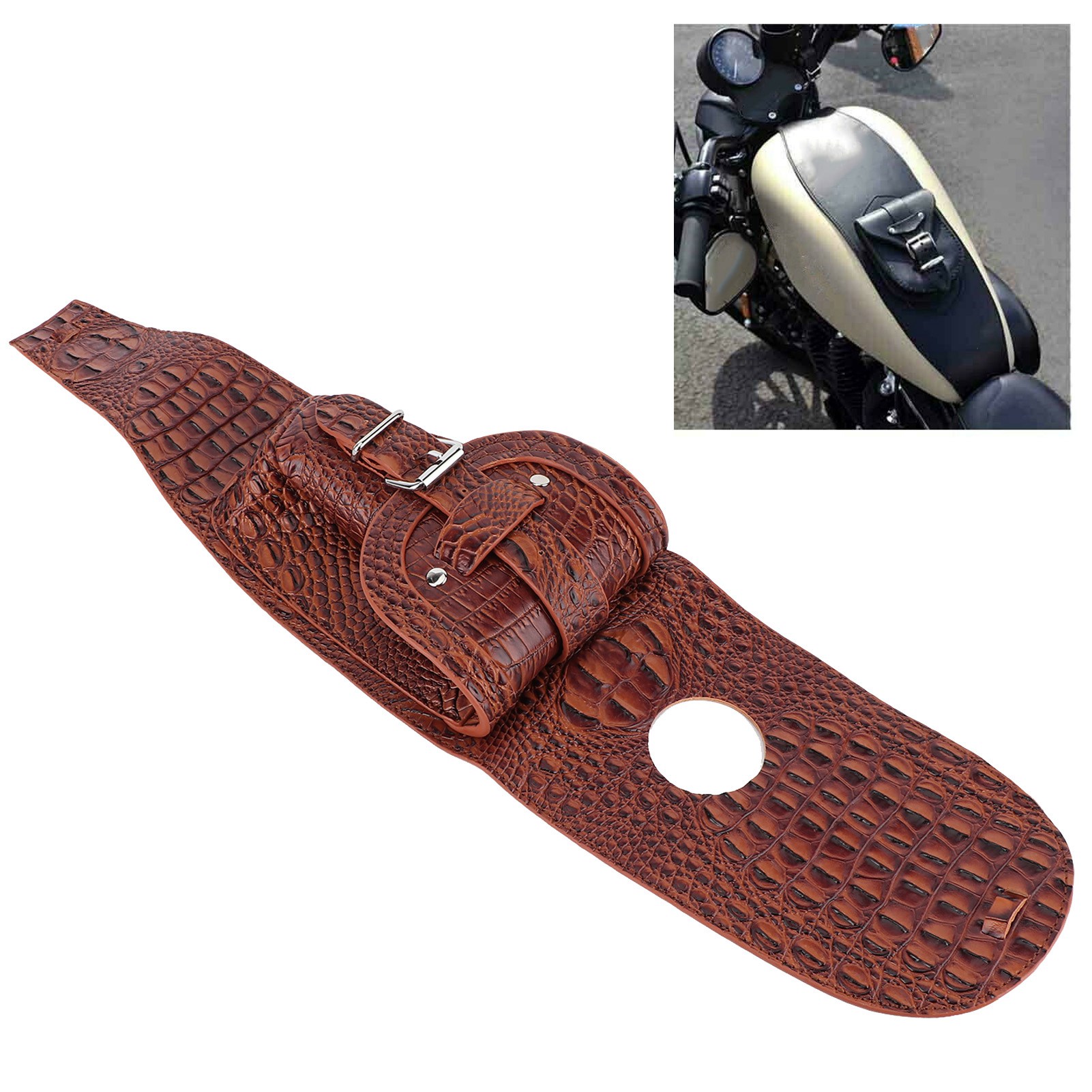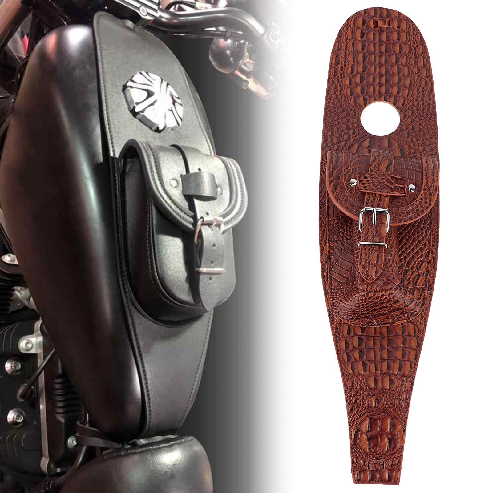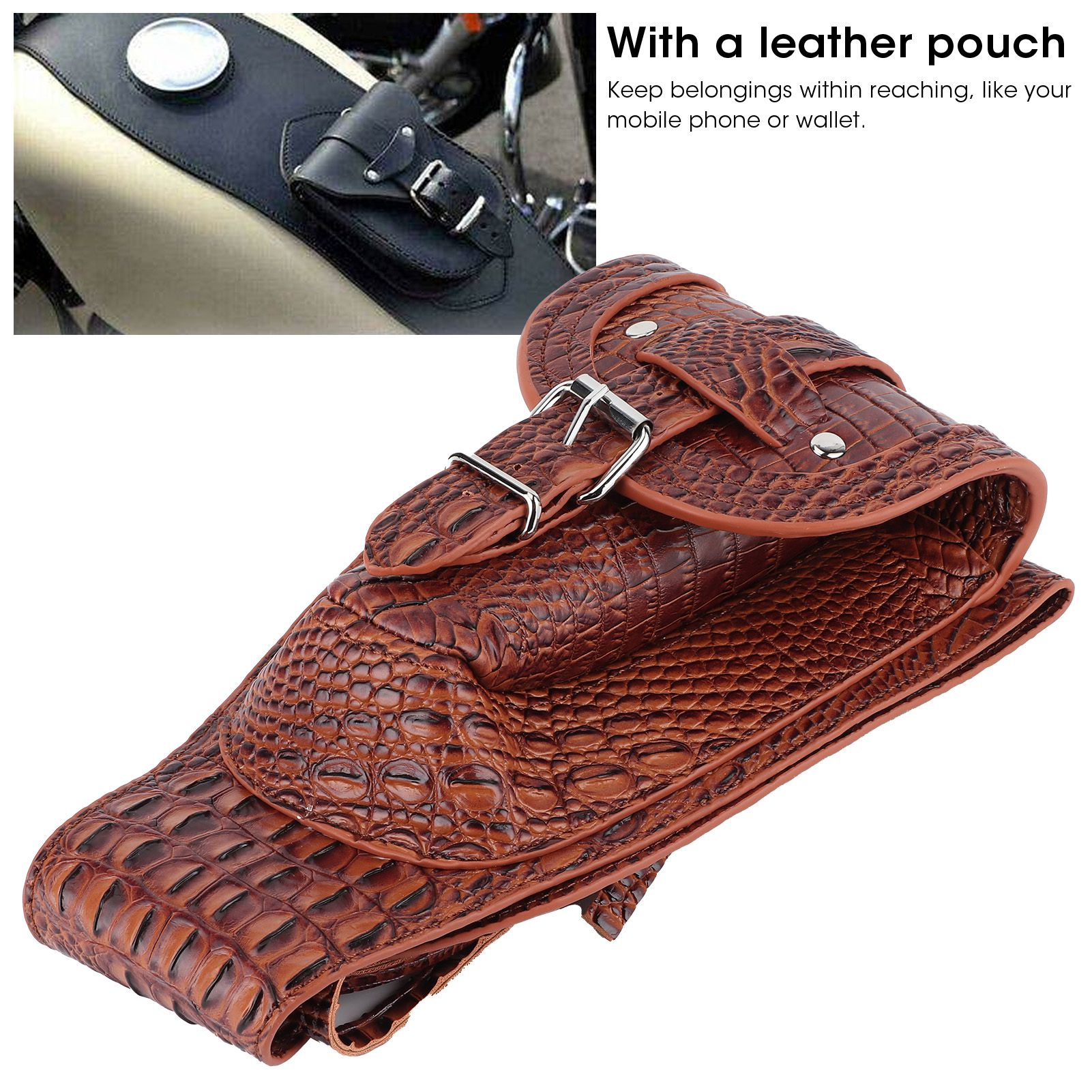1、Easy to install with two PU leather mounting straps (included) guarantees a perfect fit. 2、High quality PU leather, firm, durable, soft‑backed to protect your motorcycle's paint. 3、With a leather pouch to keep belongings within reaching, like your mobile phone or wallet. 4、Exquisite design, unique appearance, it is also a good decoration item for your motorcycle. 5、This product is specially designed for motorcycle, with unique style and exclusive addition.