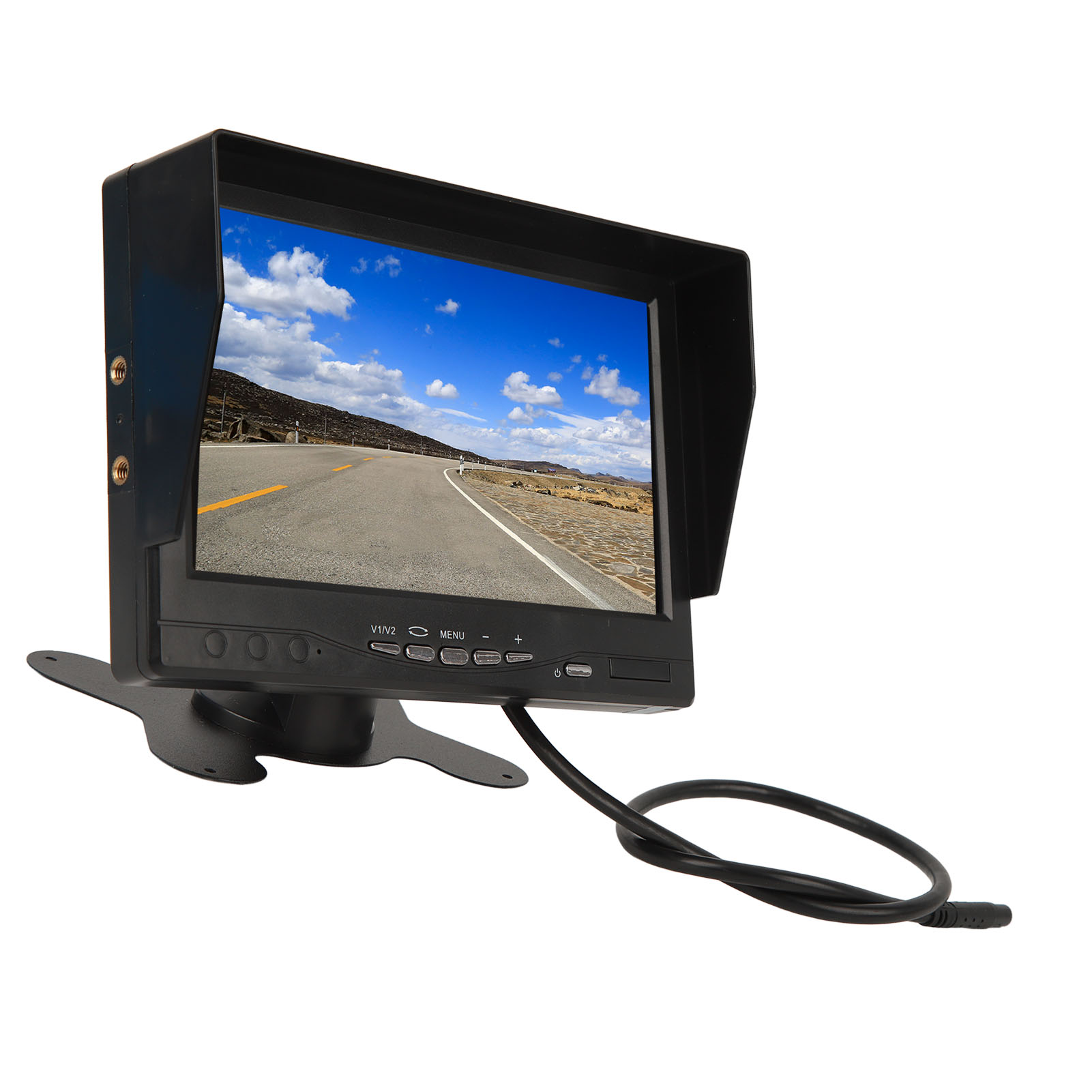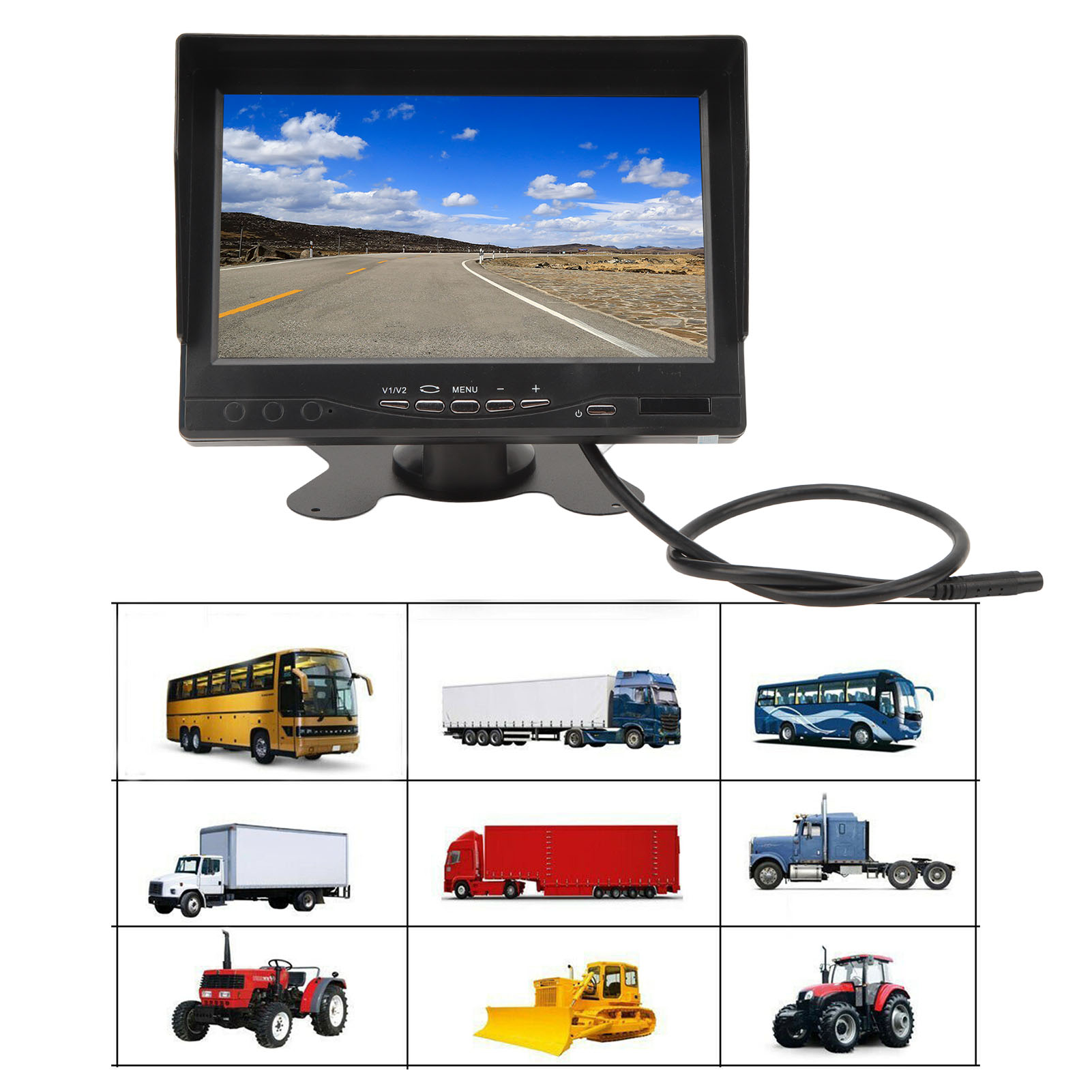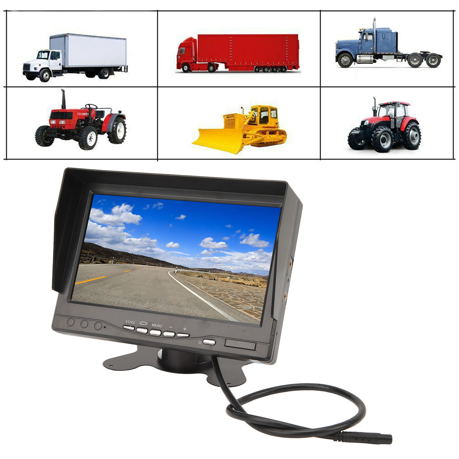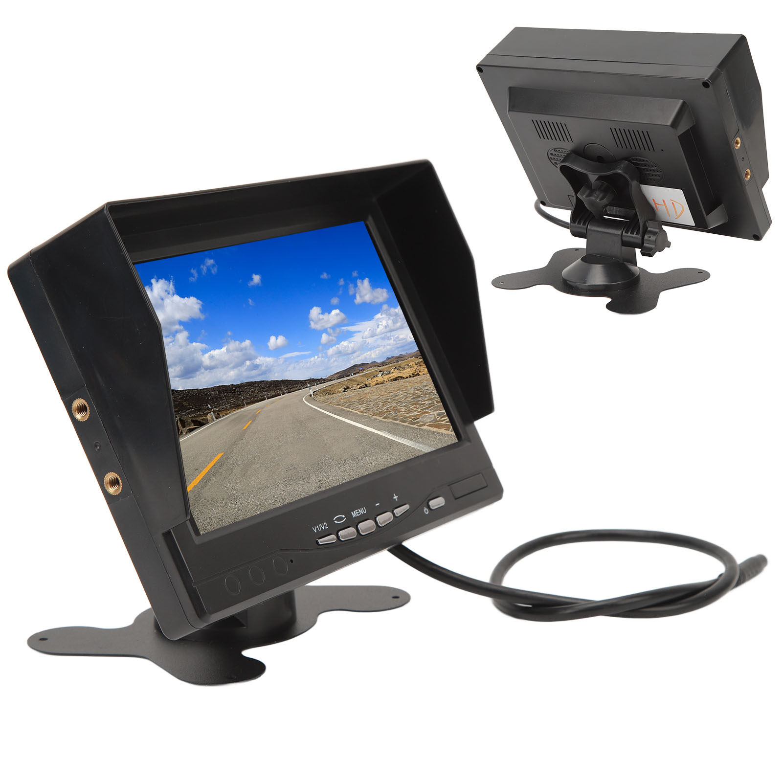 1、HD Display: The monitor adopts a 7 inch TFT LCD large screen with a display ratio of 16:9 and a resolution of 1280x600, providing clear and clean images. 2、Sun Visor Design: The screen display is equipped with a sun visor for better visibility on sunny days, bottom with stickers, 180 degree adjustable. 3、Video Input: V2 video priority display, rearview camera connected to V2, when you turn on the reverse gear and close the reverse gear, V2 will automatically turn on and off. 4、Wide Compatibility: Support car cameras, DVD, VCD, STB, satellite receivers, most TFT displays and other video devices. 5、Smart Chip: Compatible with PAL and NTSC video systems, automatically turn on the screen power when needed, prevent accidents and avoid injury to pedestrians.