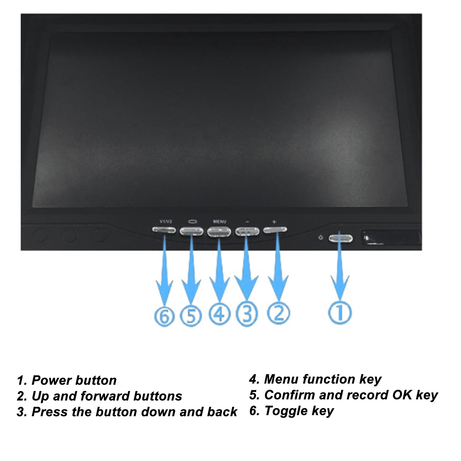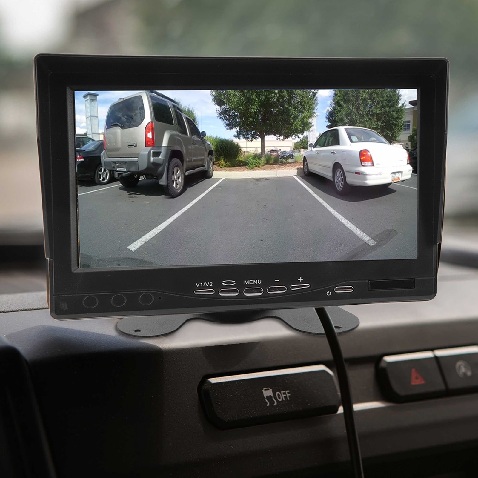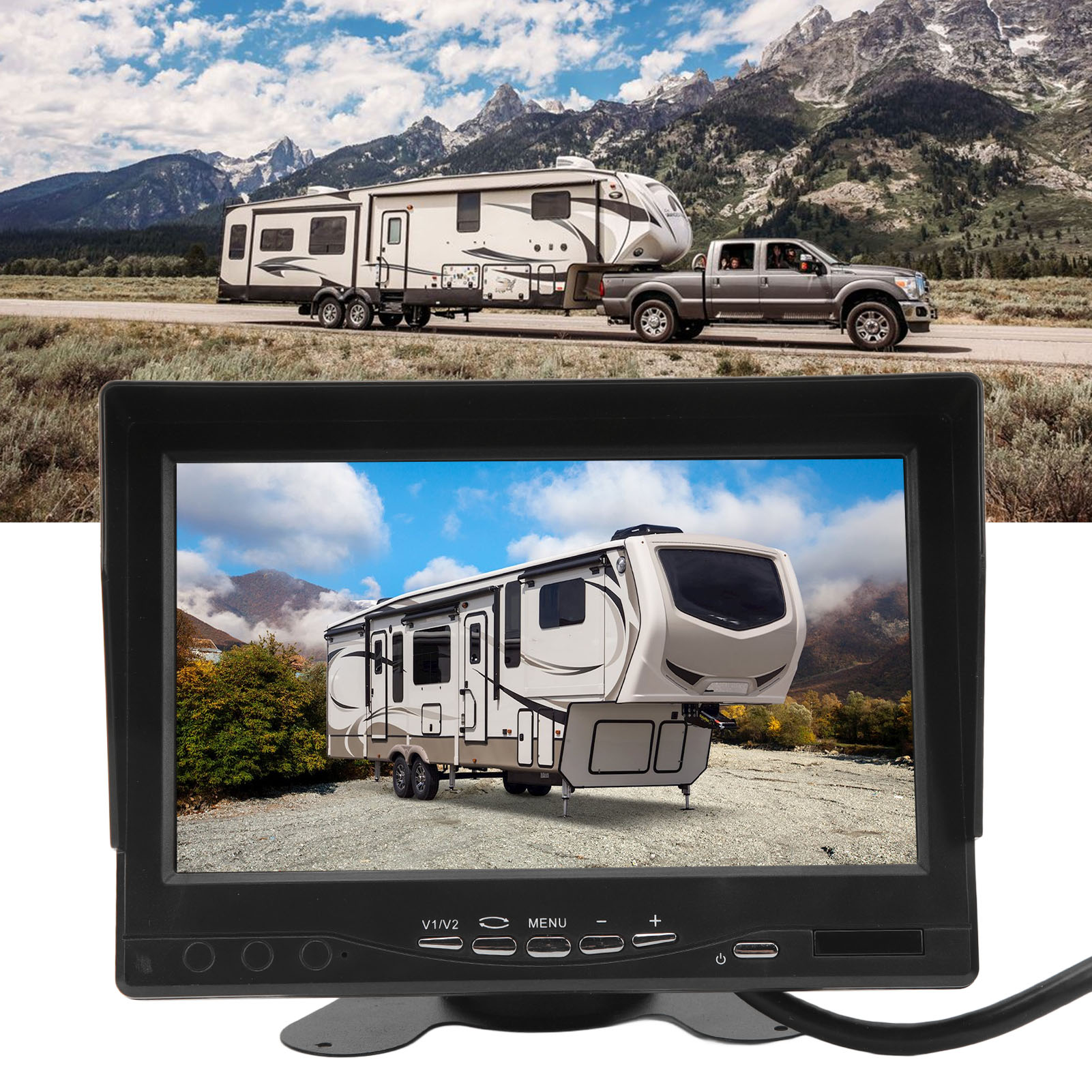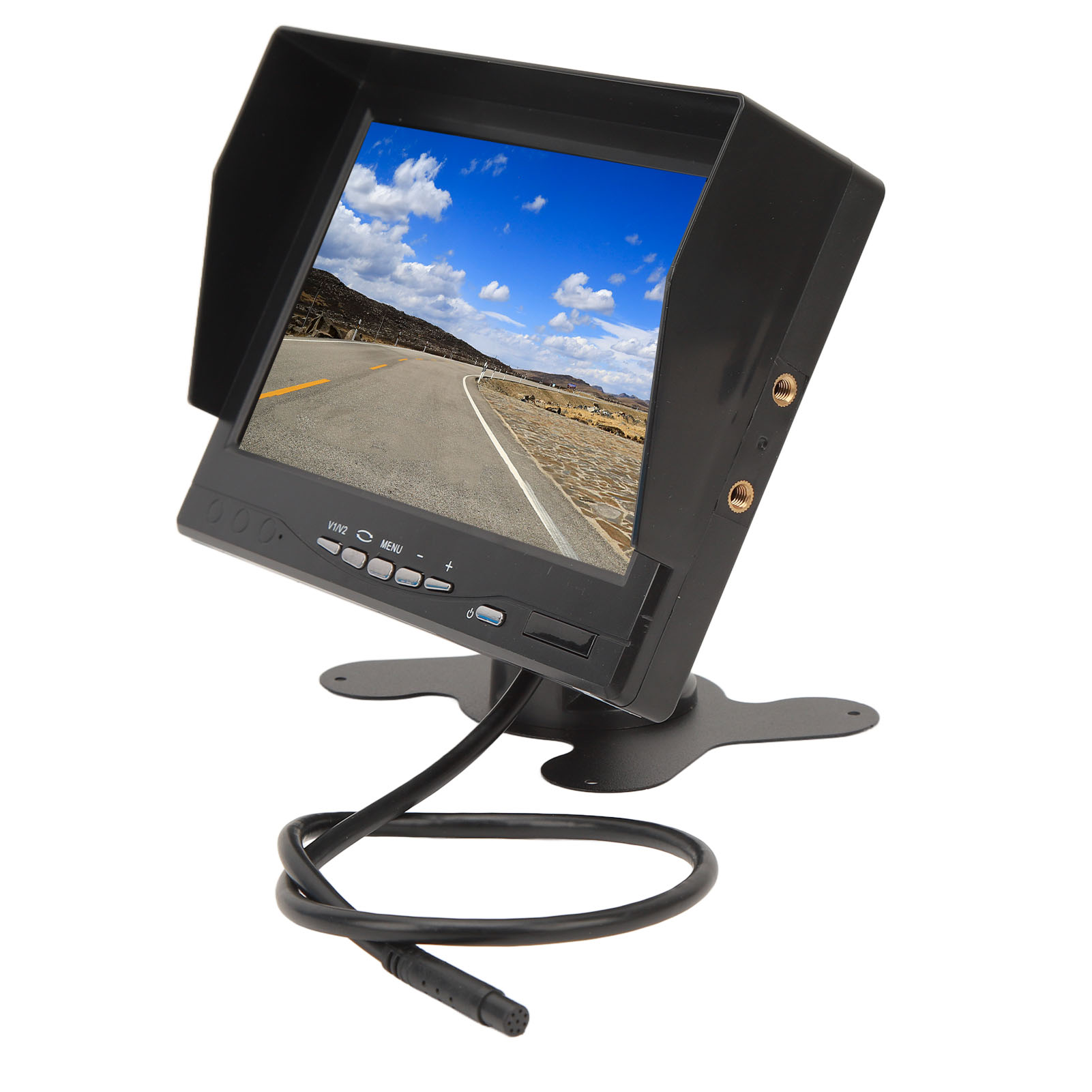 1、HD Display: The monitor adopts a 7 inch TFT LCD large screen with a display ratio of 16:9 and a resolution of 1280x600, providing clear and clean images. 2、Sun Visor Design: The screen display is equipped with a sun visor for better visibility on sunny days, bottom with stickers, 180 degree adjustable. 3、Video Input: V2 video priority display, rearview camera connected to V2, when you turn on the reverse gear and close the reverse gear, V2 will automatically turn on and off. 4、Wide Compatibility: Support car cameras, DVD, VCD, STB, satellite receivers, most TFT displays and other video devices. 5、Smart Chip: Compatible with PAL and NTSC video systems, automatically turn on the screen power when needed, prevent accidents and avoid injury to pedestrians.