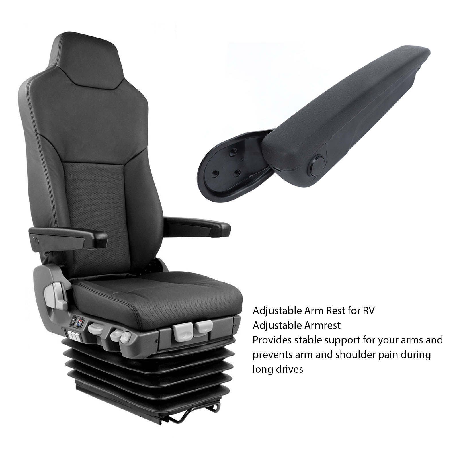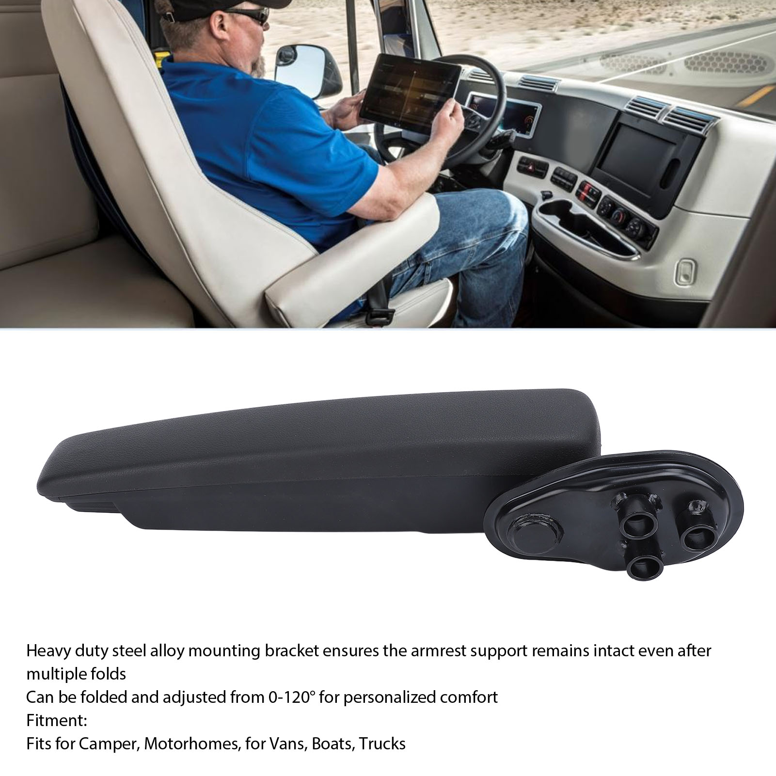 1、Adjustable Armrest: Provides stable support for your arms and prevents arm and shoulder pain during long drives. Foldable design saves space when not in use. 2、Comfortable Touch: Synthetic leather covering on sponge filled armrest provides a comfortable touch. Anti slip texture prevents arms from slipping. 3、Solid Support: The arm rest is designed with heavy duty steel alloy mounting bracket ensures the armrest support remains intact even after multiple folds. 4、Relief for Extended Driving: The armrest provides stable support for your arm, helping to alleviate arm and shoulder pain during long drives. 5、Adjustable Angle: The armrest can be folded and adjusted from 0‑120° for personalized comfort, making it suitable for Car, RV, Van, Truck, Boat, and more.