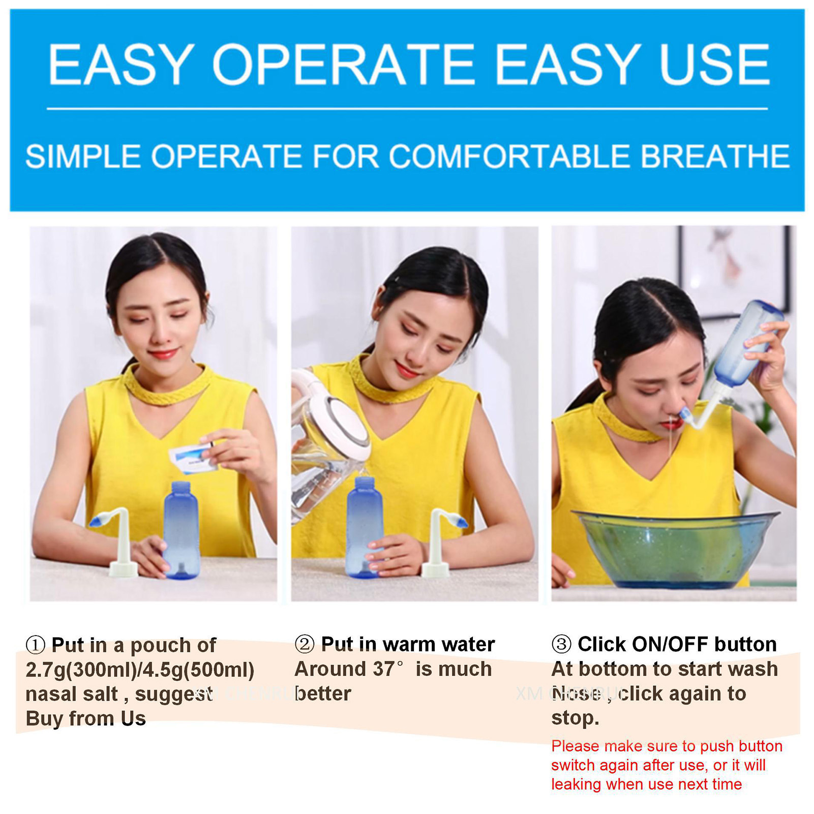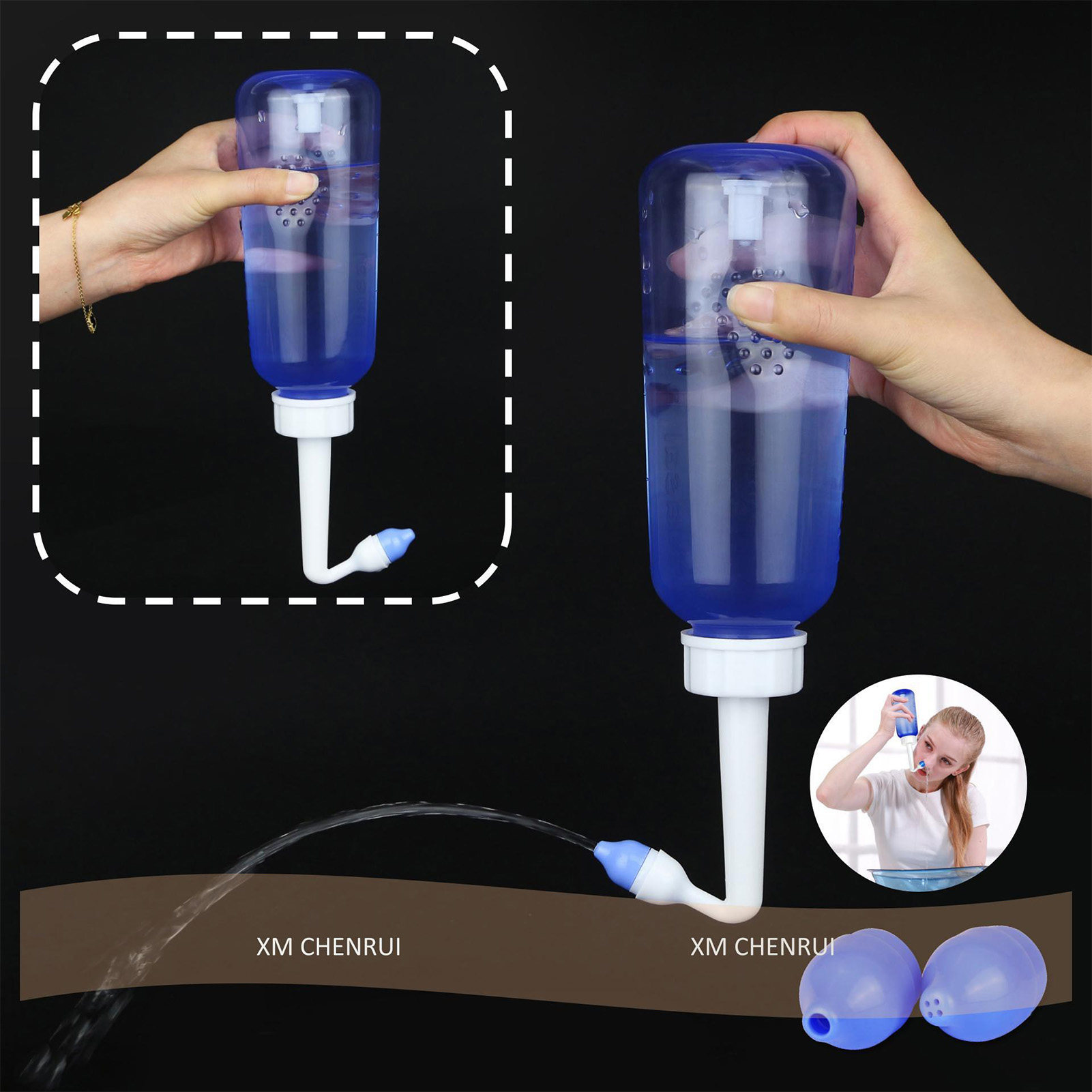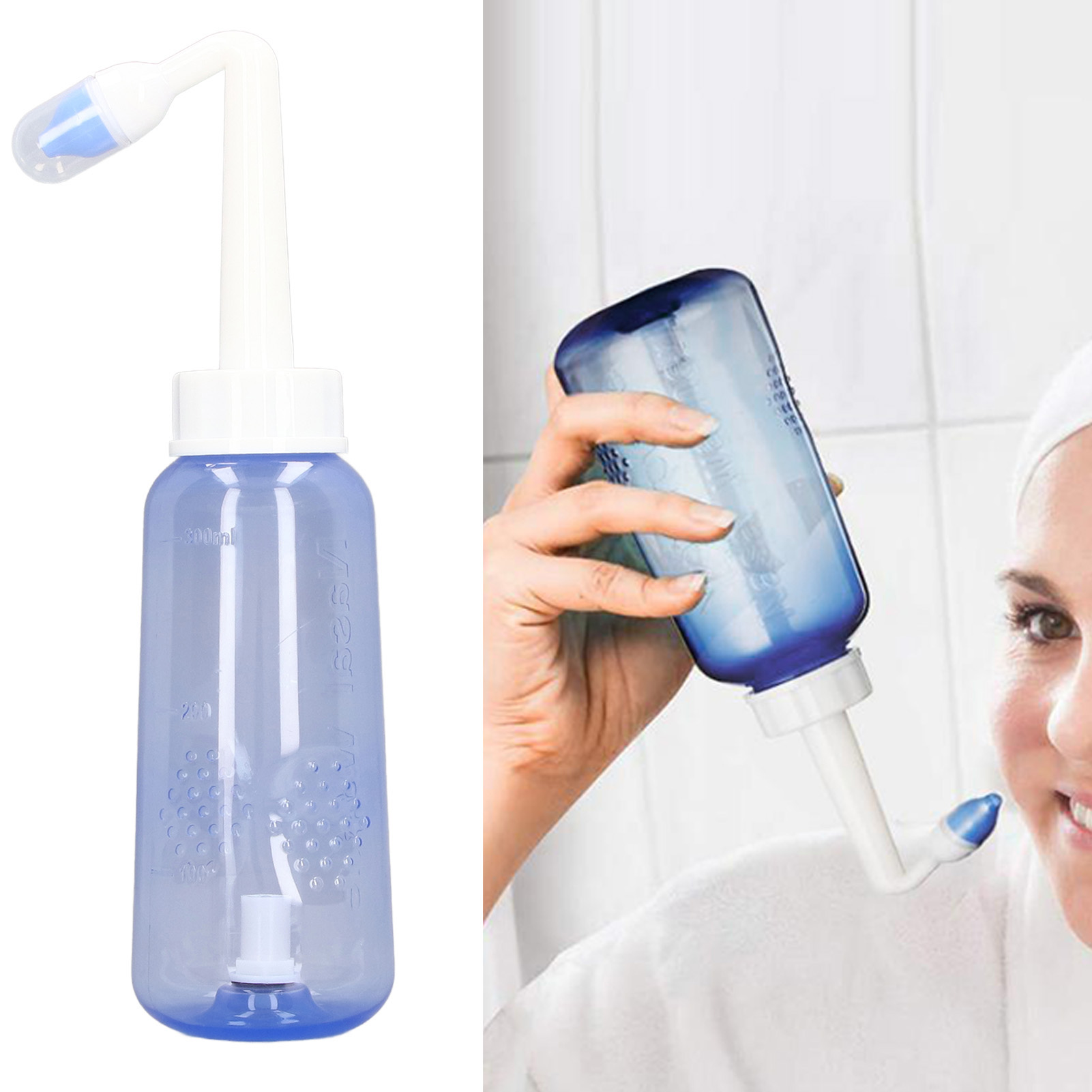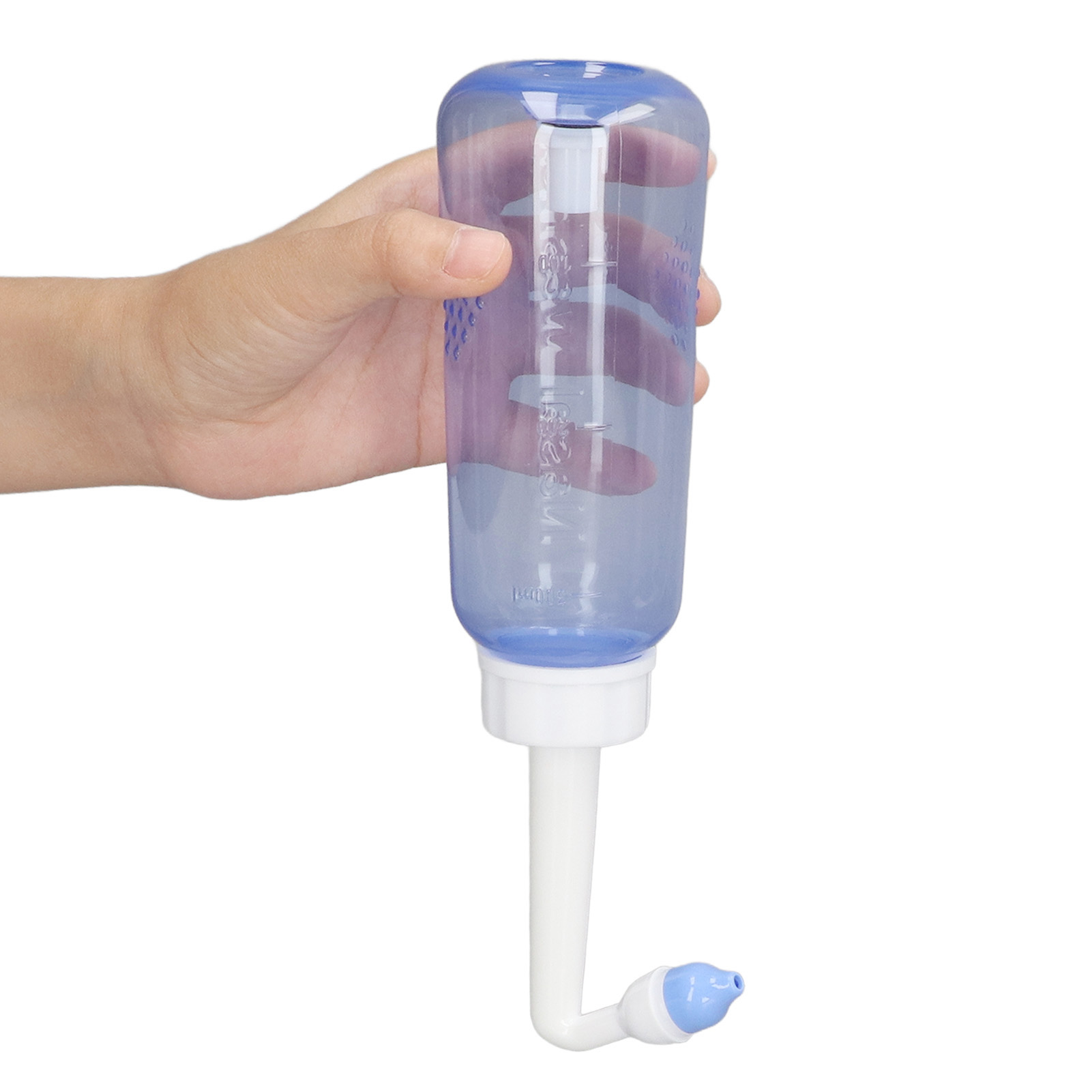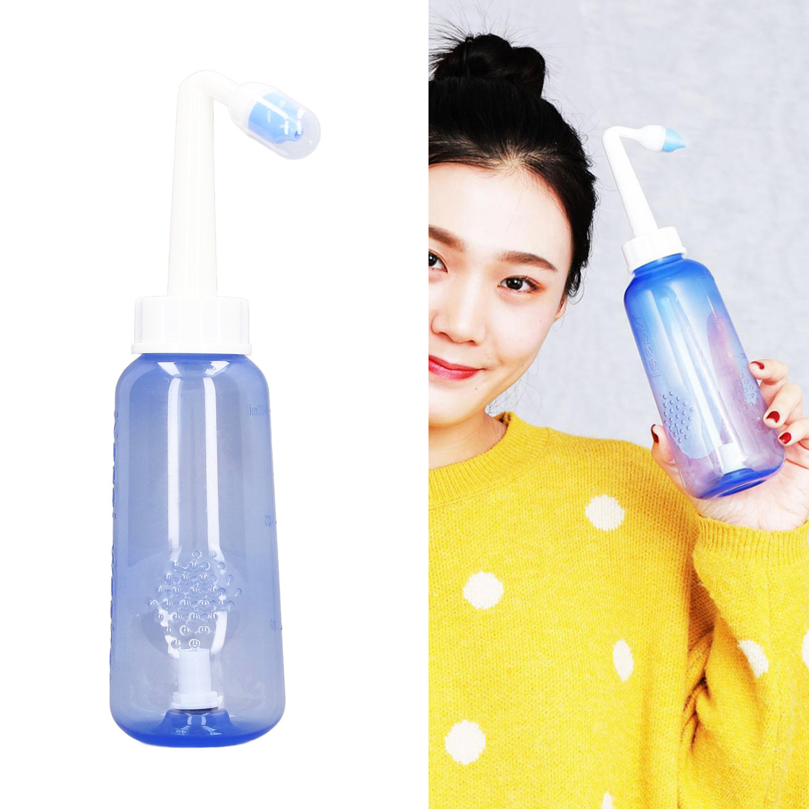 1、Practical: Gently irrigating nasal passages and sinus rinse out mucus and various irritants. 300ml capacity is enough to clean your nose well and help you breathe better. 2、Operation: Adopts special locking switch design, simply turn the bottle upside down and press the button, and then press it to stop water flow, more convenient and fast. 3、Soothing Stream: The stream of the bottle gently flows through the nostrils. It's not trying to force water through your congestion, hydrating and soothing. 4、Ergonomic Design: This nasal rinse bottle with non slip particle design, making nasal flushing easier and more comfortable. Warm water to rinse the nasal cavity is more comfortable. 5、Two Nozzles: This sinus rinse come with 2pcs nozzles. 1 hole nozzle is for adult, the other with 4 holes to make the flow more slow to adapt child's needs. Ideal for family or individual daily nasal care.