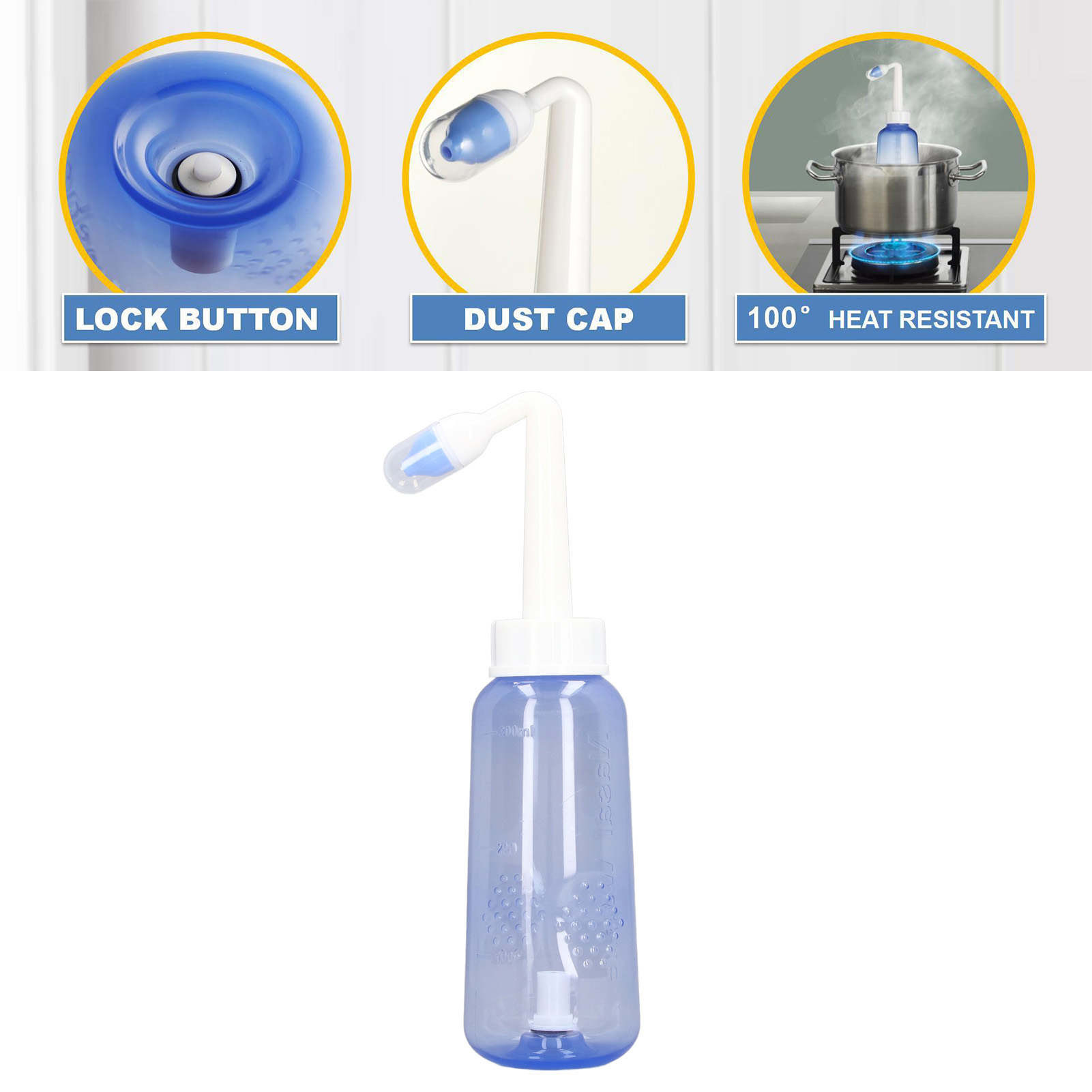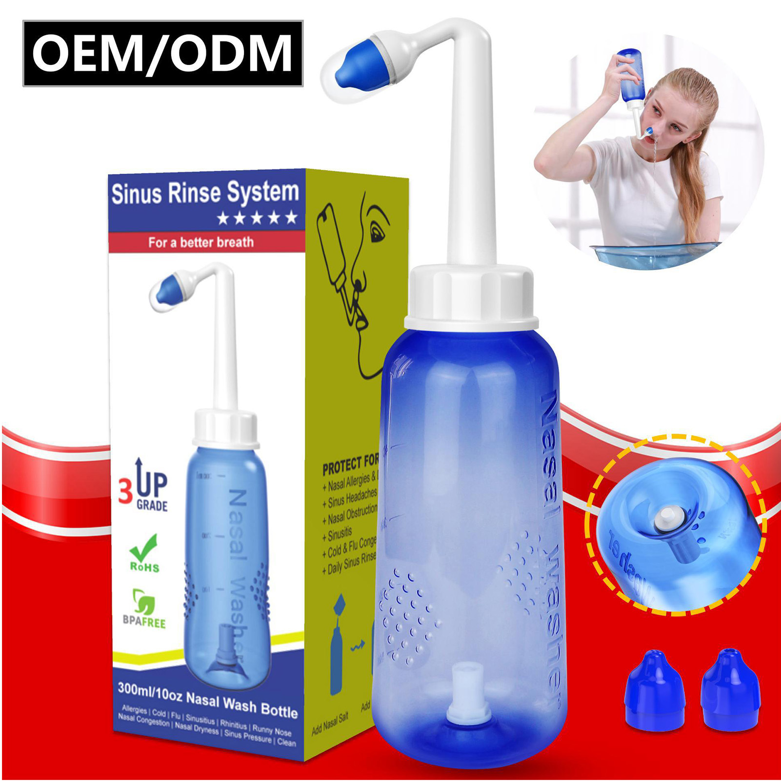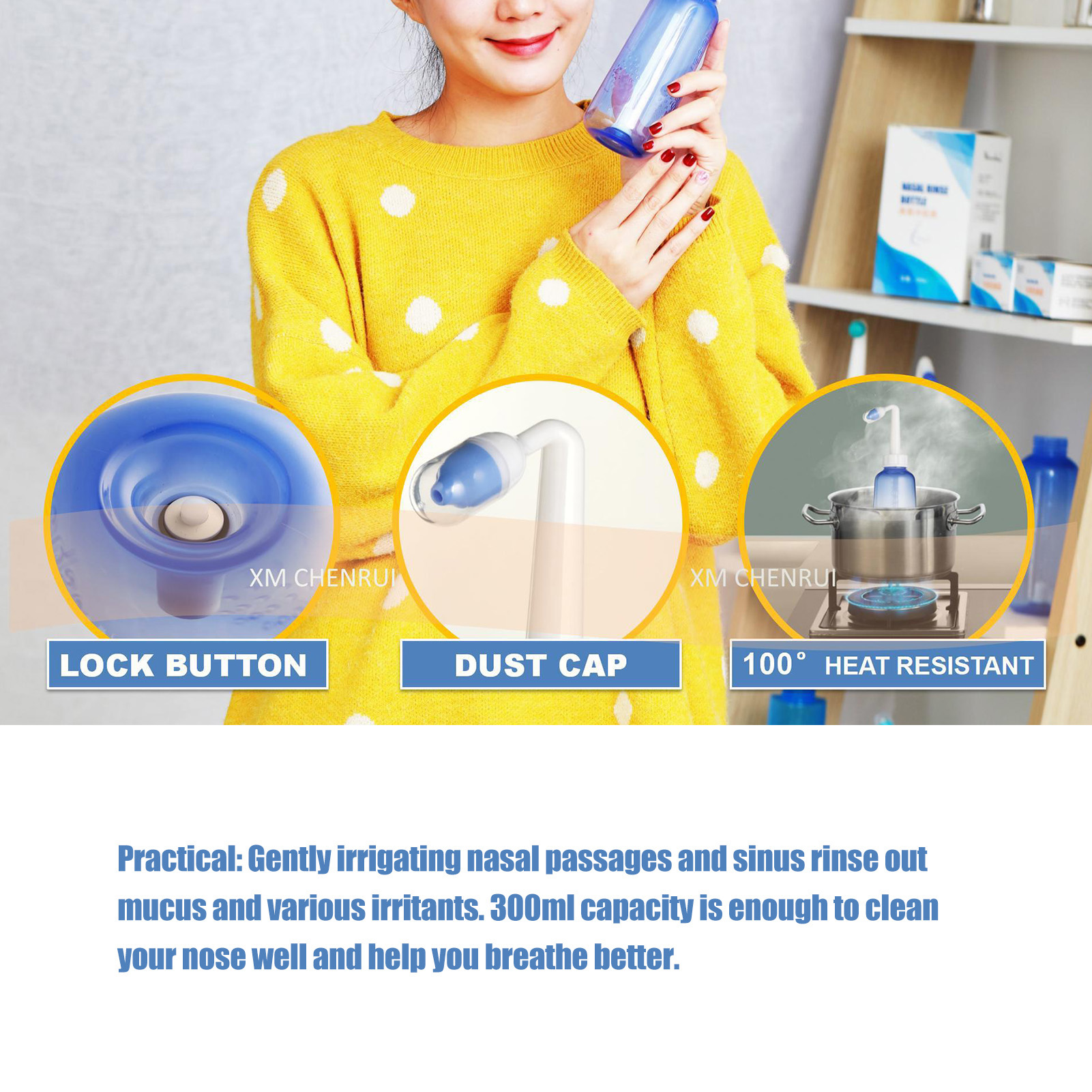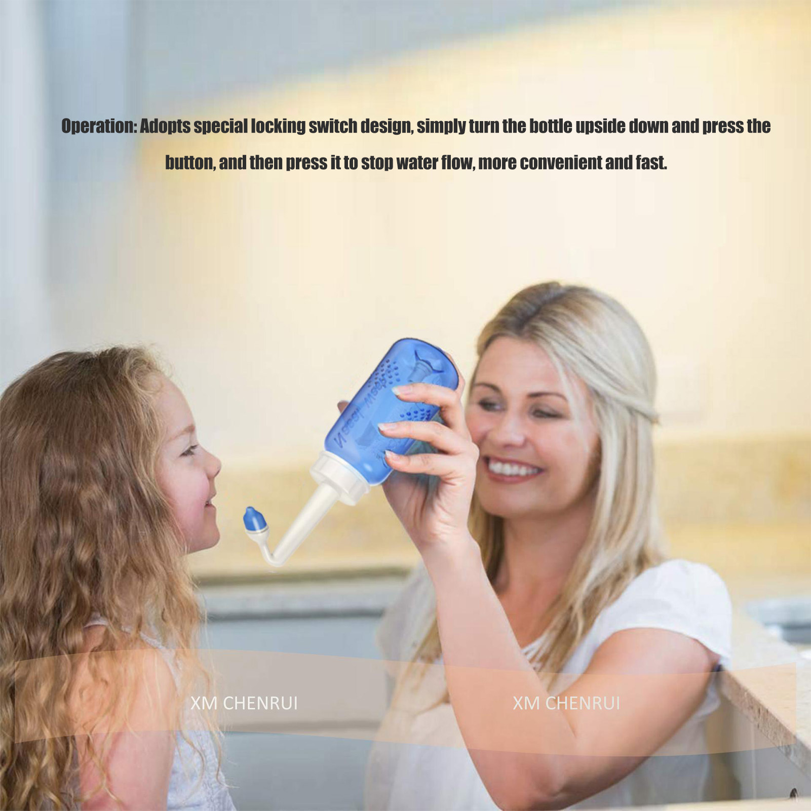 1、Practical: Gently irrigating nasal passages and sinus rinse out mucus and various irritants. 300ml capacity is enough to clean your nose well and help you breathe better. 2、Operation: Adopts special locking switch design, simply turn the bottle upside down and press the button, and then press it to stop water flow, more convenient and fast. 3、Soothing Stream: The stream of the bottle gently flows through the nostrils. It's not trying to force water through your congestion, hydrating and soothing. 4、Ergonomic Design: This nasal rinse bottle with non slip particle design, making nasal flushing easier and more comfortable. Warm water to rinse the nasal cavity is more comfortable. 5、Two Nozzles: This sinus rinse come with 2pcs nozzles. 1 hole nozzle is for adult, the other with 4 holes to make the flow more slow to adapt child's needs. Ideal for family or individual daily nasal care.